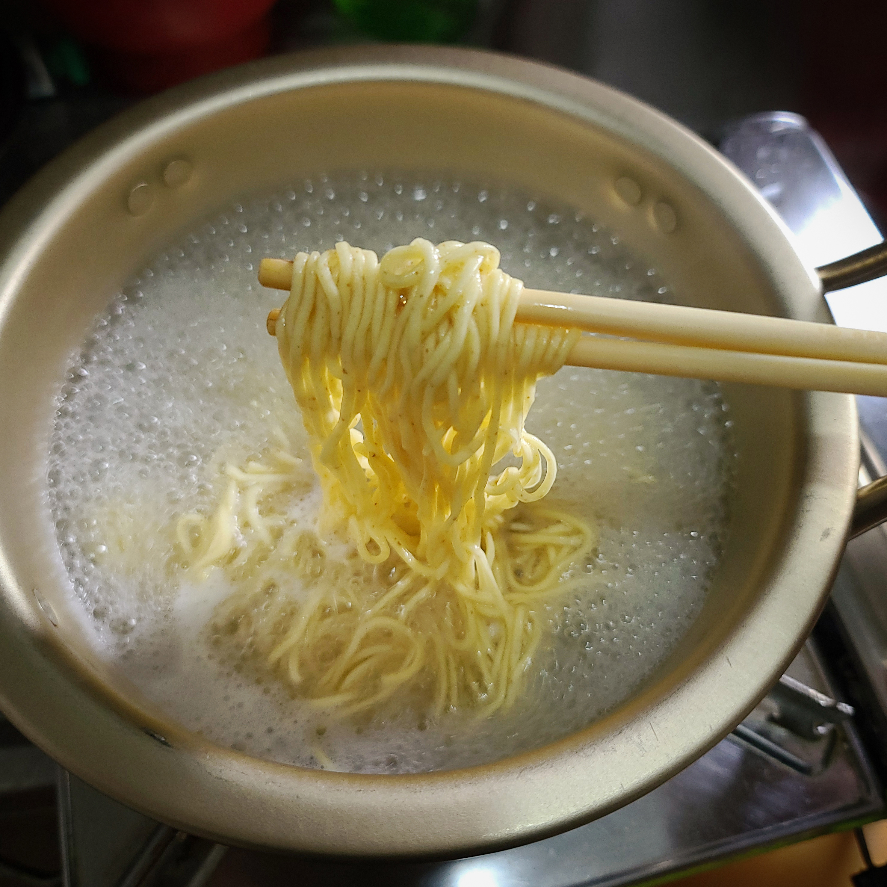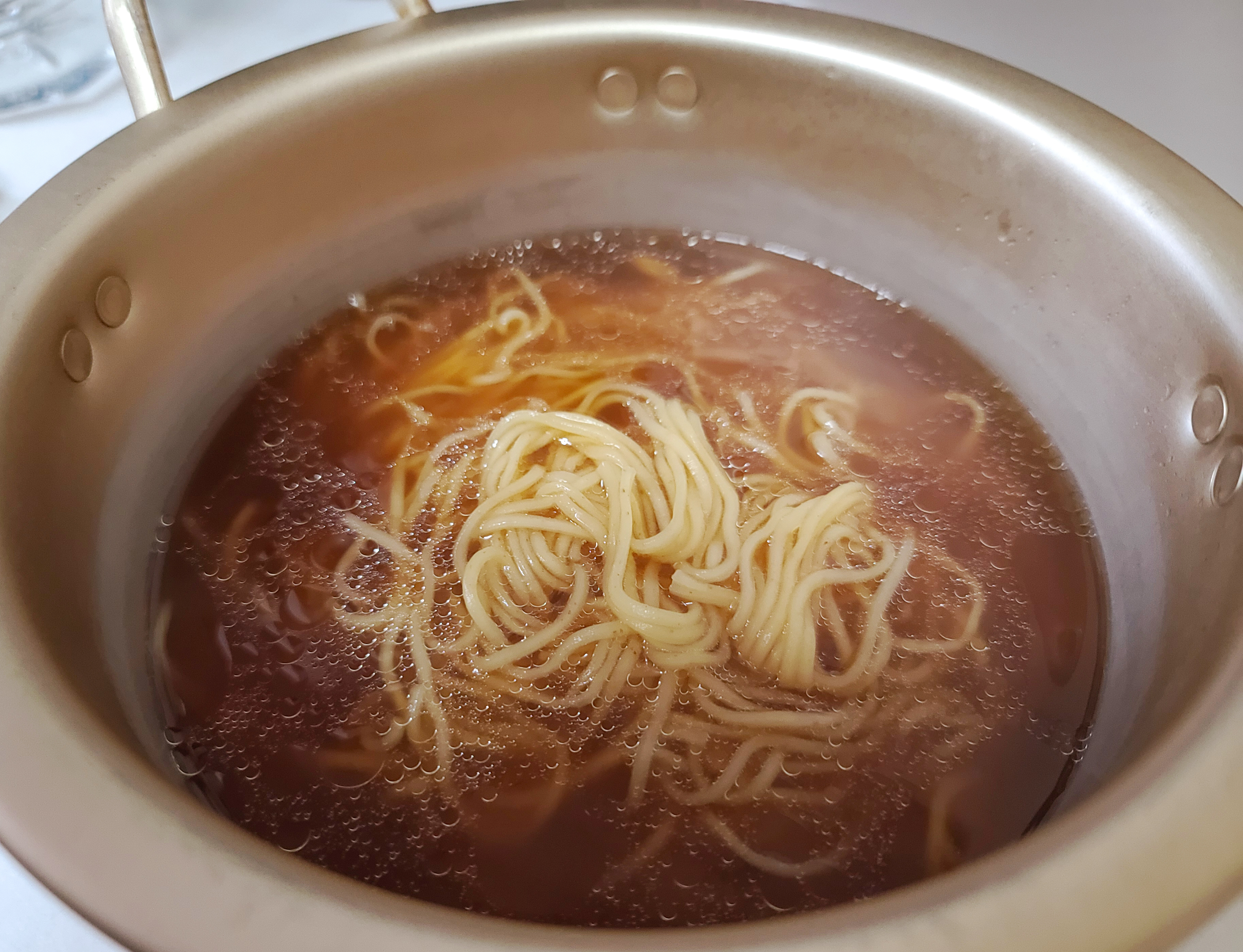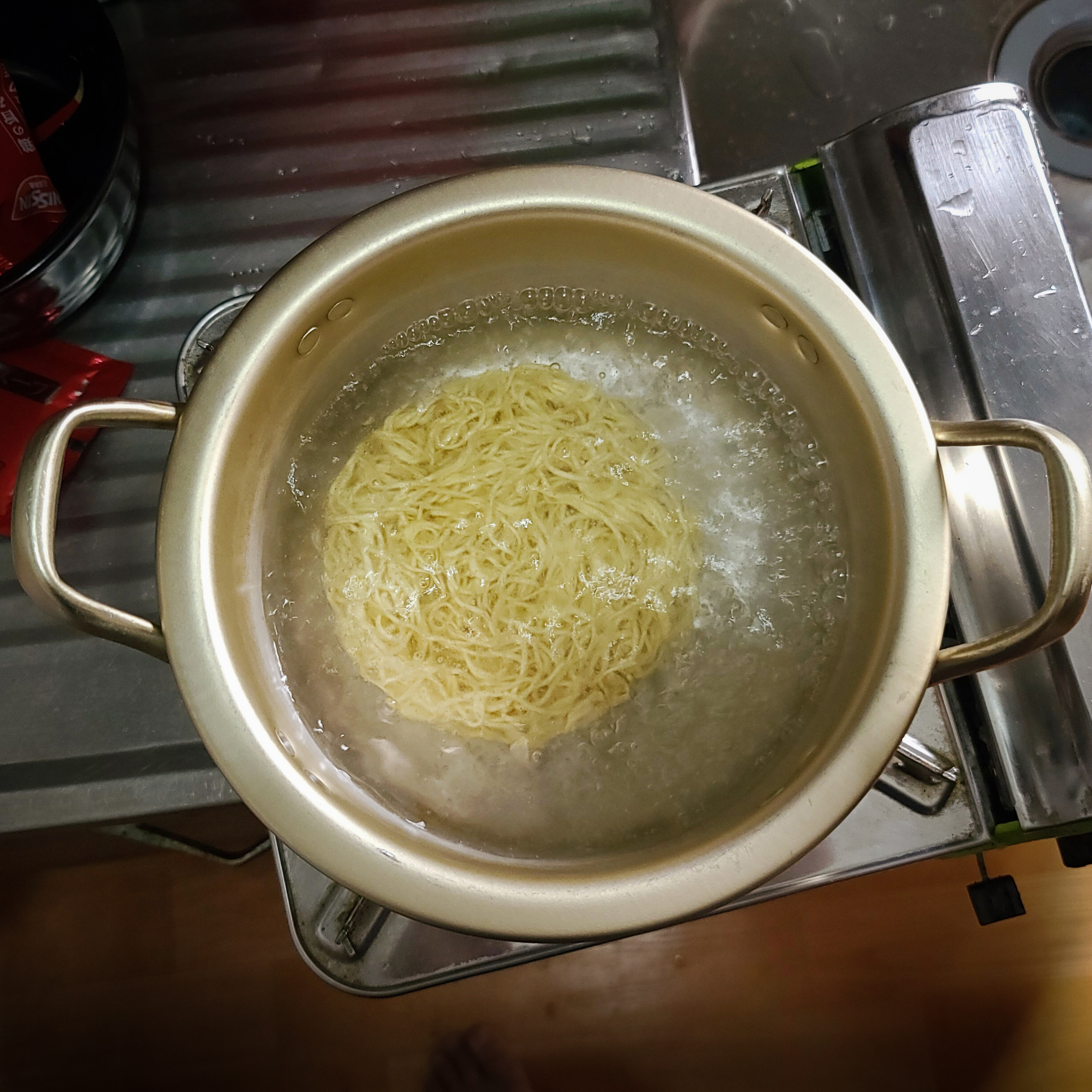 라면 물이 끓으면 면을 넣고 약 3분간 보글보글 끓여줍니다. 앞서 말씀드린 것처럼 면은 일본 라멘집에서 보는 것 같은 풀어지는 생면 느낌의 면이었습니다.