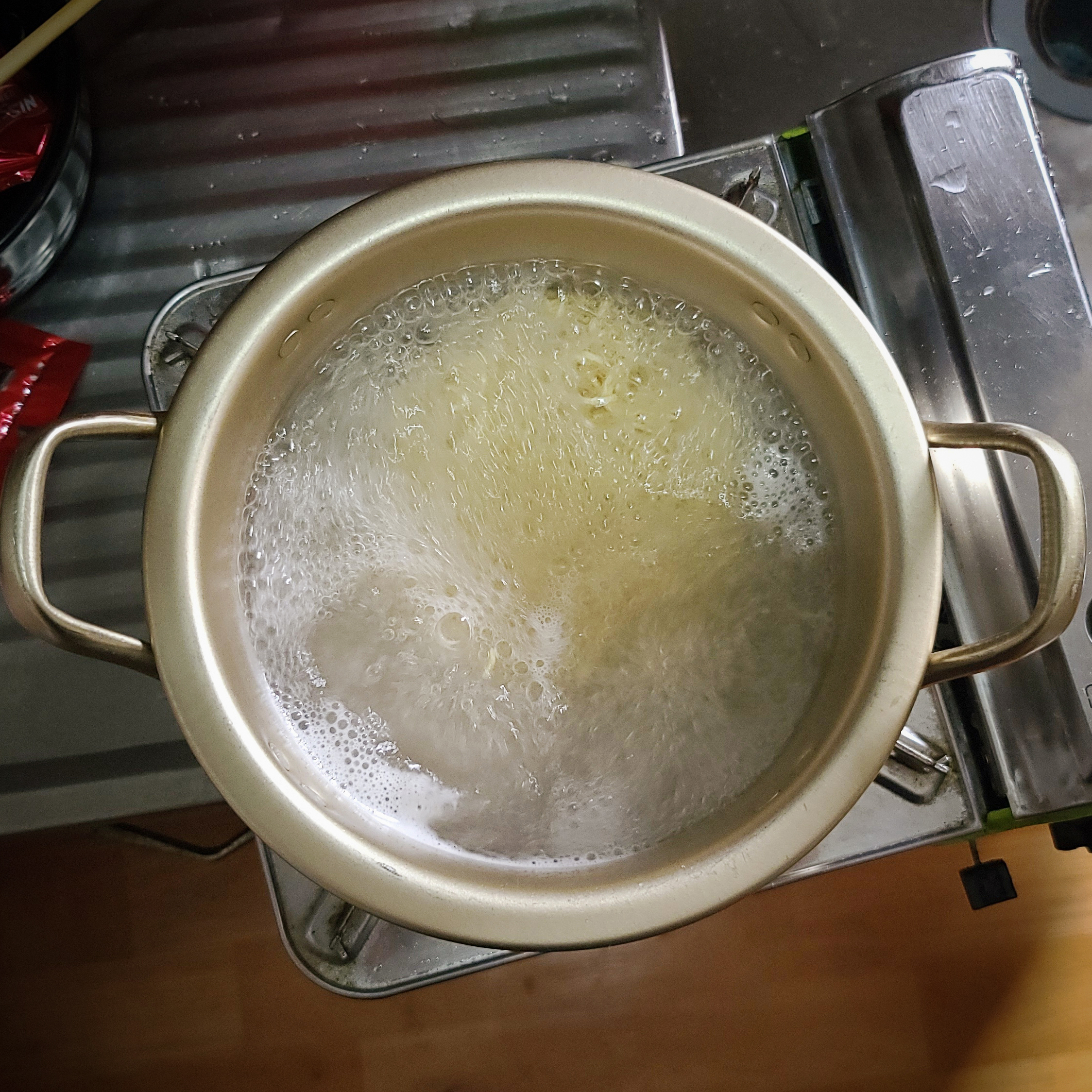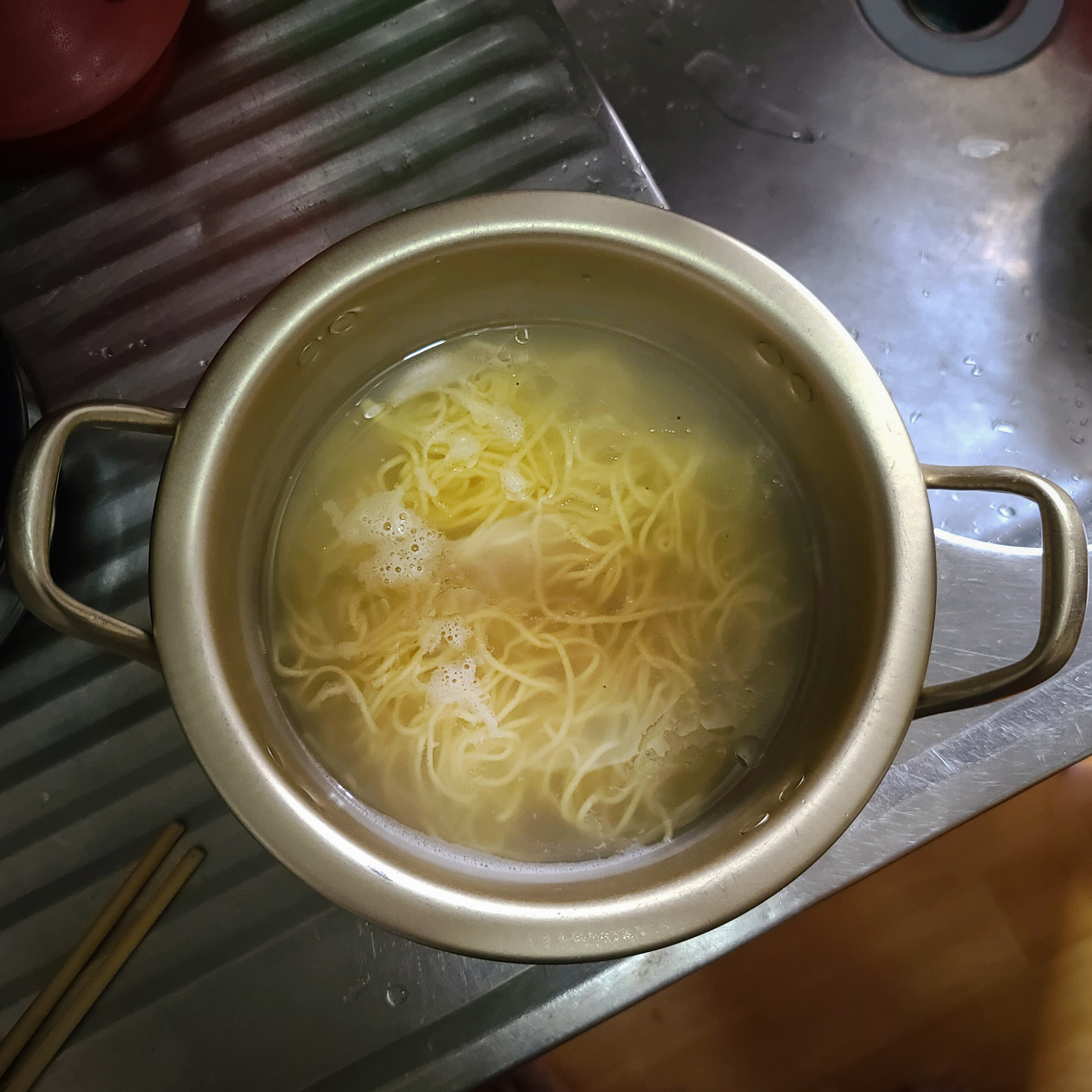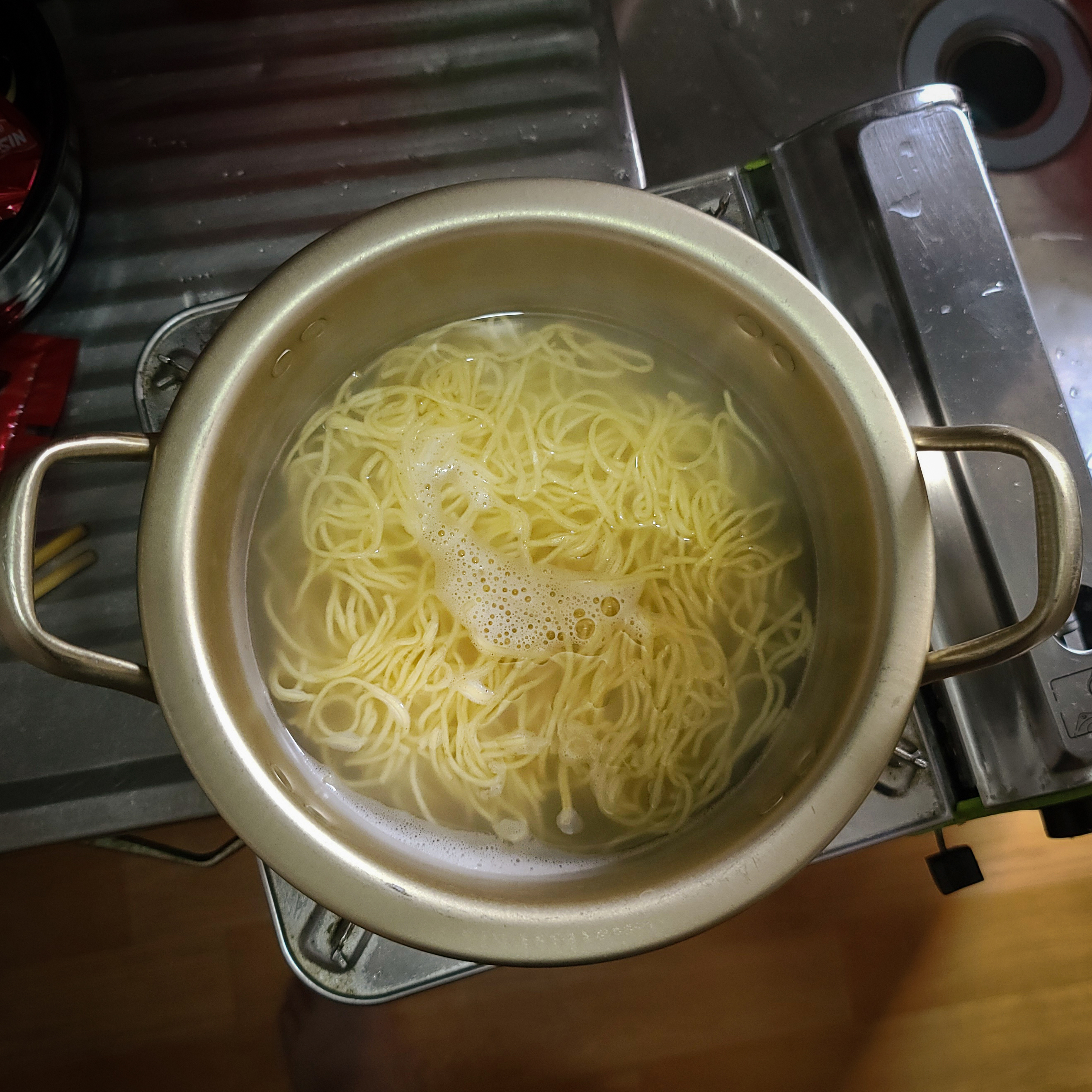 라면 물이 끓으면 면을 넣고 약 3분간 보글보글 끓여줍니다. 앞서 말씀드린 것처럼 면은 일본 라멘집에서 보는 것 같은 풀어지는 생면 느낌의 면이었습니다.