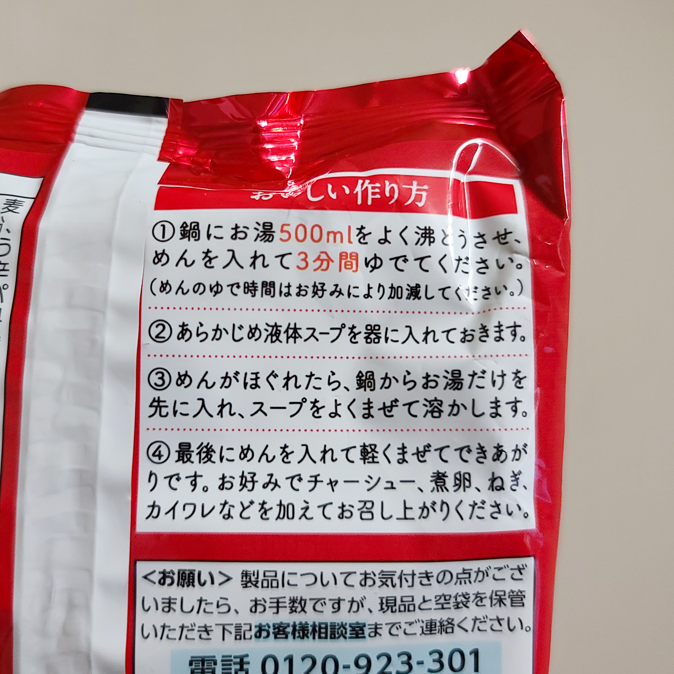 조리방법은 ➊ 500ml 물에 면을 3분간 삶아줍니다. ➋ 액체 스프를 그릇에 미리 넣어둡니다. ➌ 면을 삶은 뒤 물을 먼저 그릇에 부어 섞어준 다음, ➍ 면과 차슈, 삶은 계란, 파 등의 고명을 얹어먹으라고 합니다. 하지만 저는 간편하게 먹기 위해 조금 다른 방법으로 먹었습니다.