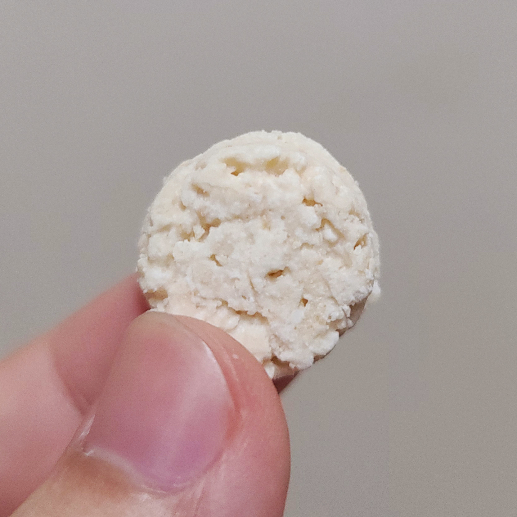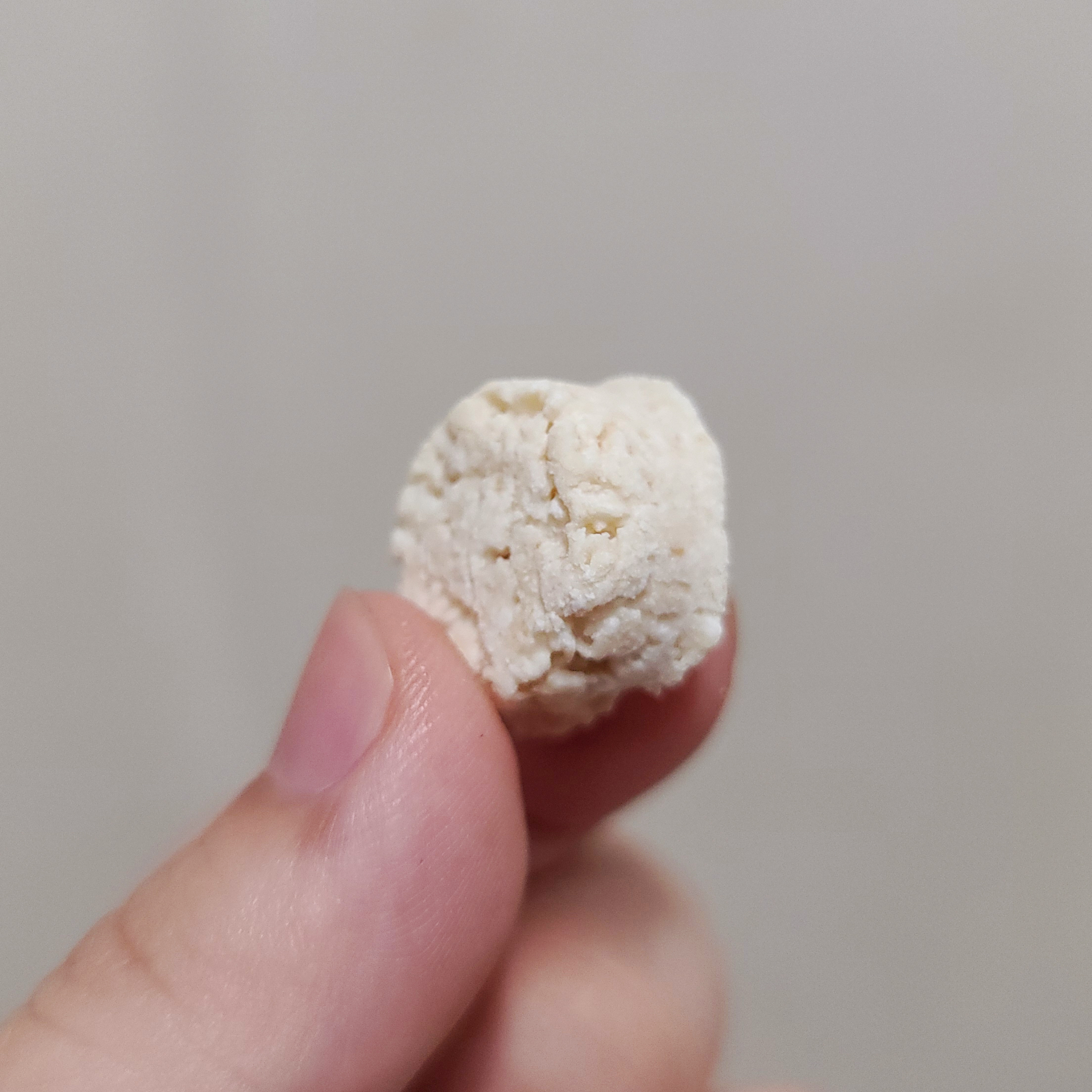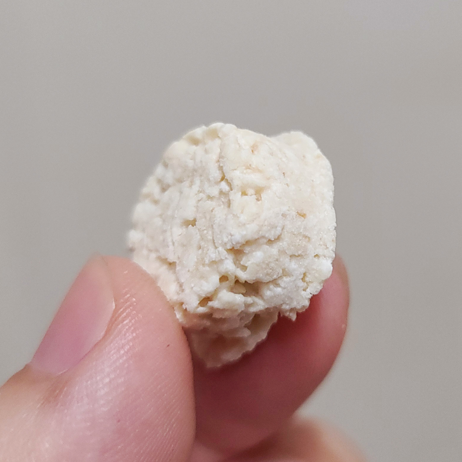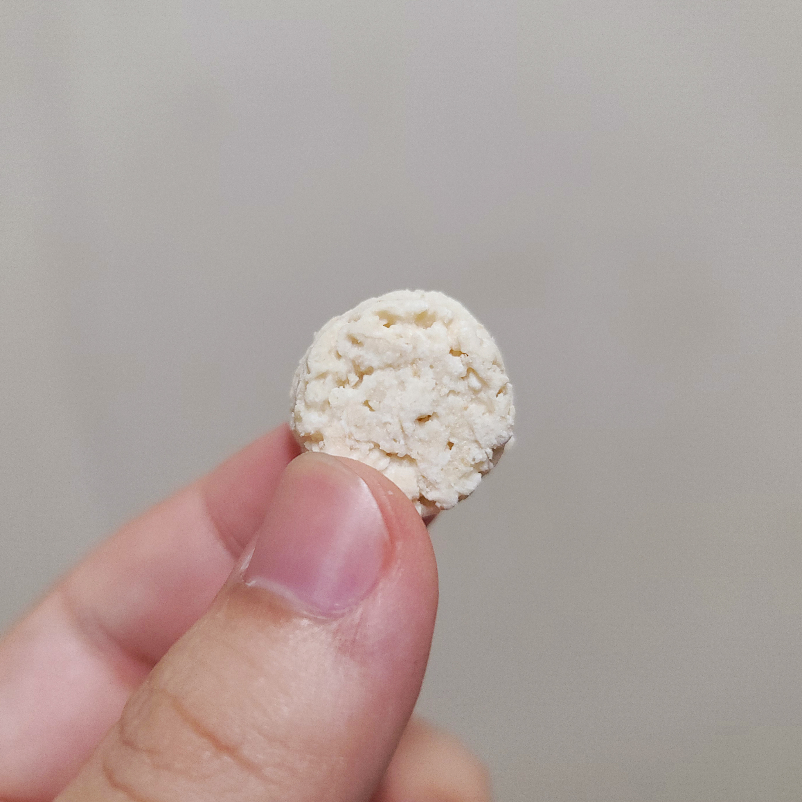 오트밀 미니바이트의 크기는 대략 이렇습니다. 모양은 쫄병스낵 모습과 비슷하게 생겼고, 흰색으로 한 입에 먹기 좋은 크기였습니다. 오트밀 미니바이트는 우유의 달콤한 맛과 귀리의 고소한 맛과 식감이 잘 어울려 자꾸만 손이 가게 되는 마성의 과자였습니다.