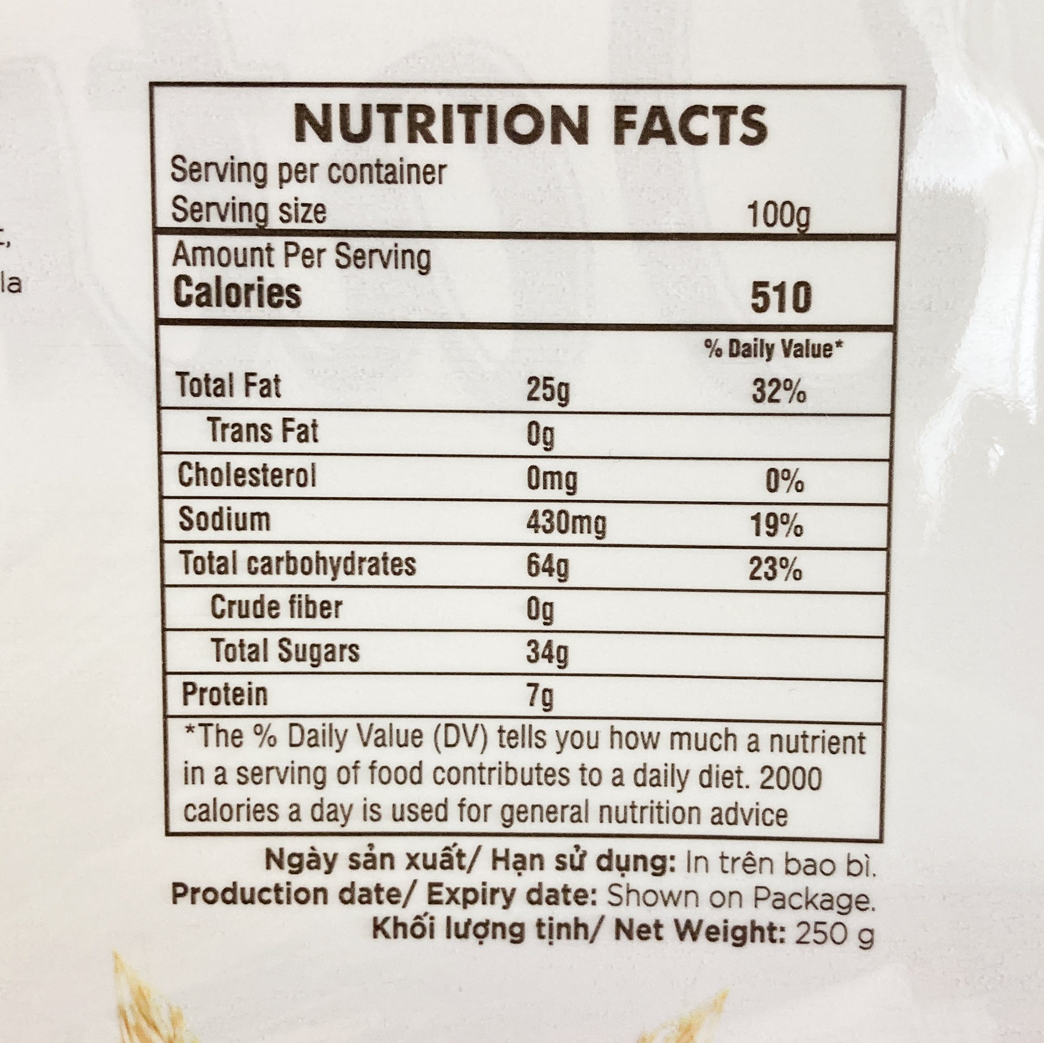 오트밀 미니바이트의 한글로 된 영양성분표와 원재료 표기를 살펴보겠습니다. 오트밀 미니바이트는 귀리 분말과 우유분말 등이 함유되어 있어 달달하면서 오트밀 특유의 고소한 특징을 지닌 과자입니다. 베트남이 원산지이며, 250g 1 봉지의 총열량은 1,279kcal 였습니다.