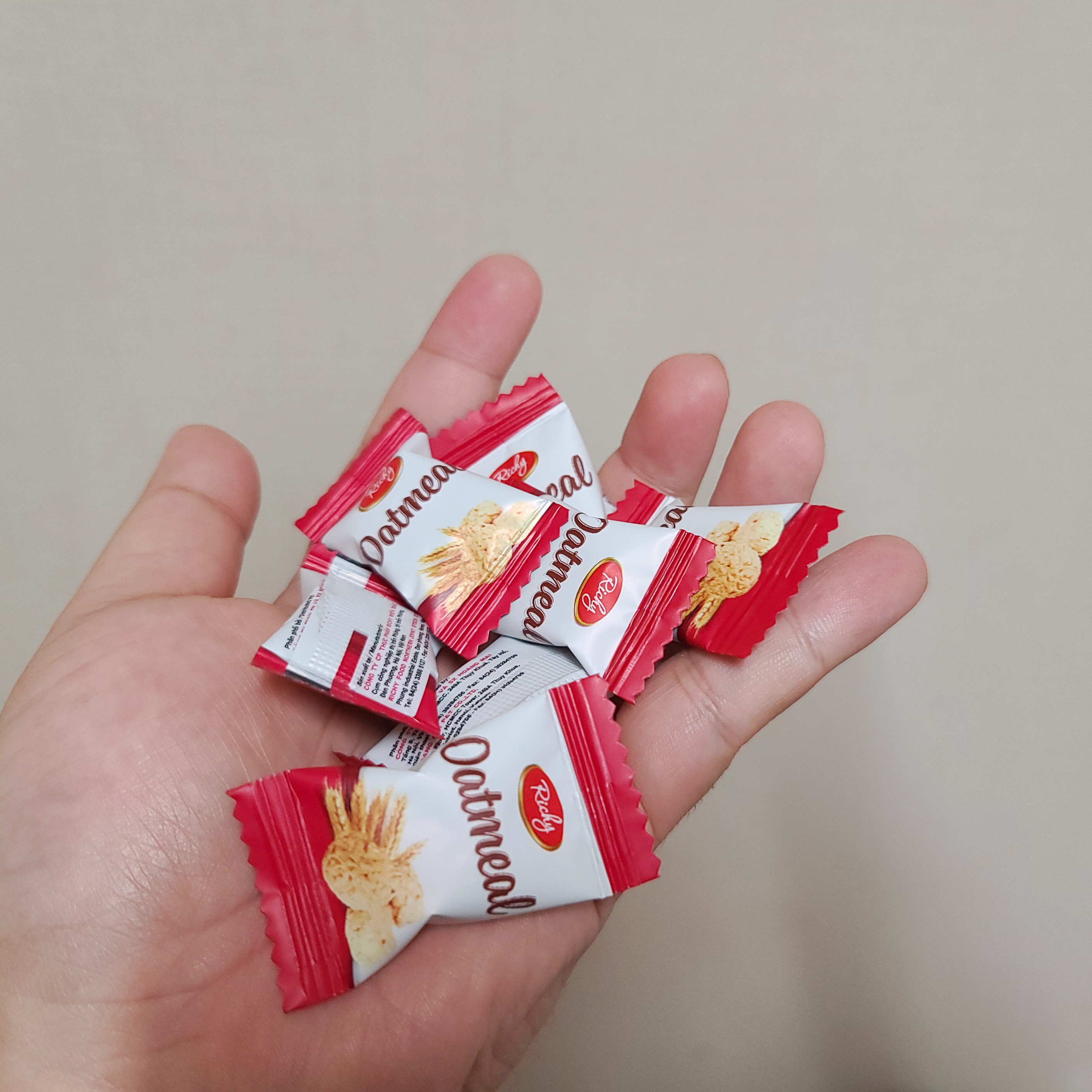 리치 오트밀 미니바이트의 모습은 이렇게 생겼습니다. 캔디처럼 낱개로 포장되어 있어서 간편하게 먹기 좋았고, 제품 겉면에는 오트밀 미니바이트의 모습이 그려 있었습니다. 한 번 먹을때 한 줌씩은 먹어줘야죠~(ㅋㅋ)
