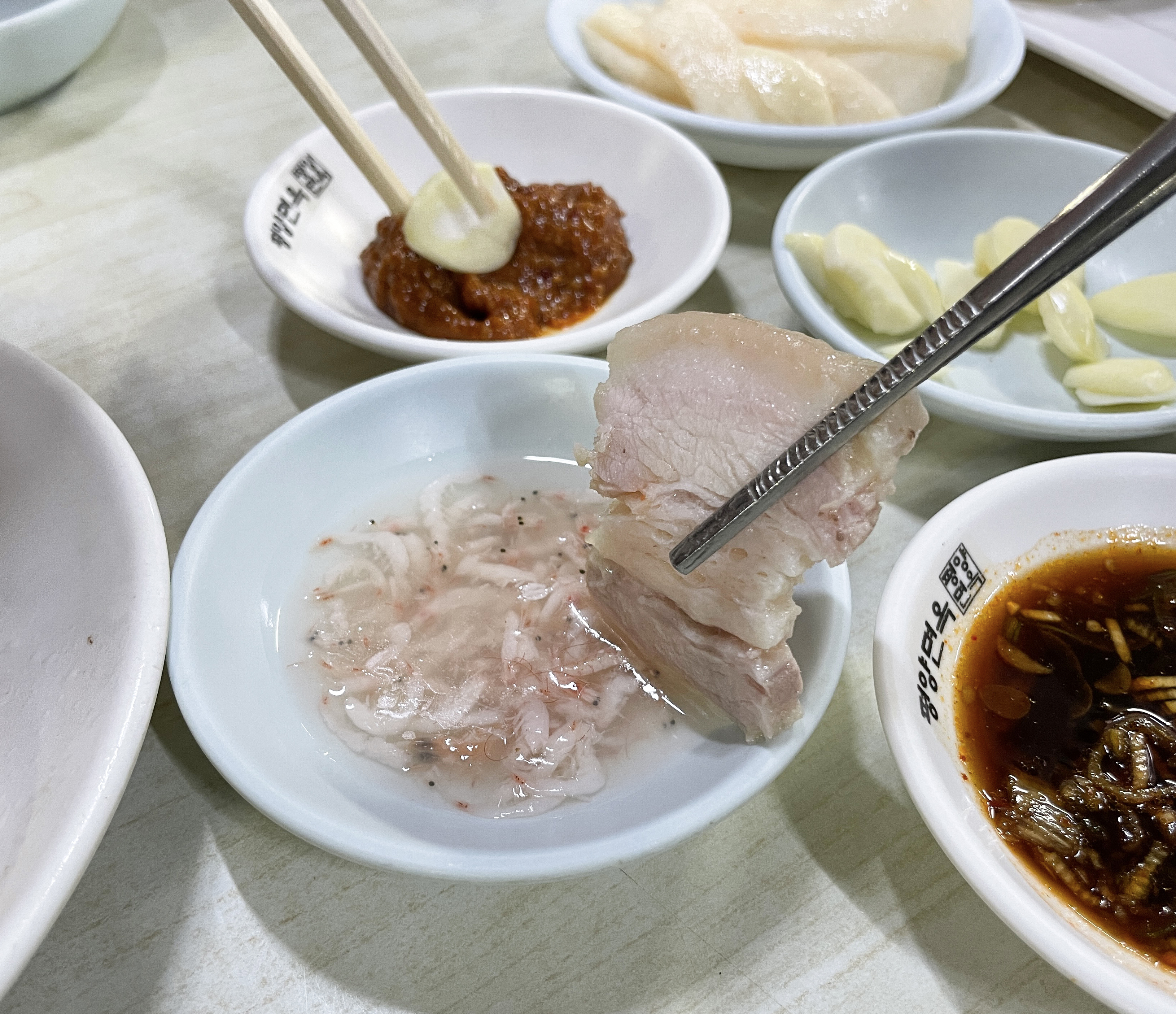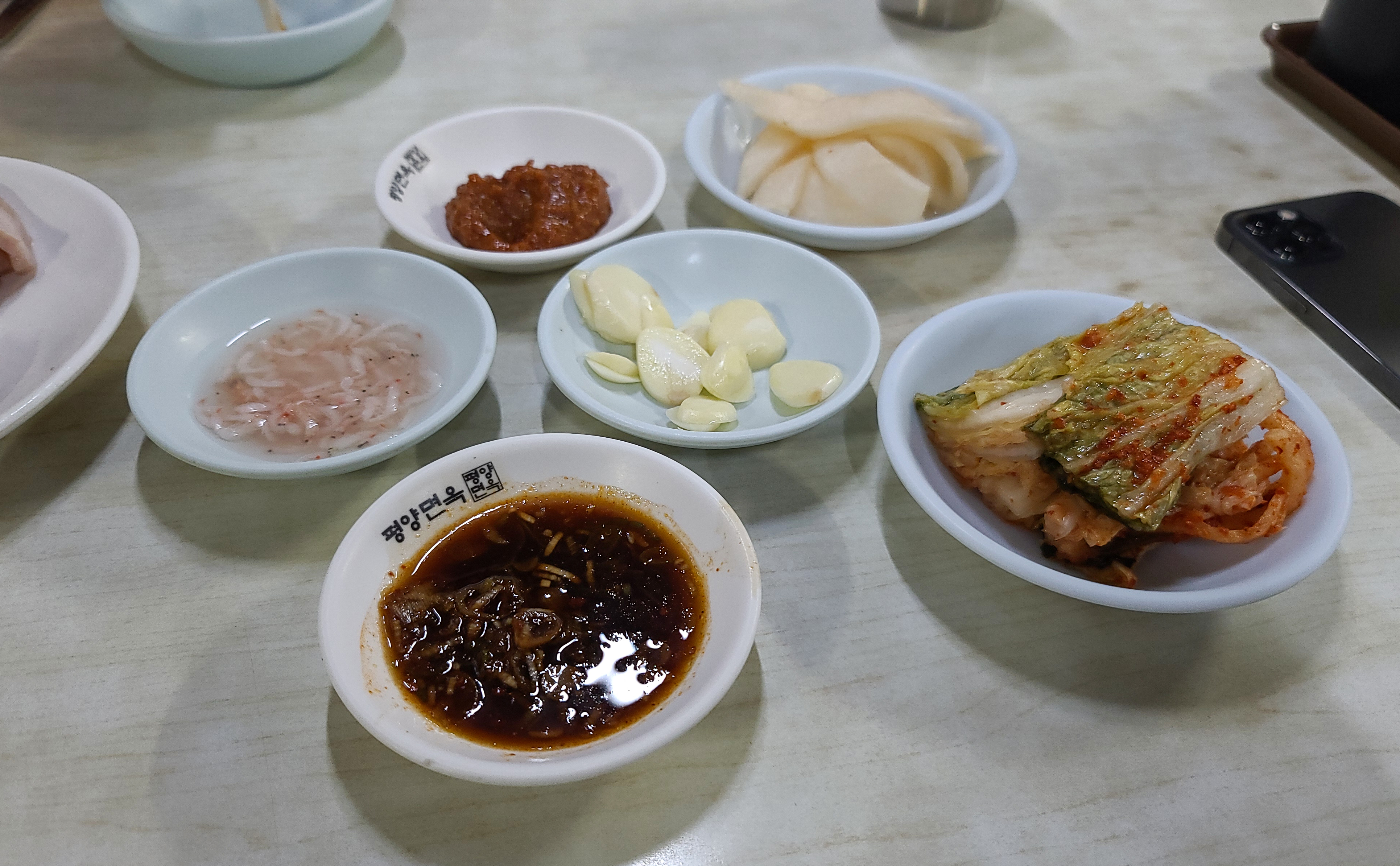 곧이어 제육과 함께 반찬과 각종 양념이 제공되었습니다. 청담동 피양옥(링크)에서 먹었던 제육은 차가운 수육과 같은 느낌이었는데, 장충동 피양옥의 제육은 부드럽고 따뜻한 수육과 비슷한 맛이었습니다.