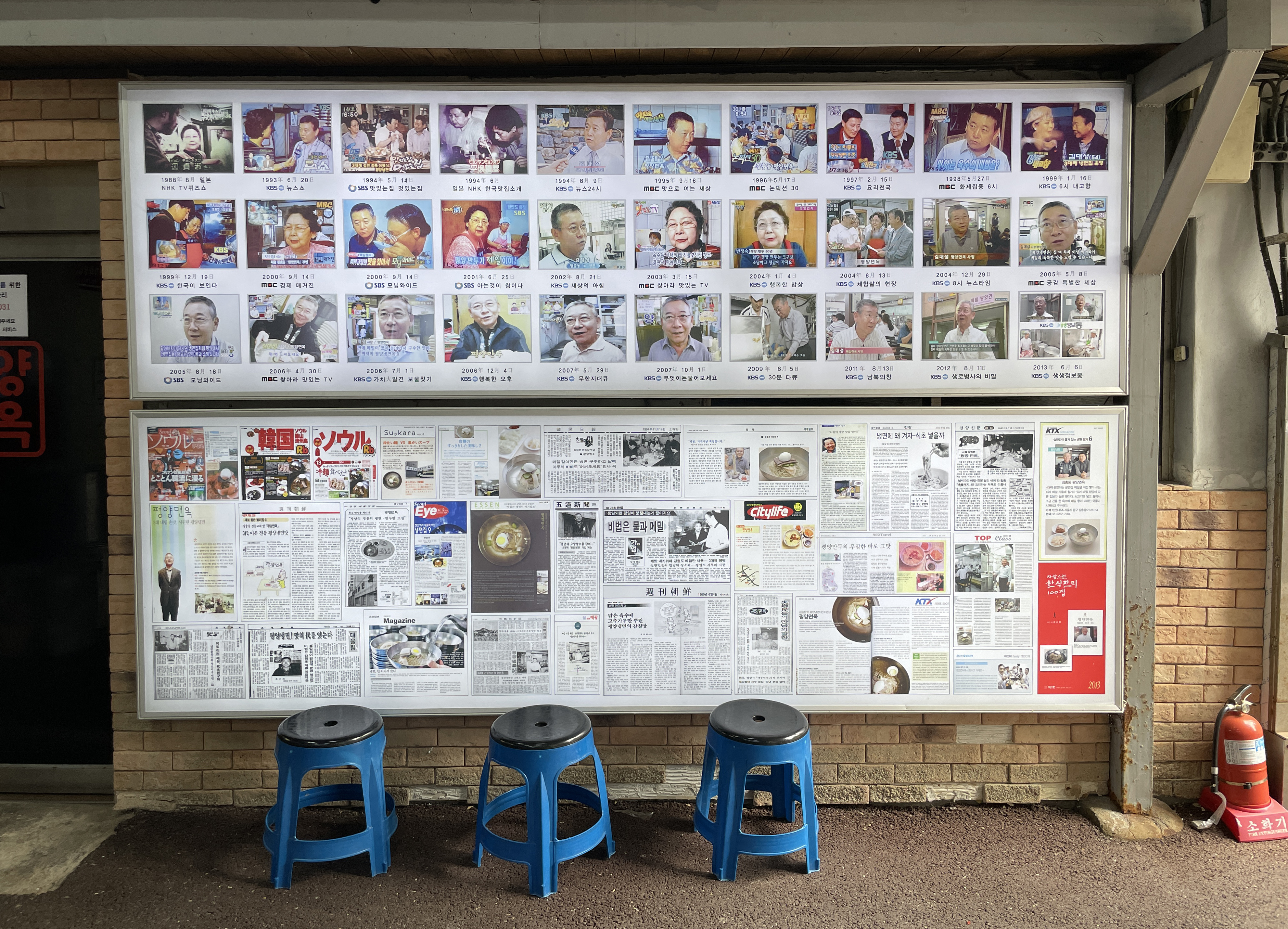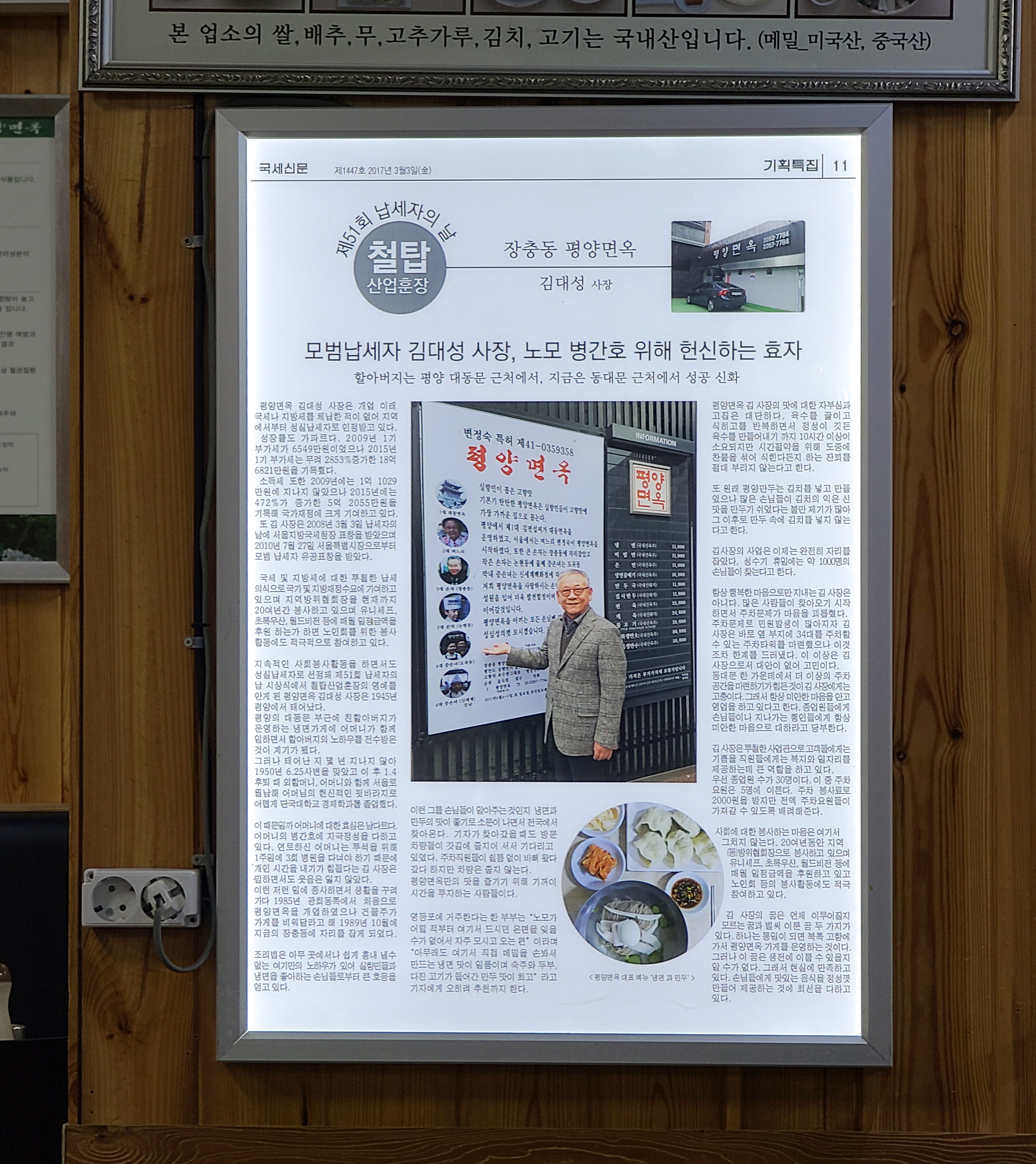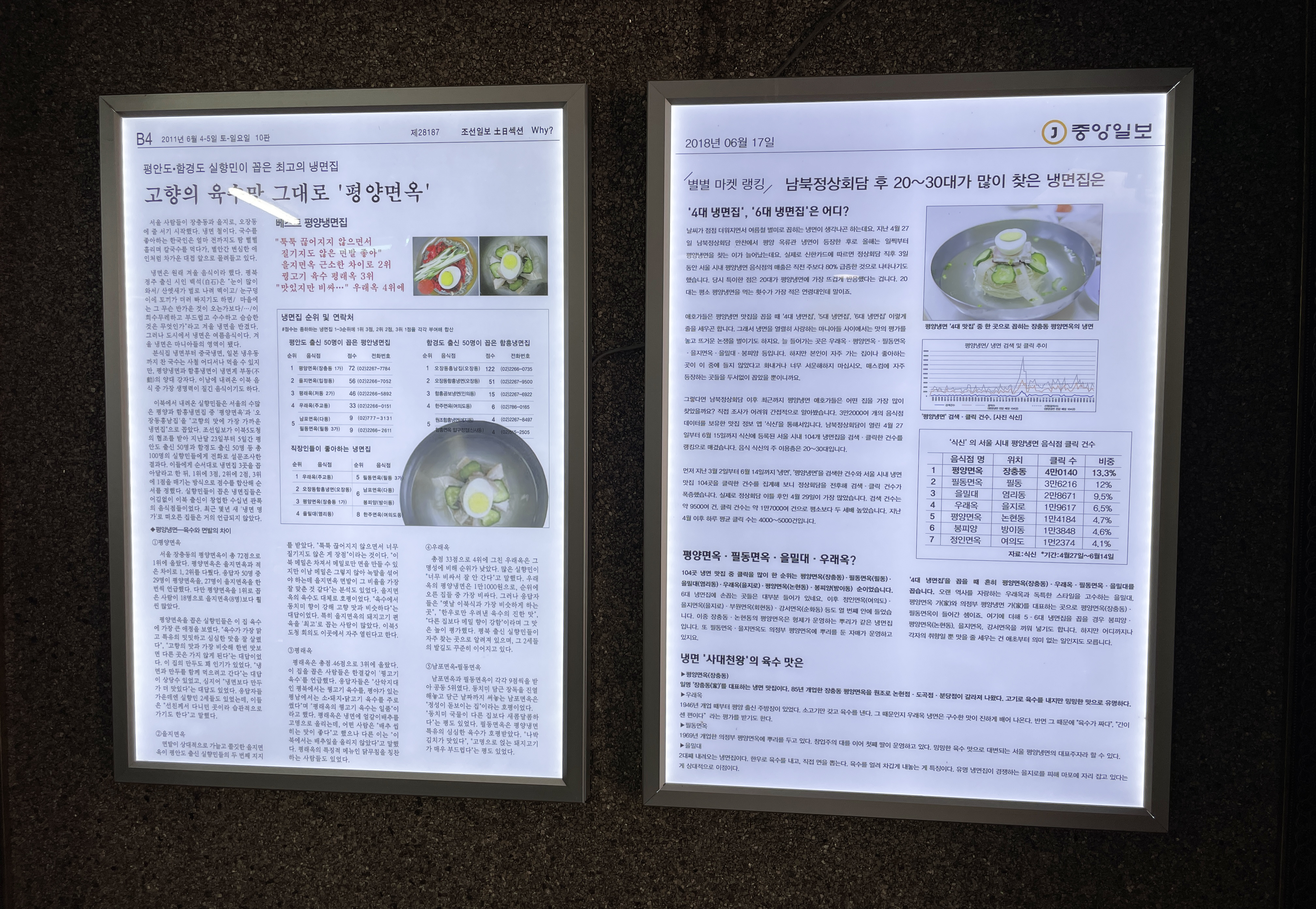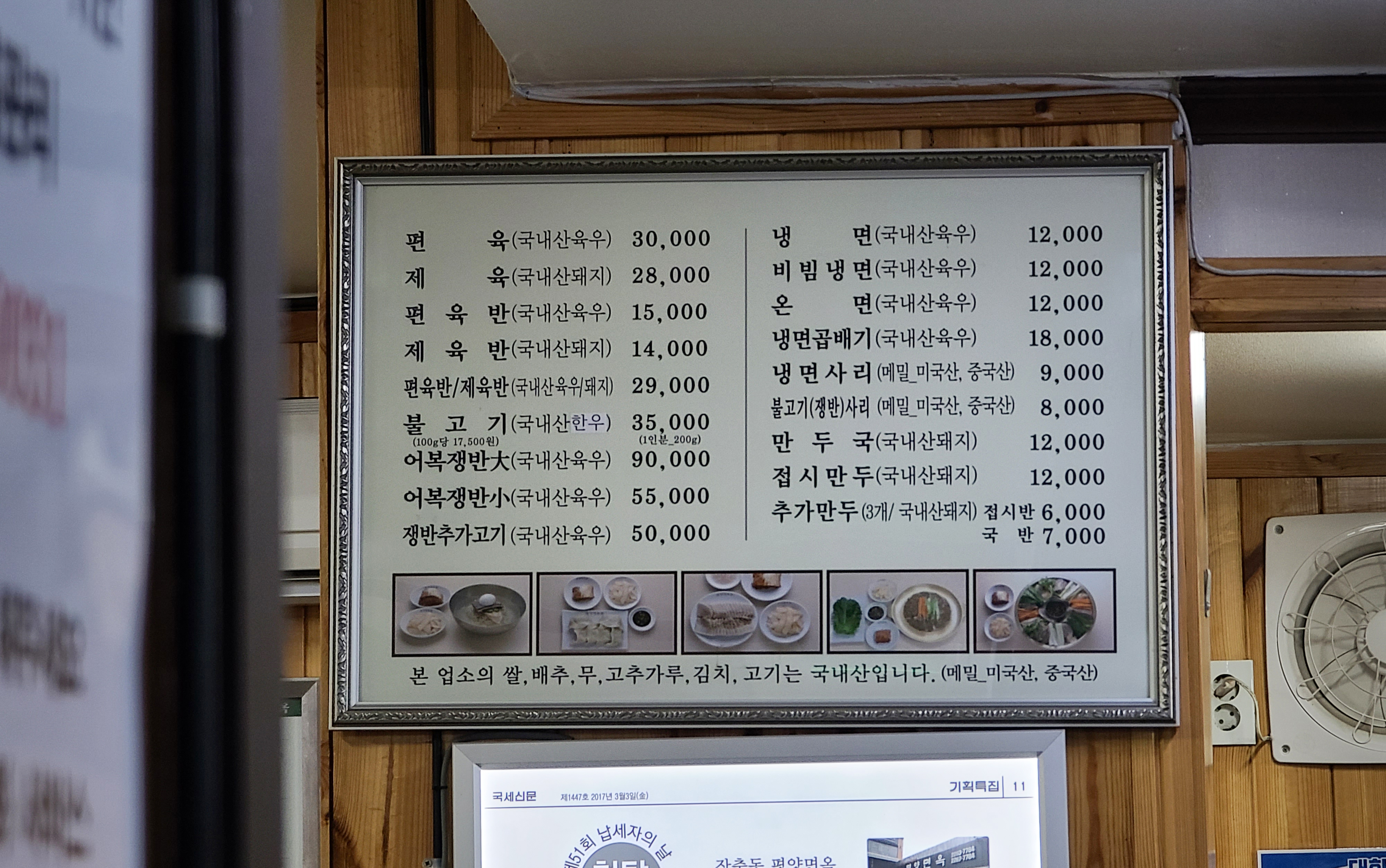 저는 차량을 이용해서 중구 장충동에 위치한 <평양면옥> 가게를 방문했는데, 발렛 서비스 이용요금으로 주차비용 2,000원이 있었습니다. 가게 입구에는 평양면옥의 메뉴판이 있어서 메뉴와 가격을 미리 알 수 있도록 되어있었고, 가게 곳곳에서 평양면옥을 소개했던 기사들과 방송 내용을 전시한 것을 볼 수 있었습니다.