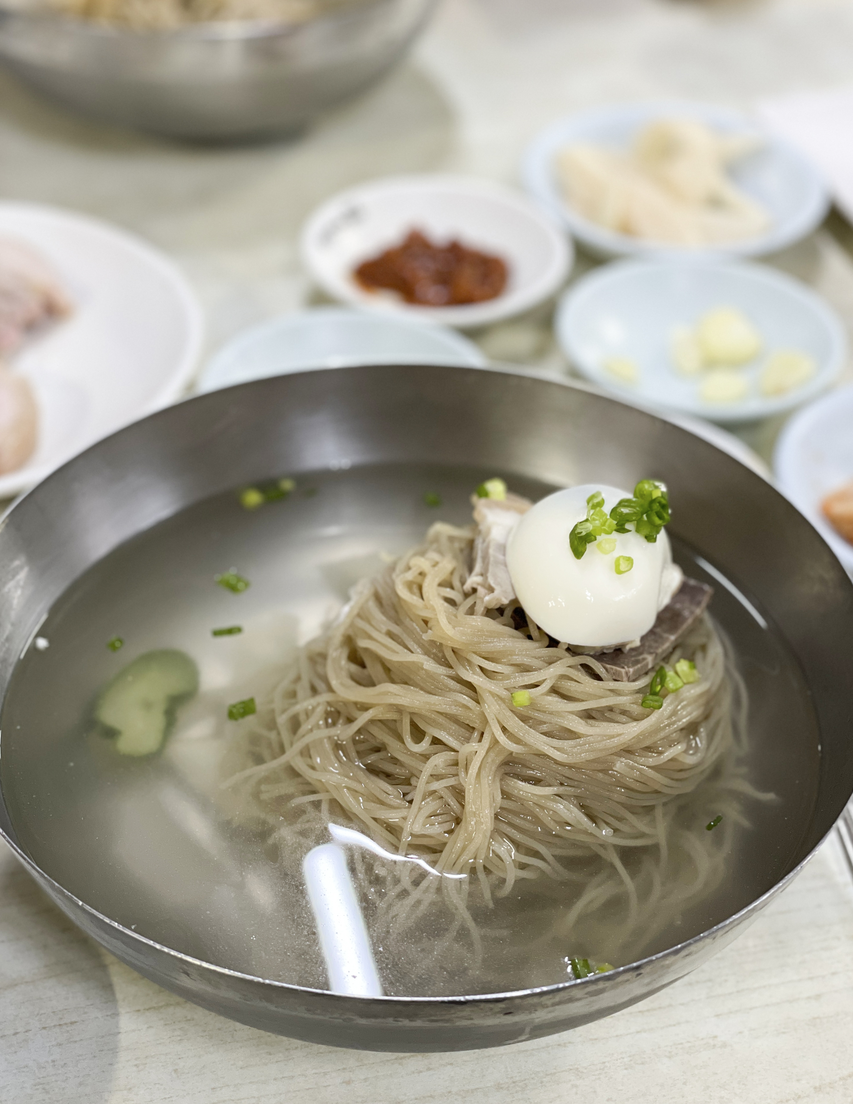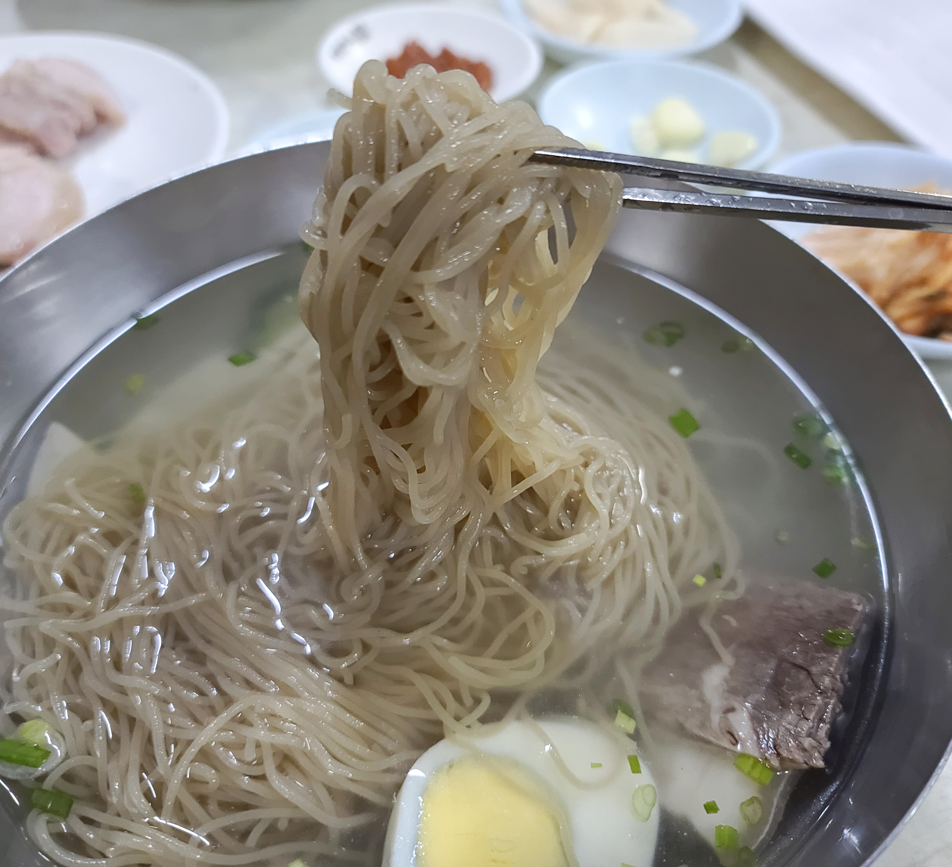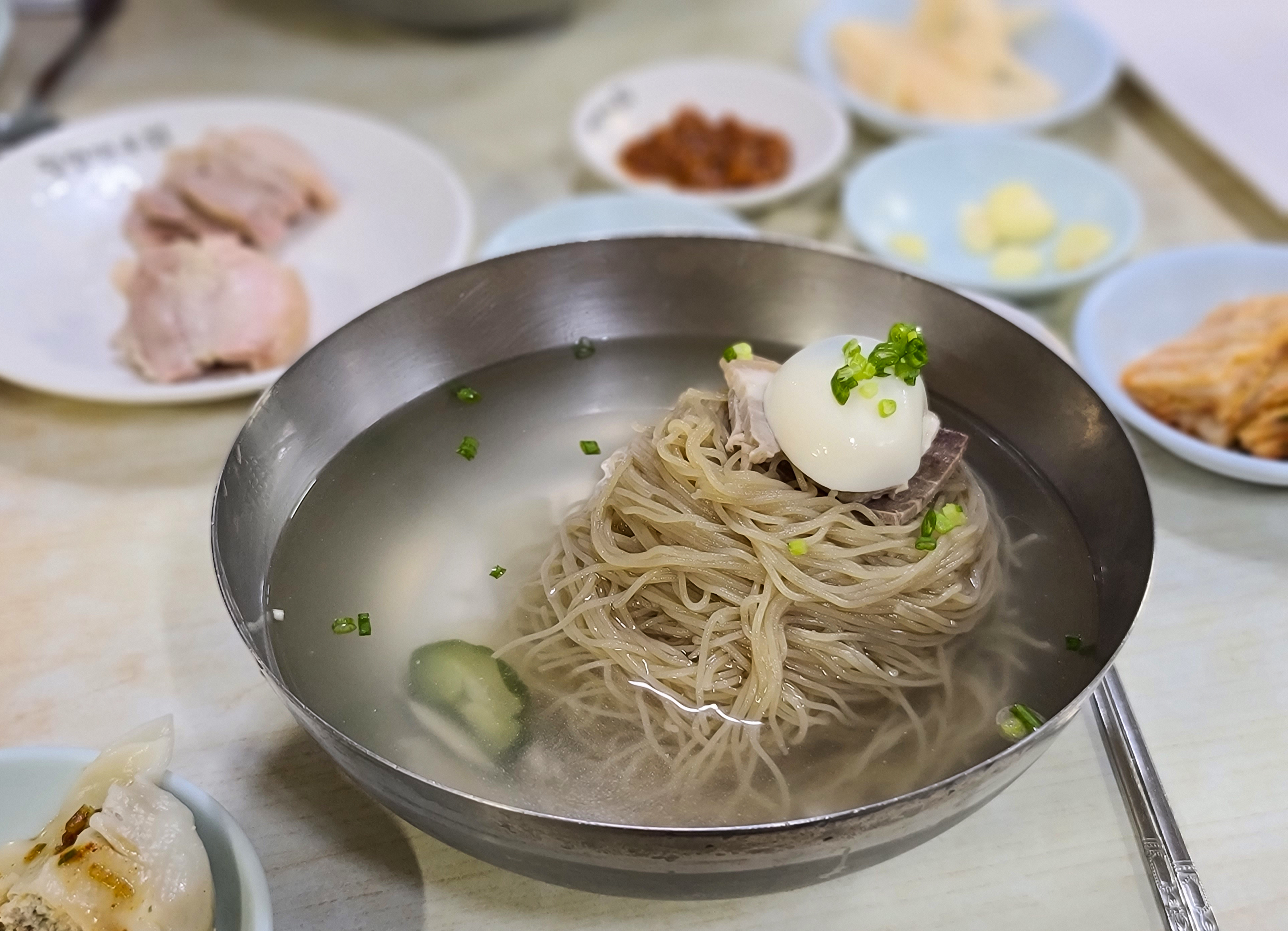 평양면옥에서 만두와 제육같이 냉면과 곁들이는 메뉴만 한참을 먹다가 한참 뒤에 받은 냉면의 모습은 이렇습니다. 그나마 다행인 것은 주문 누락으로 안 나온 냉면이라 바로 만들어줘 면이 퍼지거나 하지는 않았습니다.