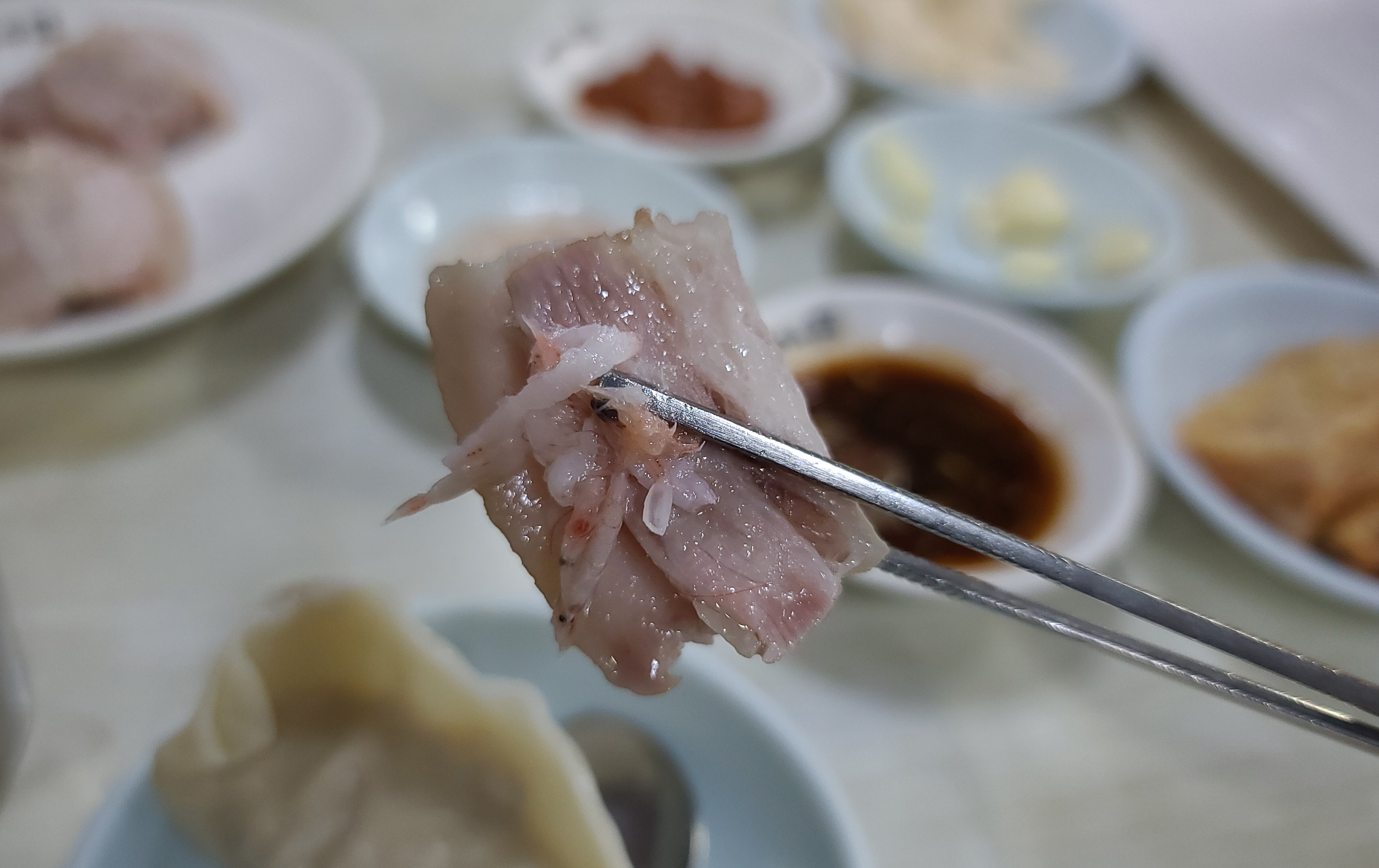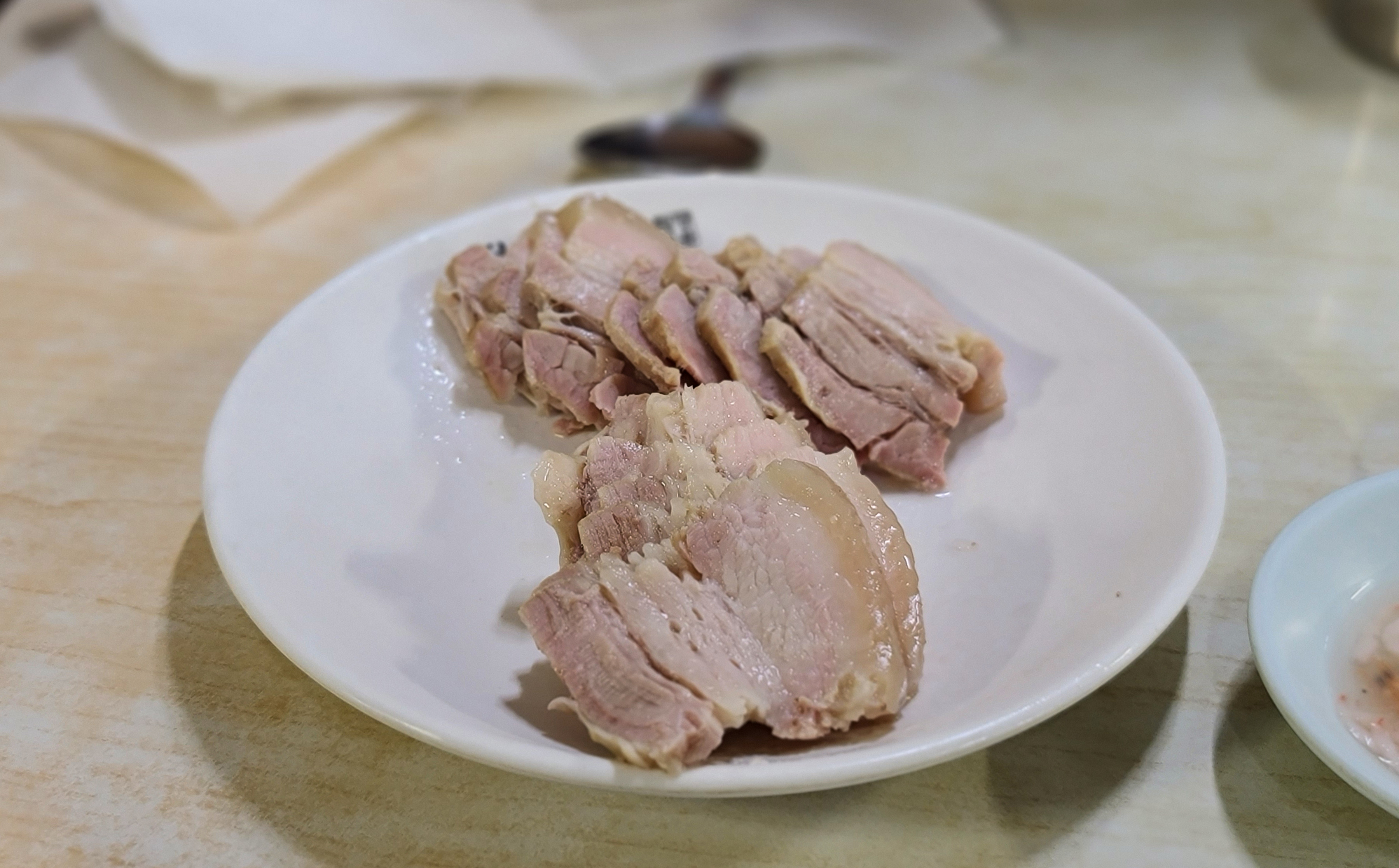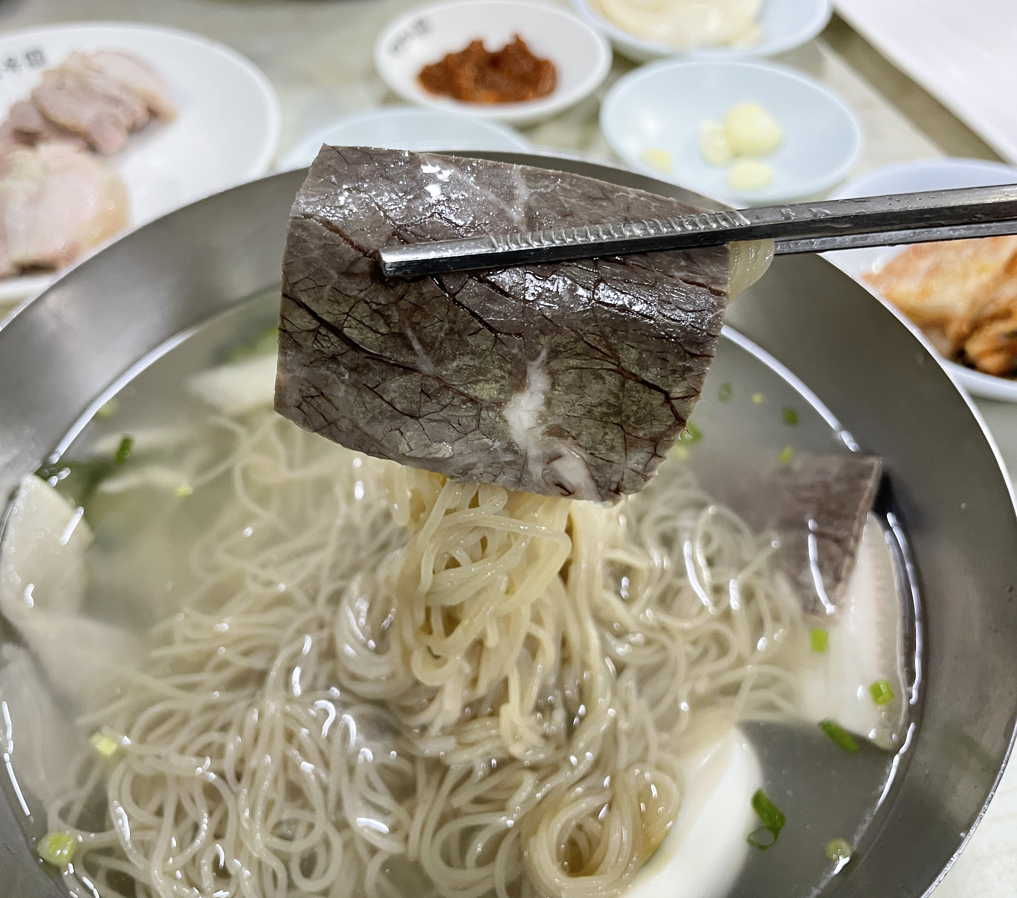 평양면옥의 제육을 새우젓에 곁들여서 먹었는데, 우리가 흔히 아는 '보쌈' 혹은 '수육' 과 비슷한 느낌이었습니다. 적당히 촉촉하고 기름진 부드러운 고기는 냉면과 곁들여 먹기에 괜찮은 조합이었죠.