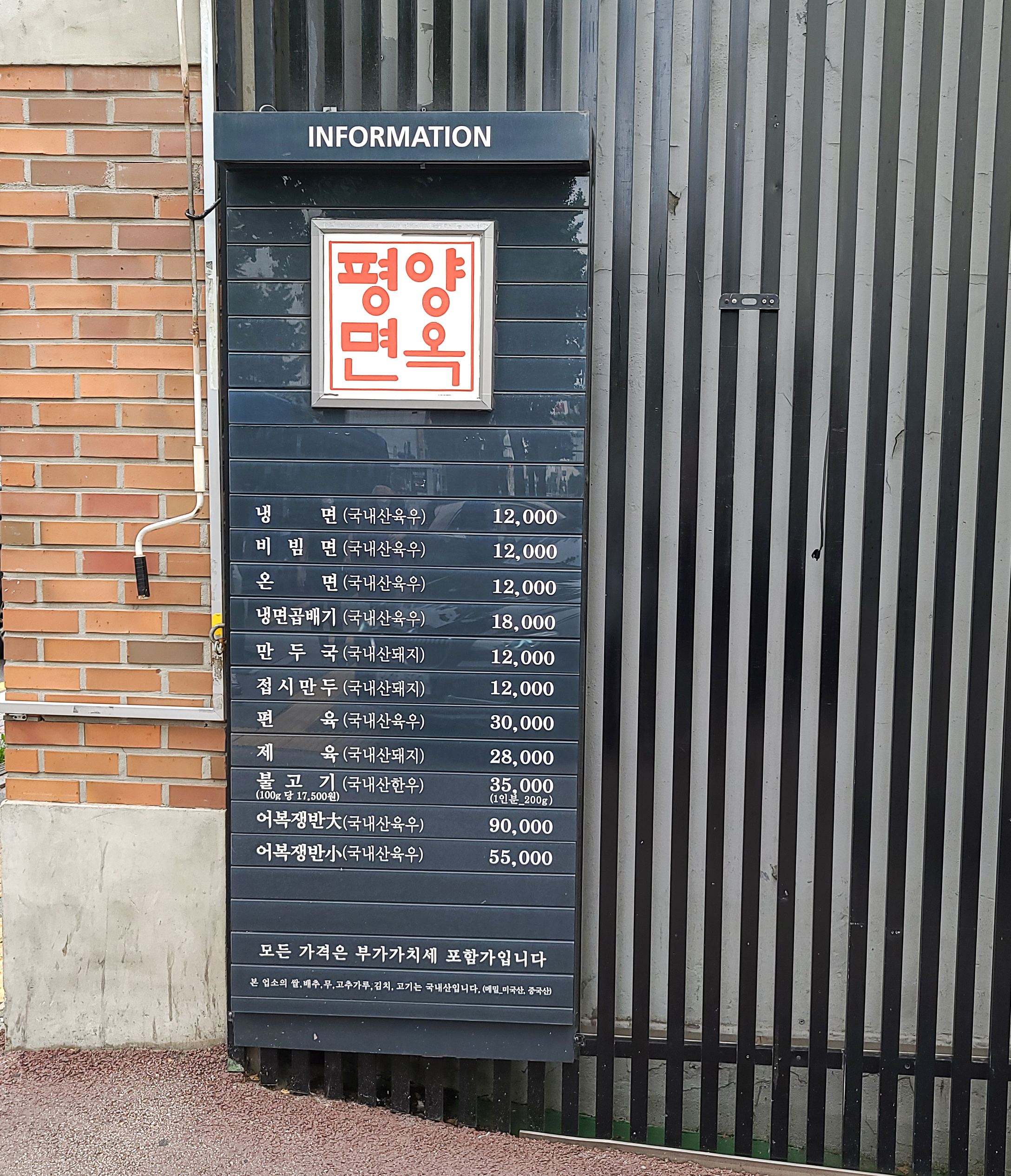 저는 차량을 이용해서 중구 장충동에 위치한 <평양면옥> 가게를 방문했는데, 발렛 서비스 이용요금으로 주차비용 2,000원이 있었습니다. 가게 입구에는 평양면옥의 메뉴판이 있어서 메뉴와 가격을 미리 알 수 있도록 되어있었고, 가게 곳곳에서 평양면옥을 소개했던 기사들과 방송 내용을 전시한 것을 볼 수 있었습니다.