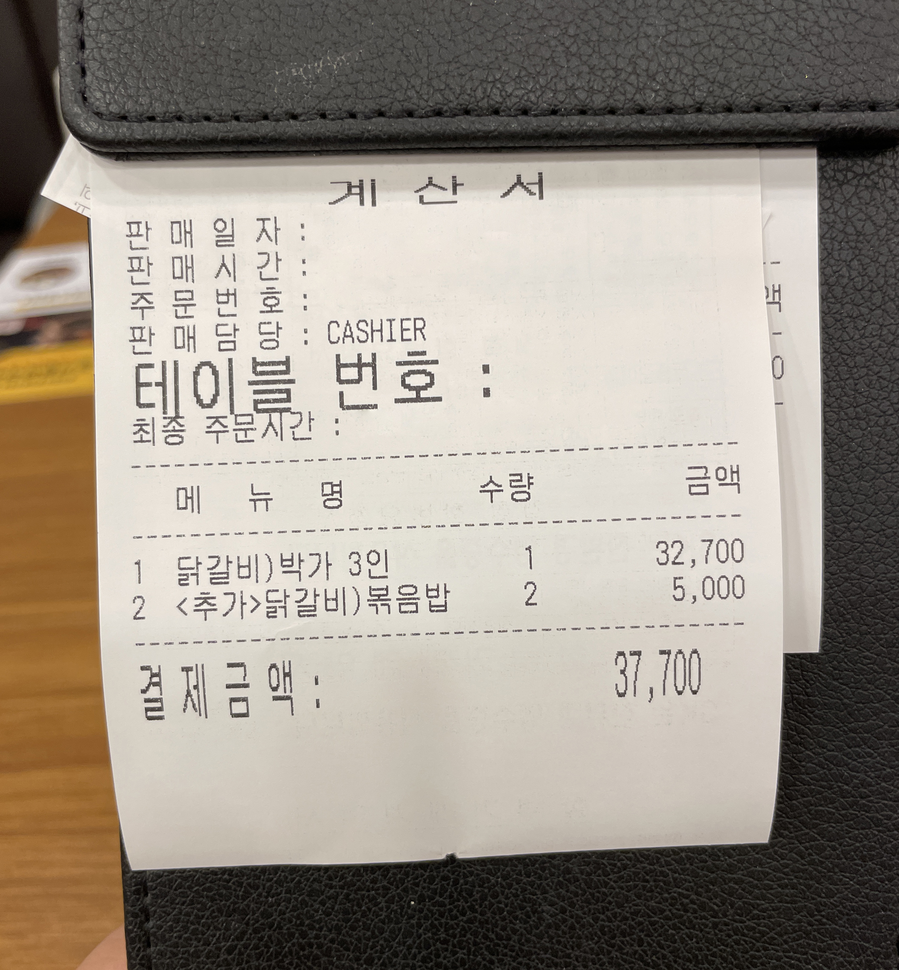 박가부대에서 총 식사한 비용은 박가닭갈비 3인분과 닭갈비볶음밥 2인분 추가해서 37,700원 이었습니다. 가성비가 딱히 좋은 것도 모르겠고, 그냥 동네에서 간단히 식사할만한 가게로 소개해드립니다.