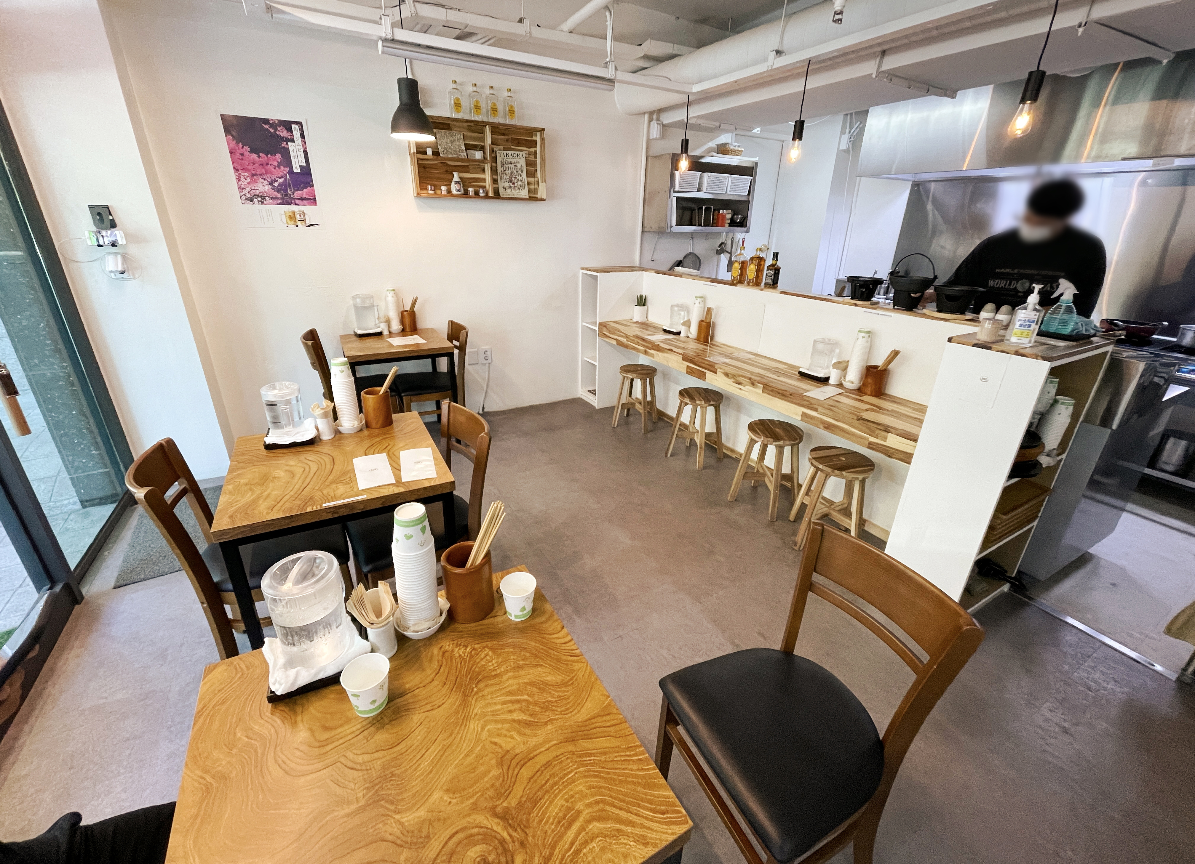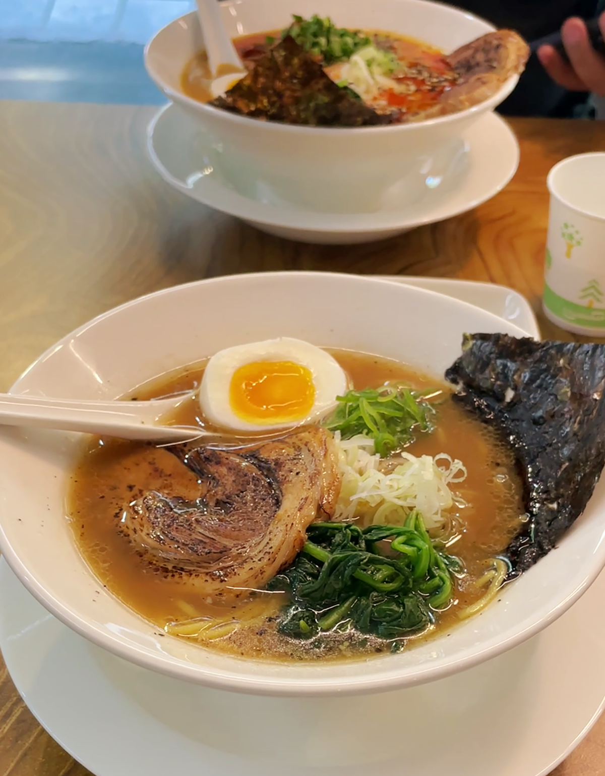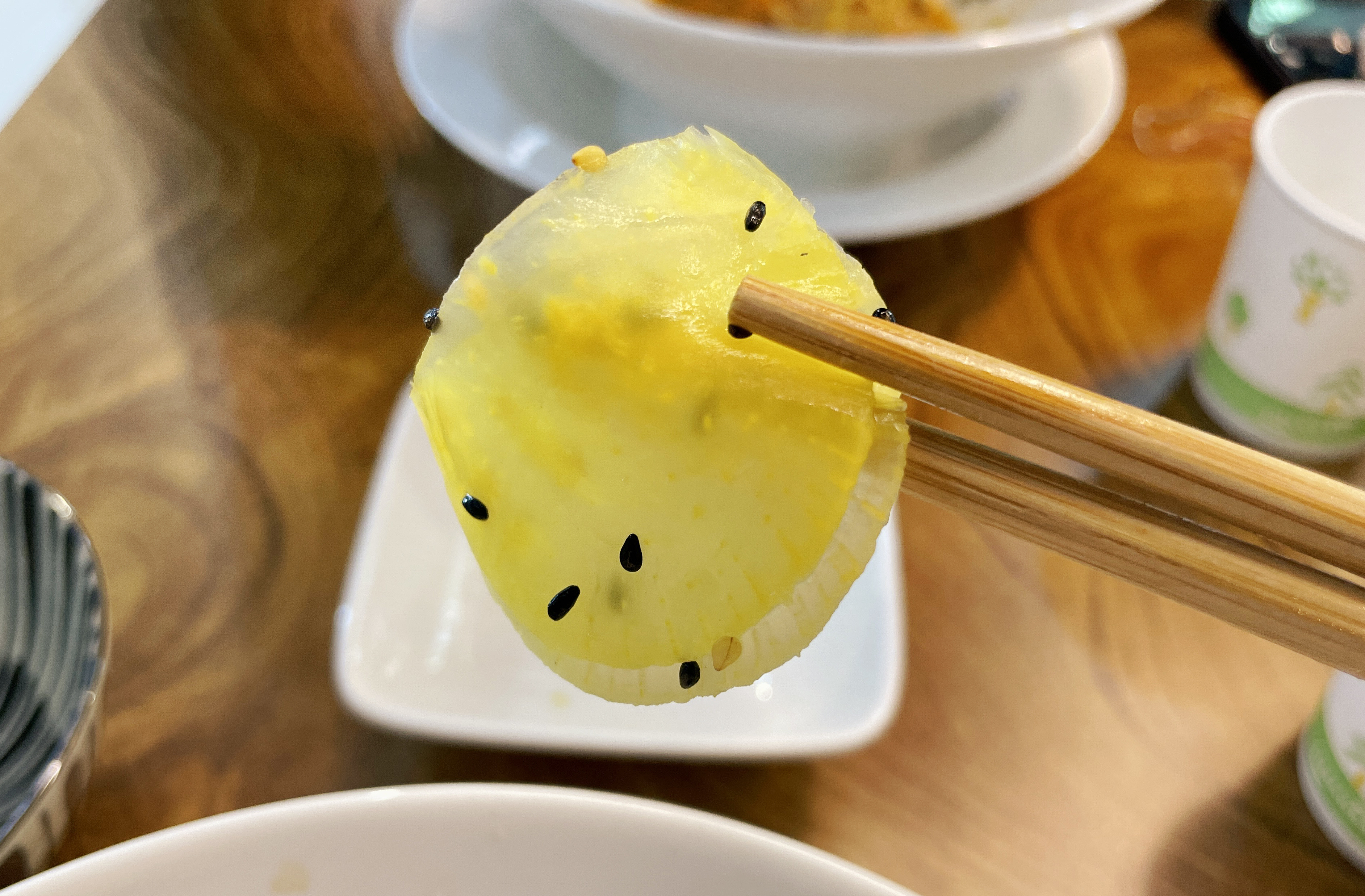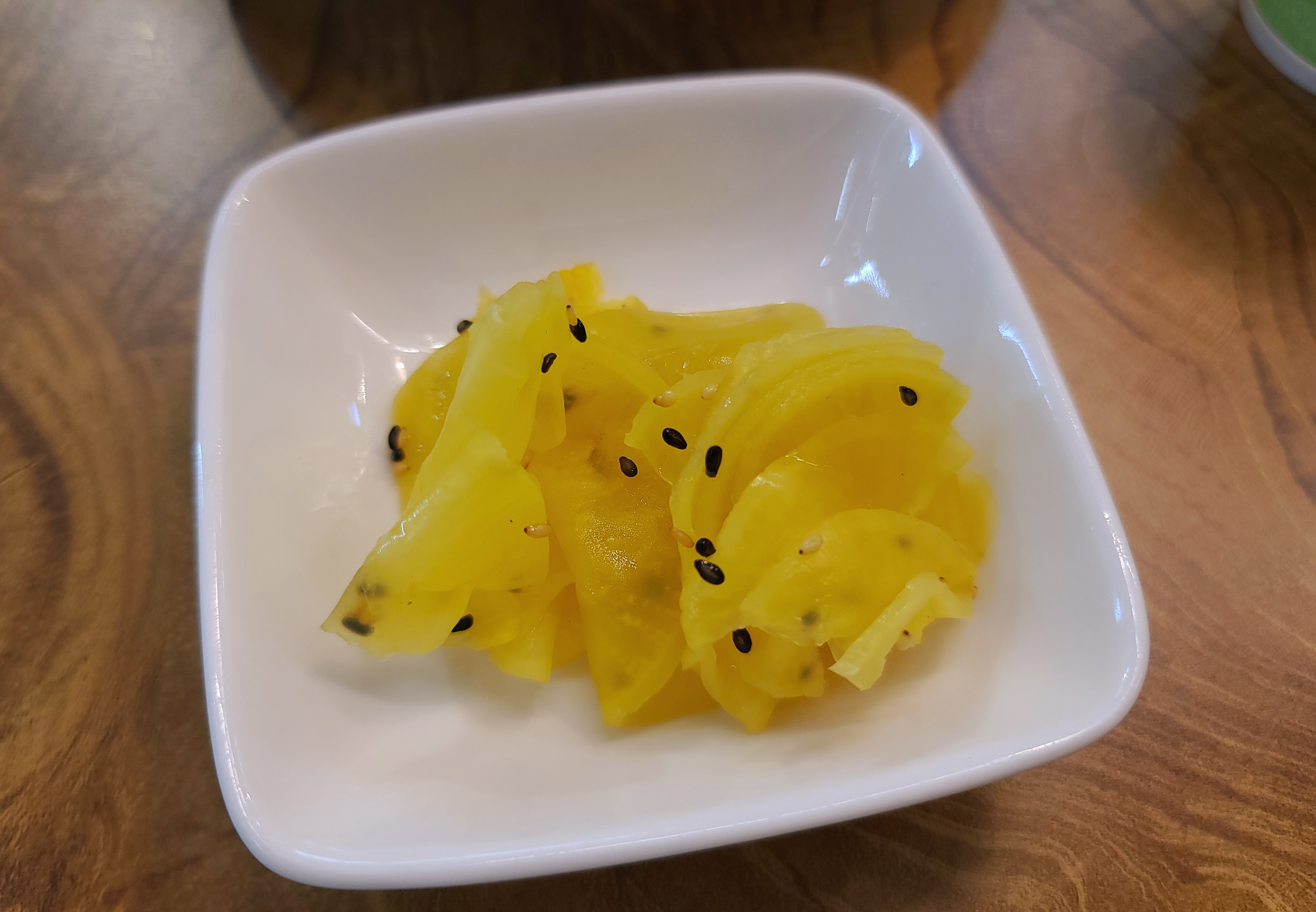 제가 주문한 더블 수프 블렌딩 라멘과 탄탄멘이 나왔습니다. 밥은 사장님한테 말하면 별도의 비용을 받지 않고 서비스로 제공해주고 있었으며, 반찬으로 유자향이 나는 단무지를 직접 담아올 수 있었습니다.