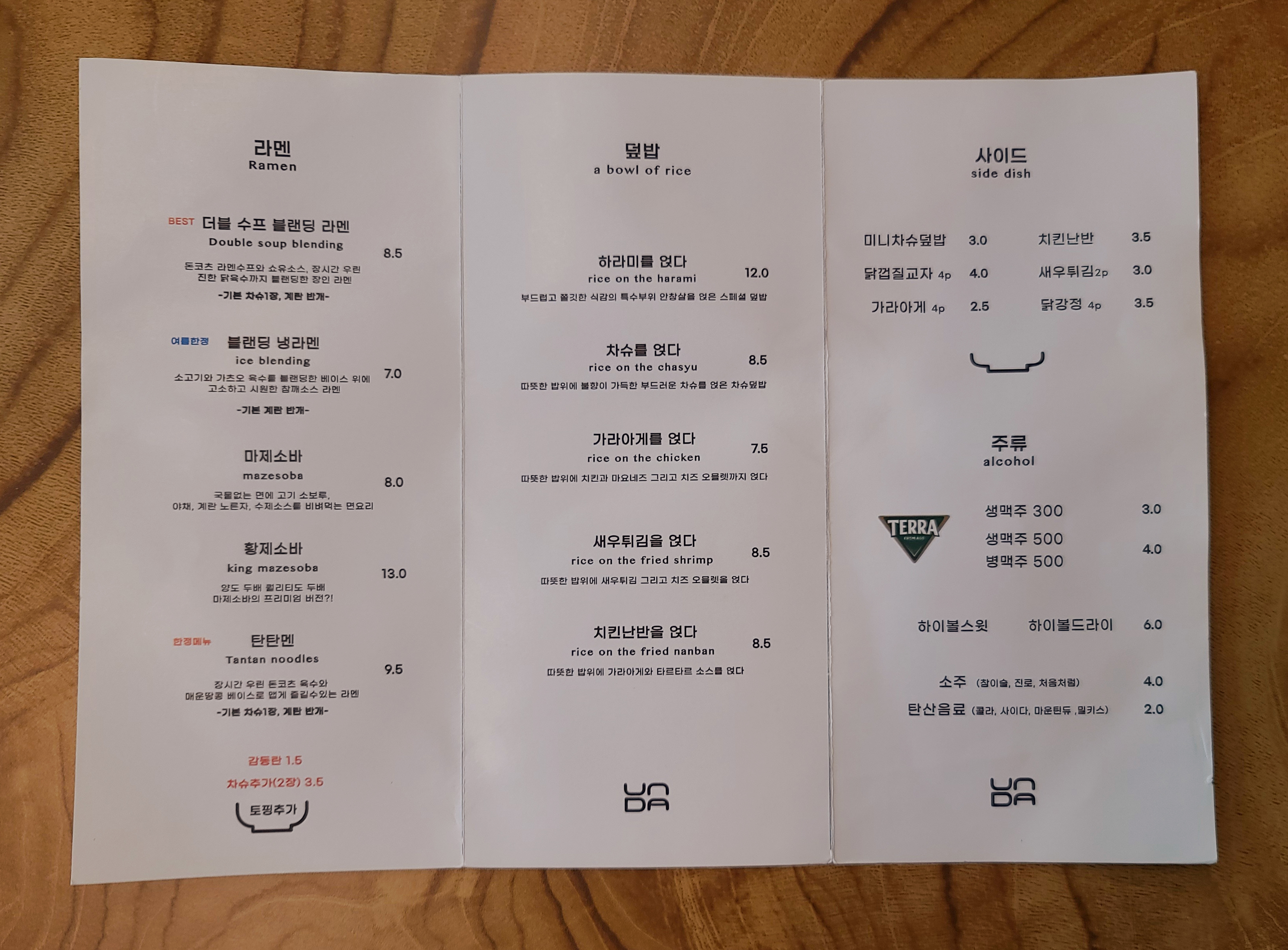 신림 얹다의 메뉴는 이렇습니다. 더블 수프 블렌딩 라멘, 블렌딩 냉라멘, 마제소바, 황제소바, 탄탄멘, 하라미를 얹다, 차슈를 얹다, 가라아게를 얹다, 새우튀김을 얹다, 치킨난반을 얹다, 미니차슈덮밥, 치킨난반, 닭껍질교자, 새우튀김, 가라아게, 닭강정 등이 있었습니다. 메뉴의 가격은 7,000~ 13,000원 사이였습니다. 저는 더블 수프 블렌딩 라멘, 같이 간 형은 탄탄멘을 주문했습니다.