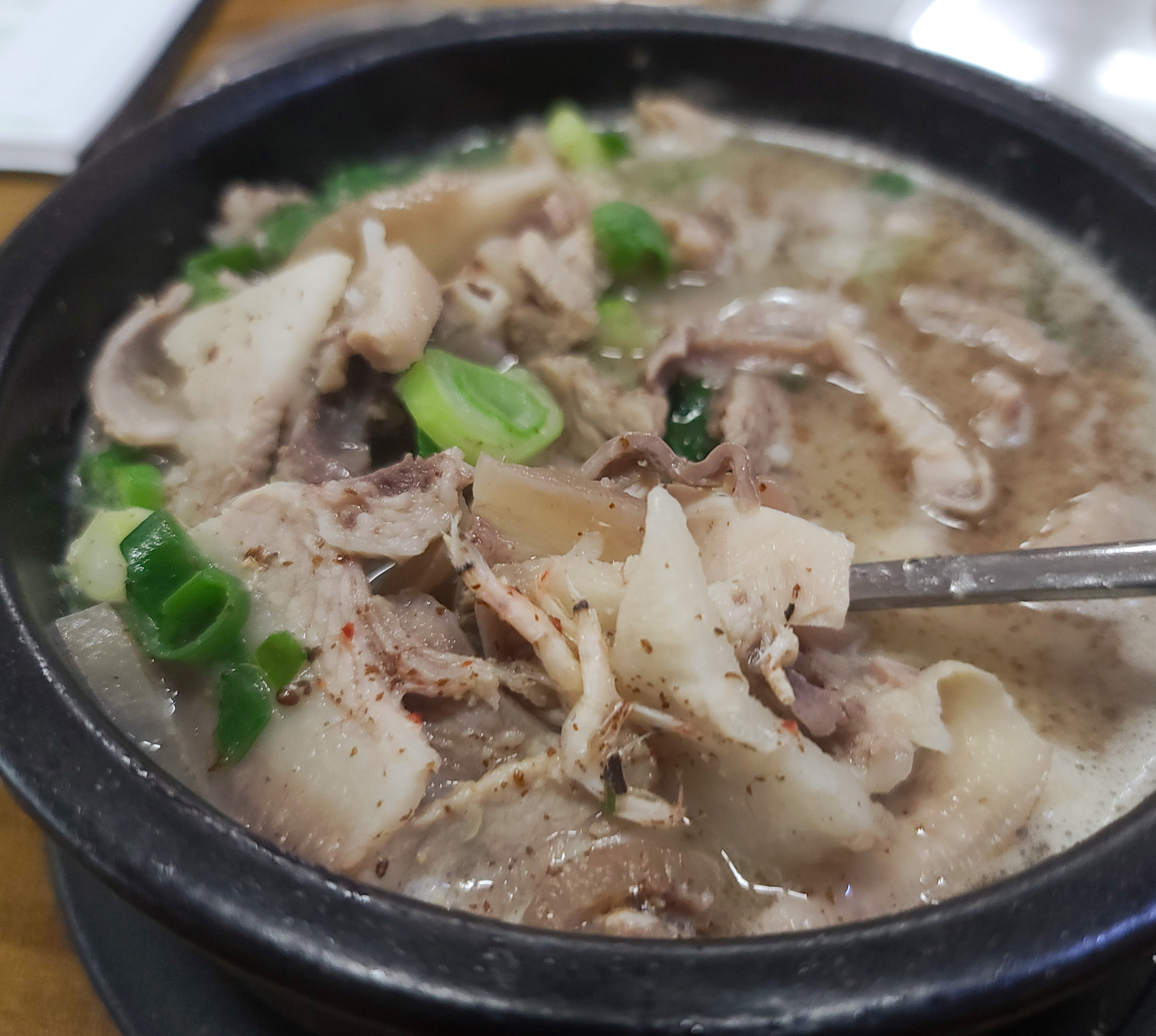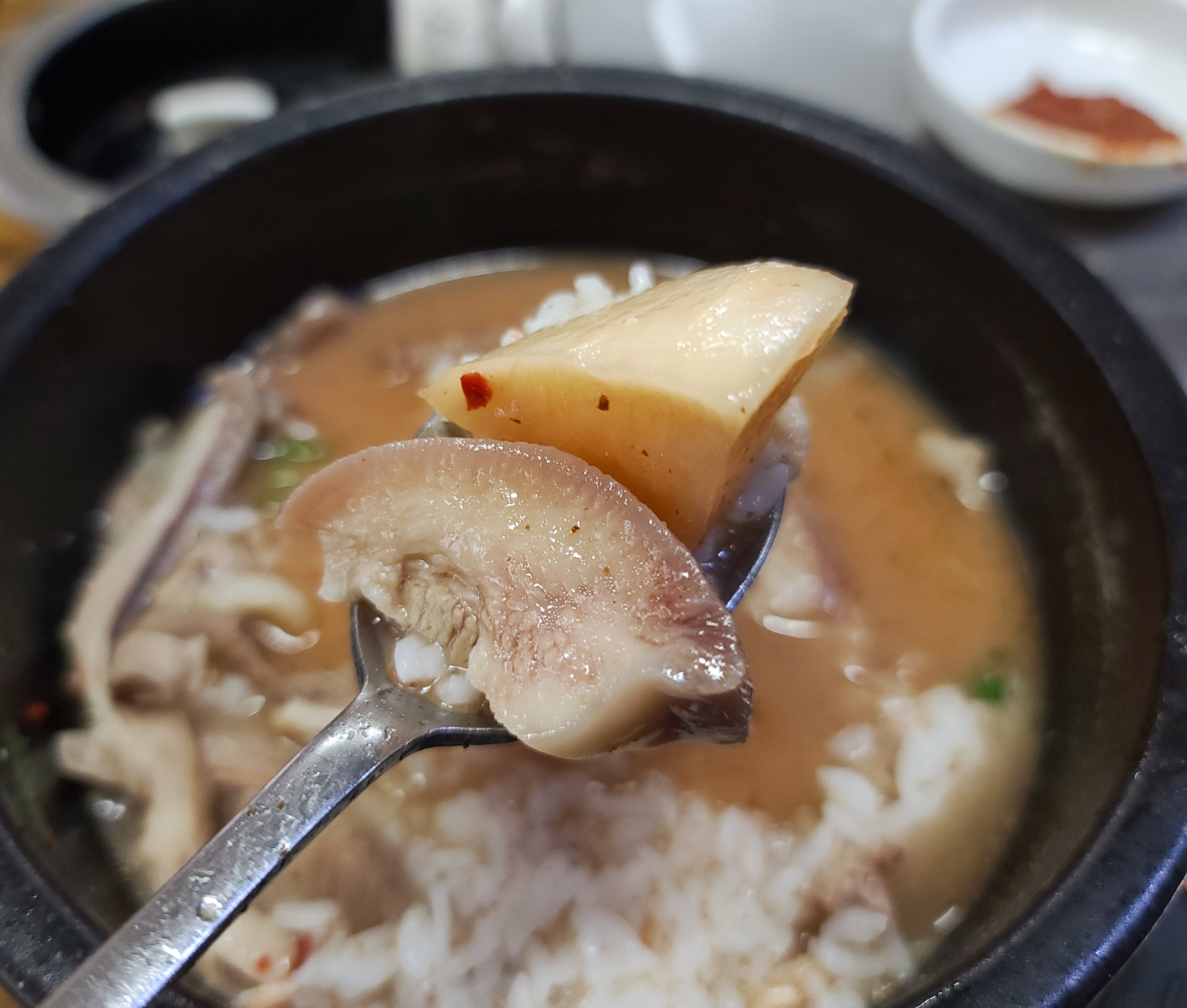 제가 주문한 순대국 특 자의 모습은 이렇습니다. 곱창과 같이 쫄깃한 식감이 있는 부속고기들이 많이 들어있었고, 고기는 비곗 쪽이 많이 들어있었습니다. 고기의 양은 많은 편이었는데, 대부분 질겅이는 식감의 부위라 조금 아쉽더라고요.