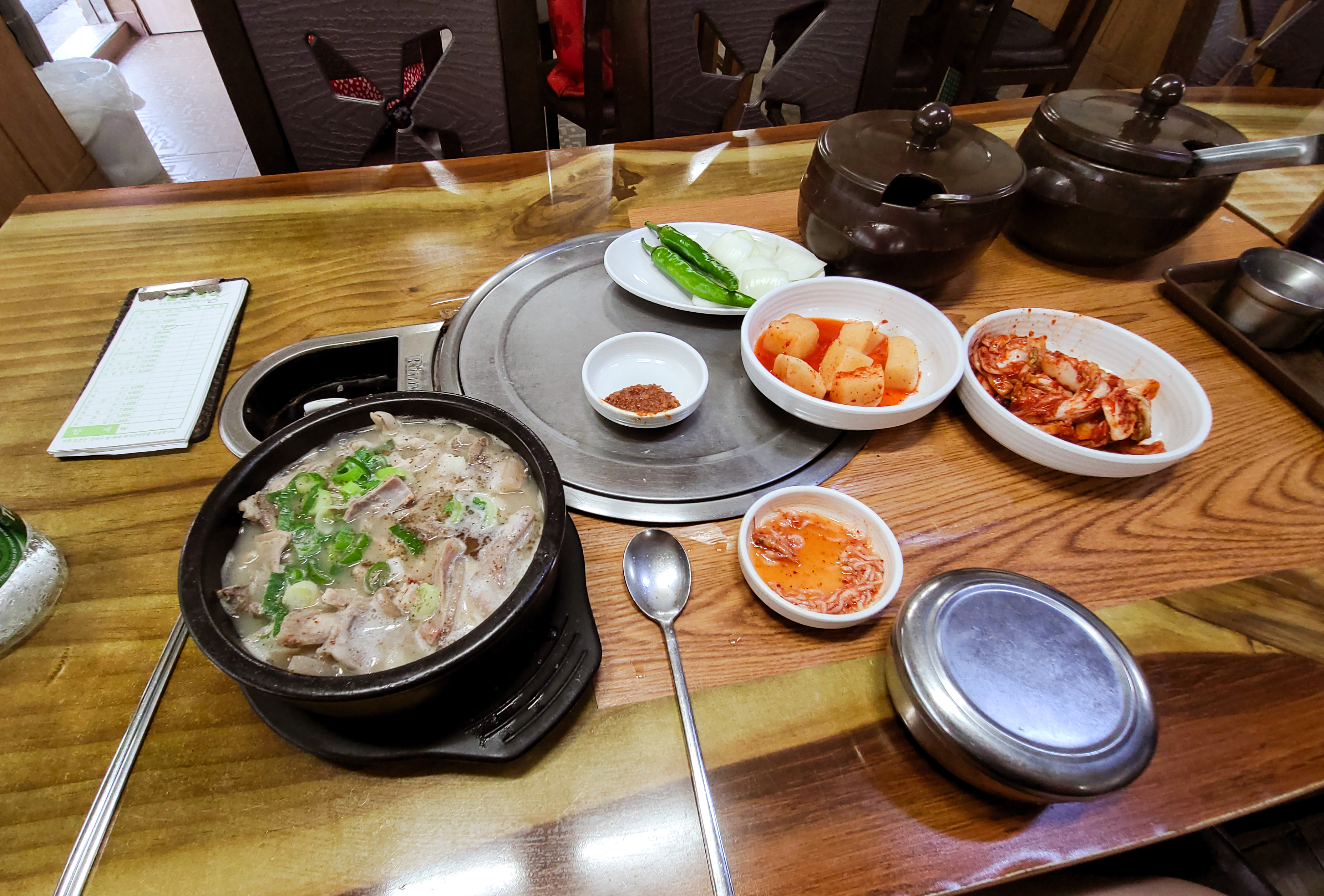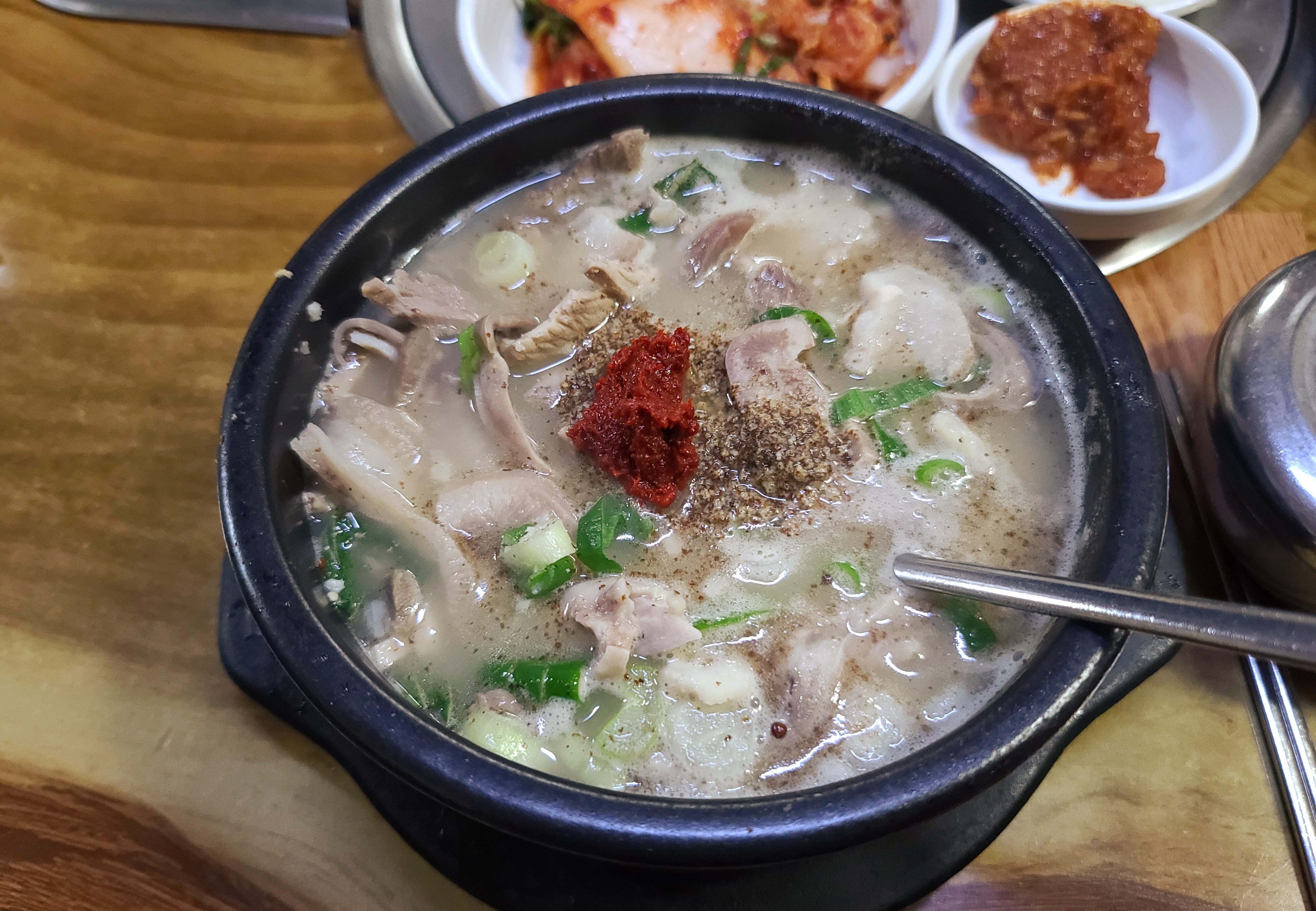 순대국은 손님이 많아서 그런지 약 5분쯤 기다리니 나오더라고요, 그밖에 배추김치와 무김치는 반찬통에서 직접 덜어먹을 수 있게 되어있었고, 양념장과 소금, 후추등을 기호에 따라 먹기좋게 테이블에 마련되어 있었습니다.