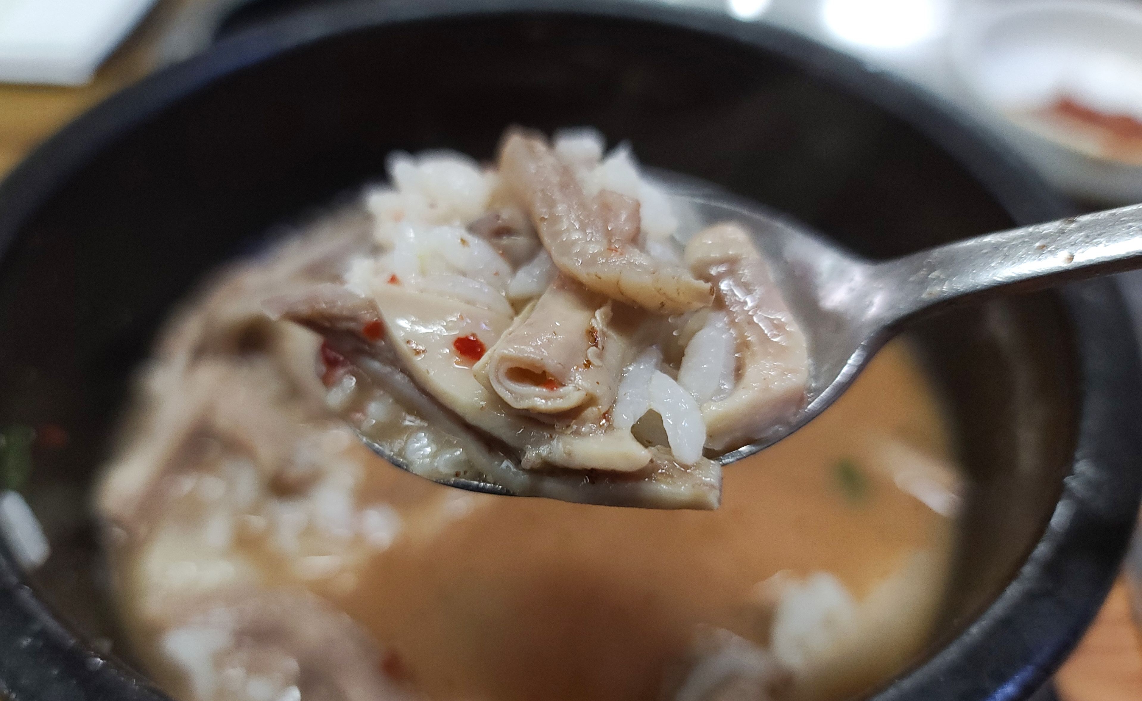 제가 주문한 순대국 특 자의 모습은 이렇습니다. 곱창과 같이 쫄깃한 식감이 있는 부속고기들이 많이 들어있었고, 고기는 비곗 쪽이 많이 들어있었습니다. 고기의 양은 많은 편이었는데, 대부분 질겅이는 식감의 부위라 조금 아쉽더라고요.