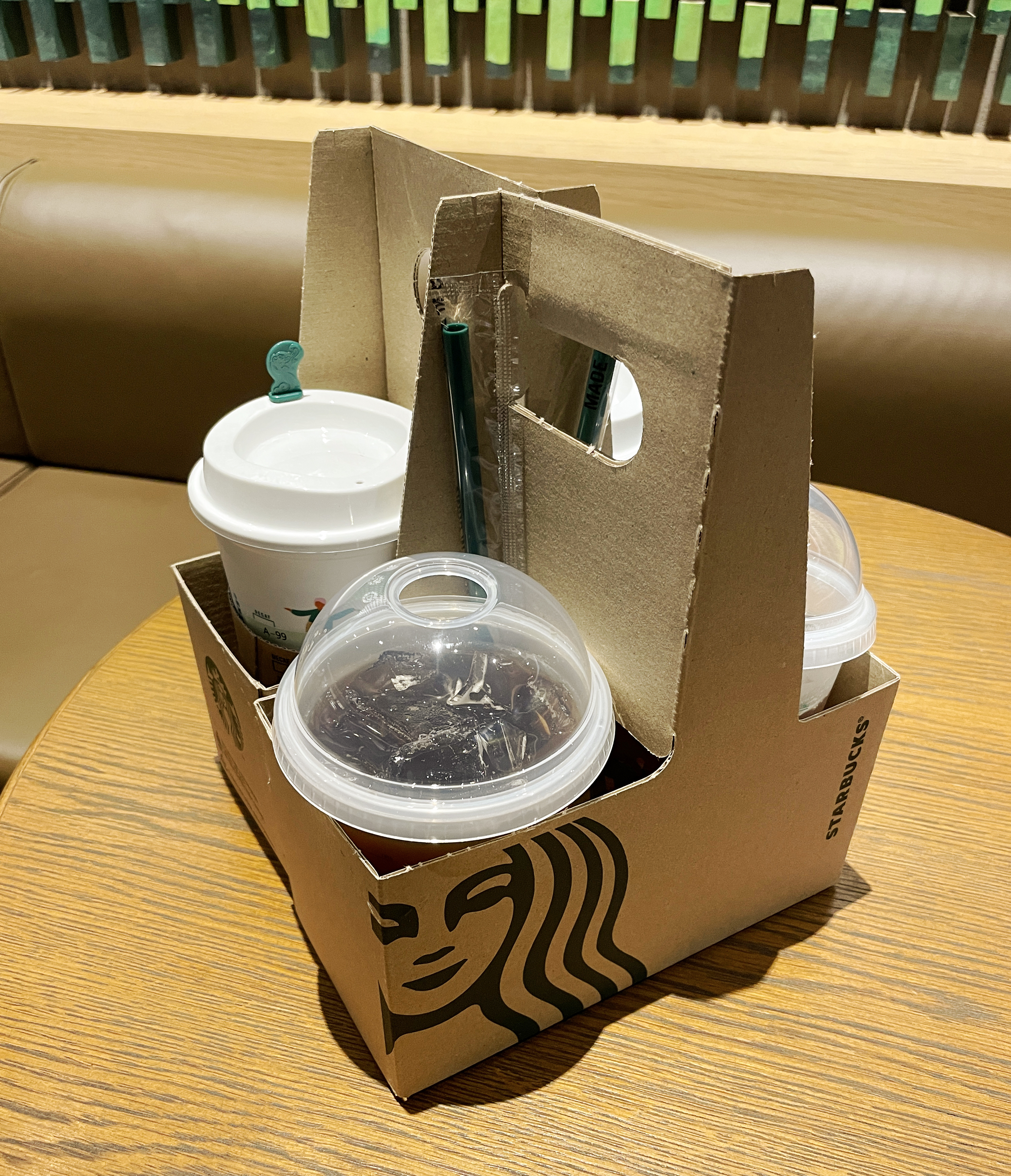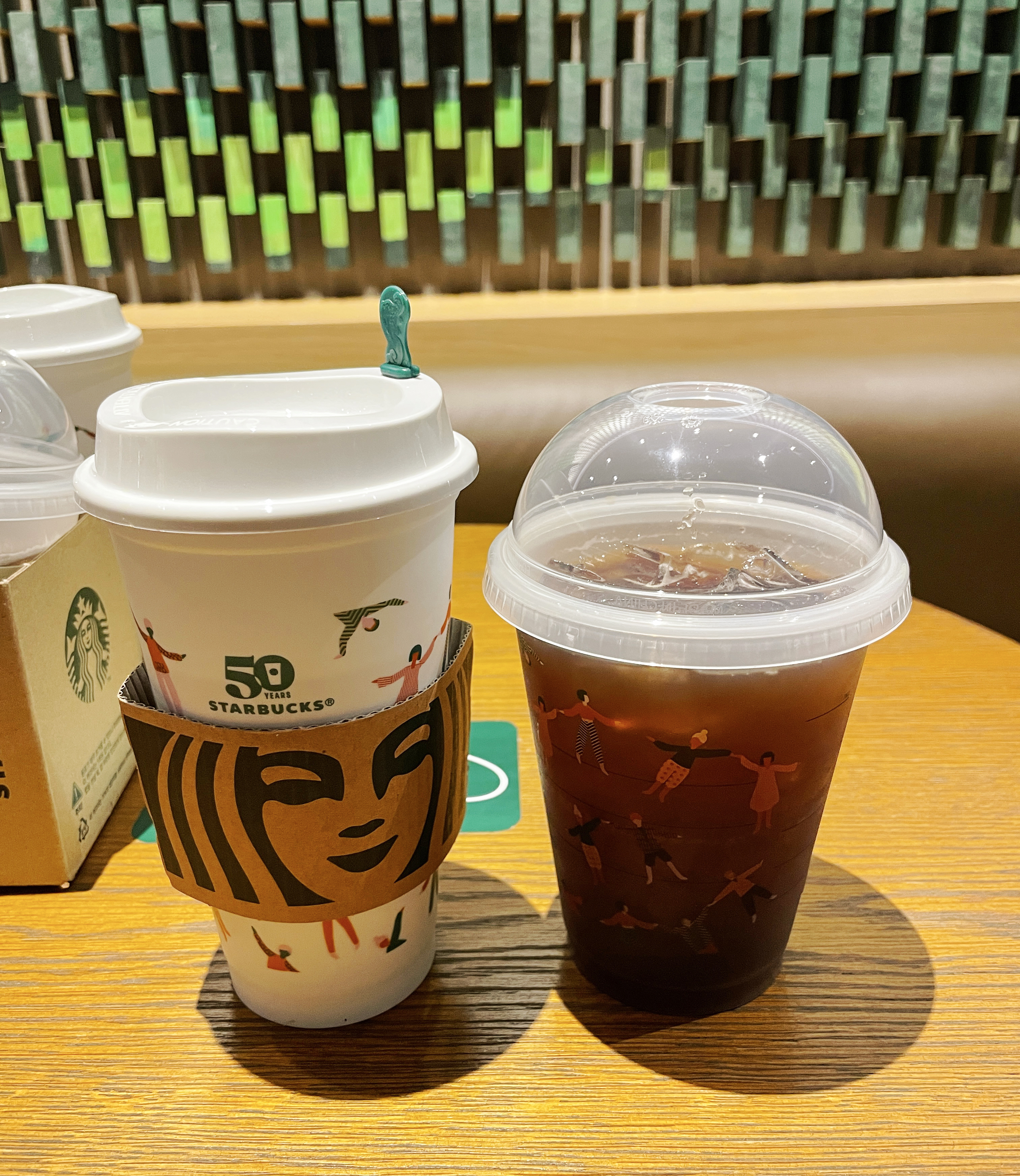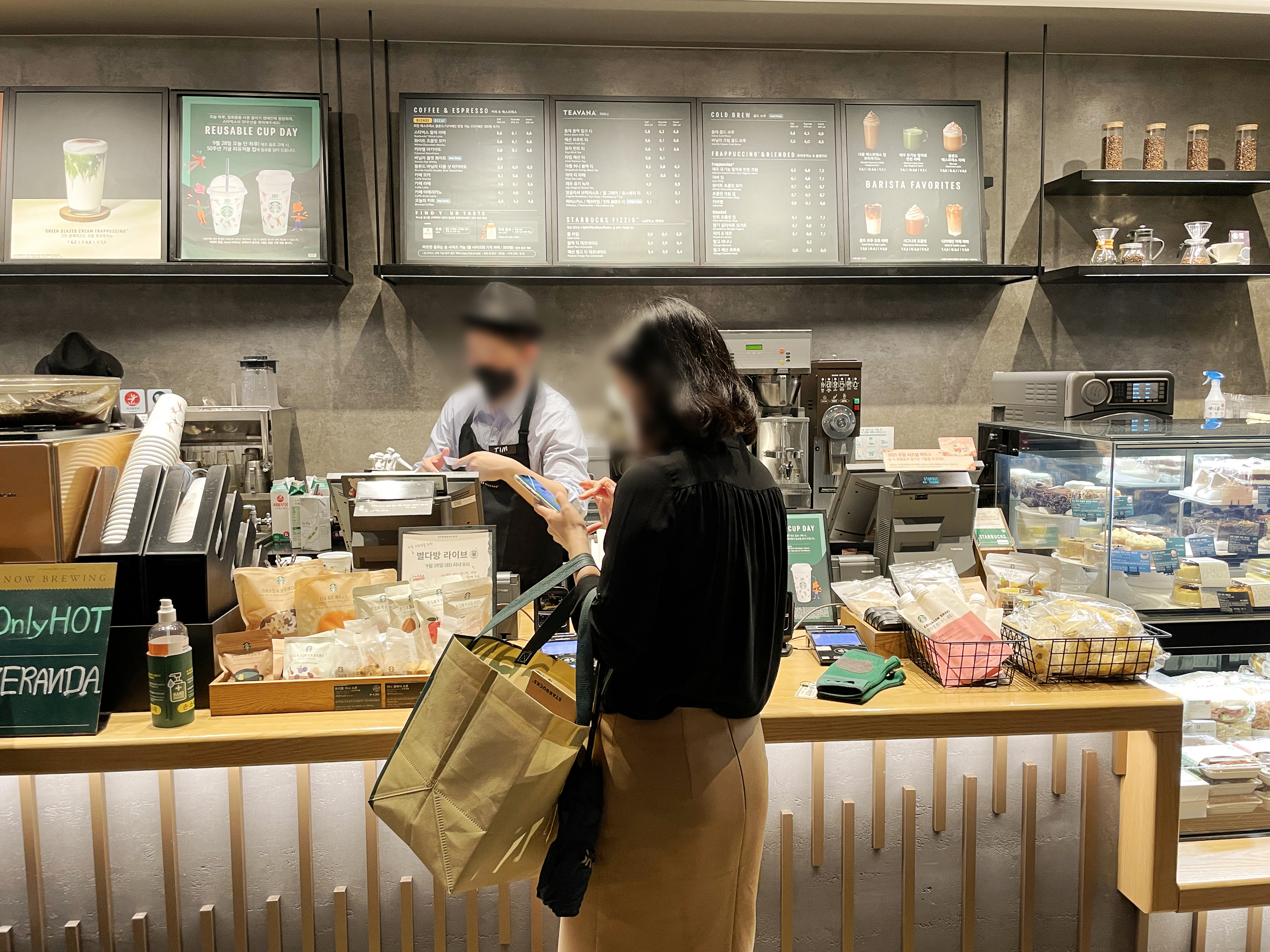 스타벅스 매장을 둘러보고 있는데, 곧이어 제가 주문한 음료가 나왔습니다. 리유저블컵은 스타벅스 공홈의 이미지 컷과 동일한 형태로 제공되었고, 뜨거운 음료를 담는 컵에는 리드를 차가운 음료를 담는 컵에는 다회용 플라스틱 빨대가 제공되었습니다.