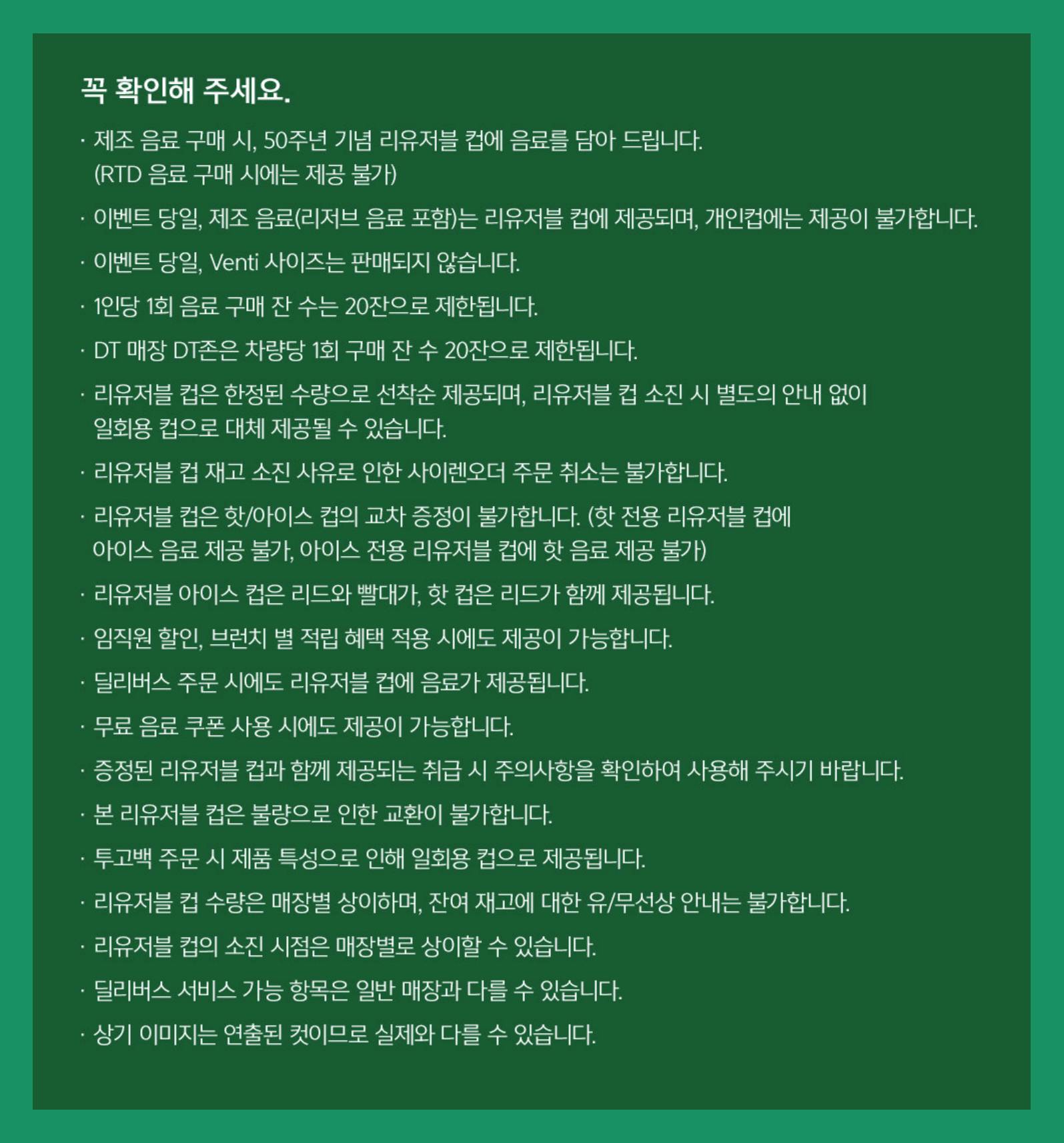 블로그에 리뷰하기 위해 유의사항을 꼼꼼히 살펴보고 방문했는데, 뜨거운 음료를 담는 컵과 차가운 음료를 담는 컵을 교차 증정이 불가하다고 하고, 벤티 사이즈의 음료는 제공되지 않는다고 합니다. 쿠폰을 통한 음료를 제공받아도 리유저블컵을 받을 수 있으며, 대부분의 음료에 제공되는 서비스이기 때문에 리유저블컵이 소진되기 전에 가급적 빨리 방문하는 게 이 이벤트의 핵심이었죠.