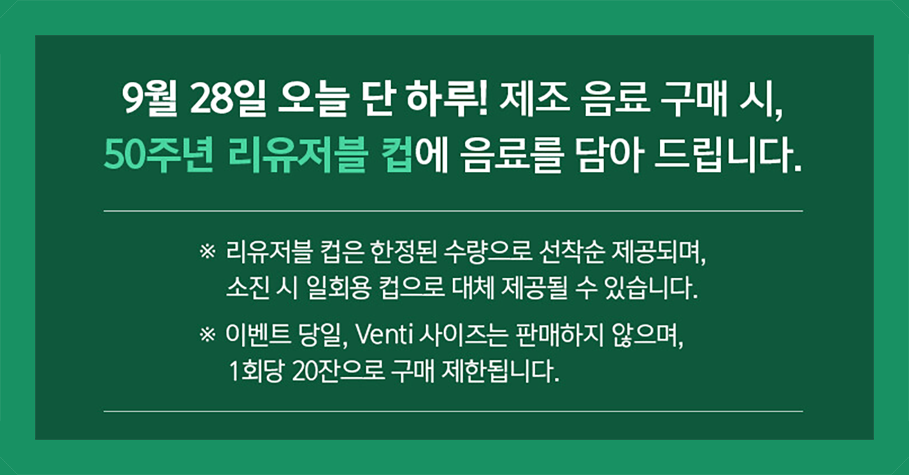 '리유저블컵 데이'란 스타벅스에서 50주년을 기념하여 일회용품 사용을 줄이기 위한 캠페인의 일종으로 스타벅스에서 음료를 주문하면 한정된 수량이지만 2021.09.28. 리유저블컵(텀블러)에 제공하는 이벤트를 진행하였습니다.