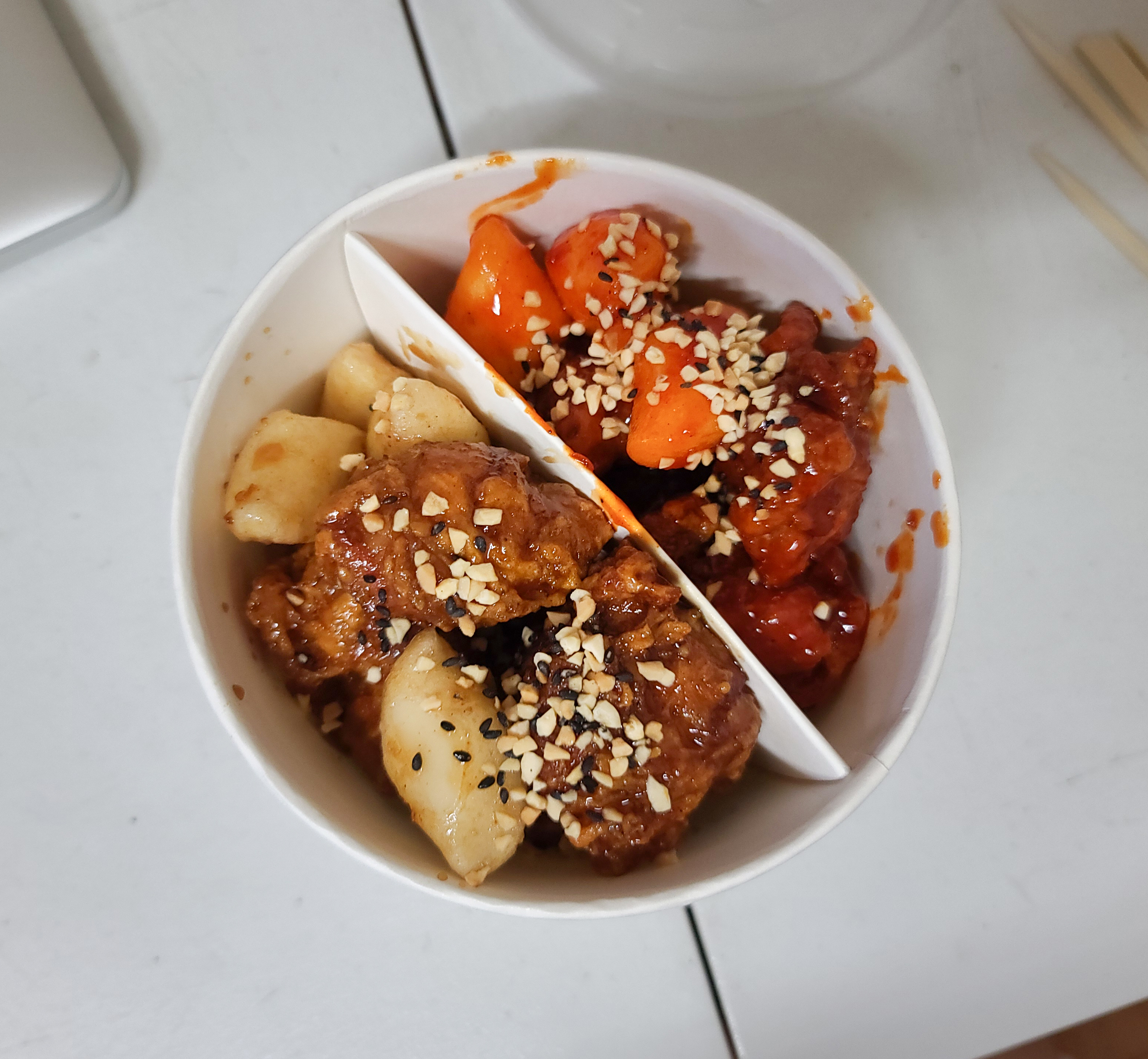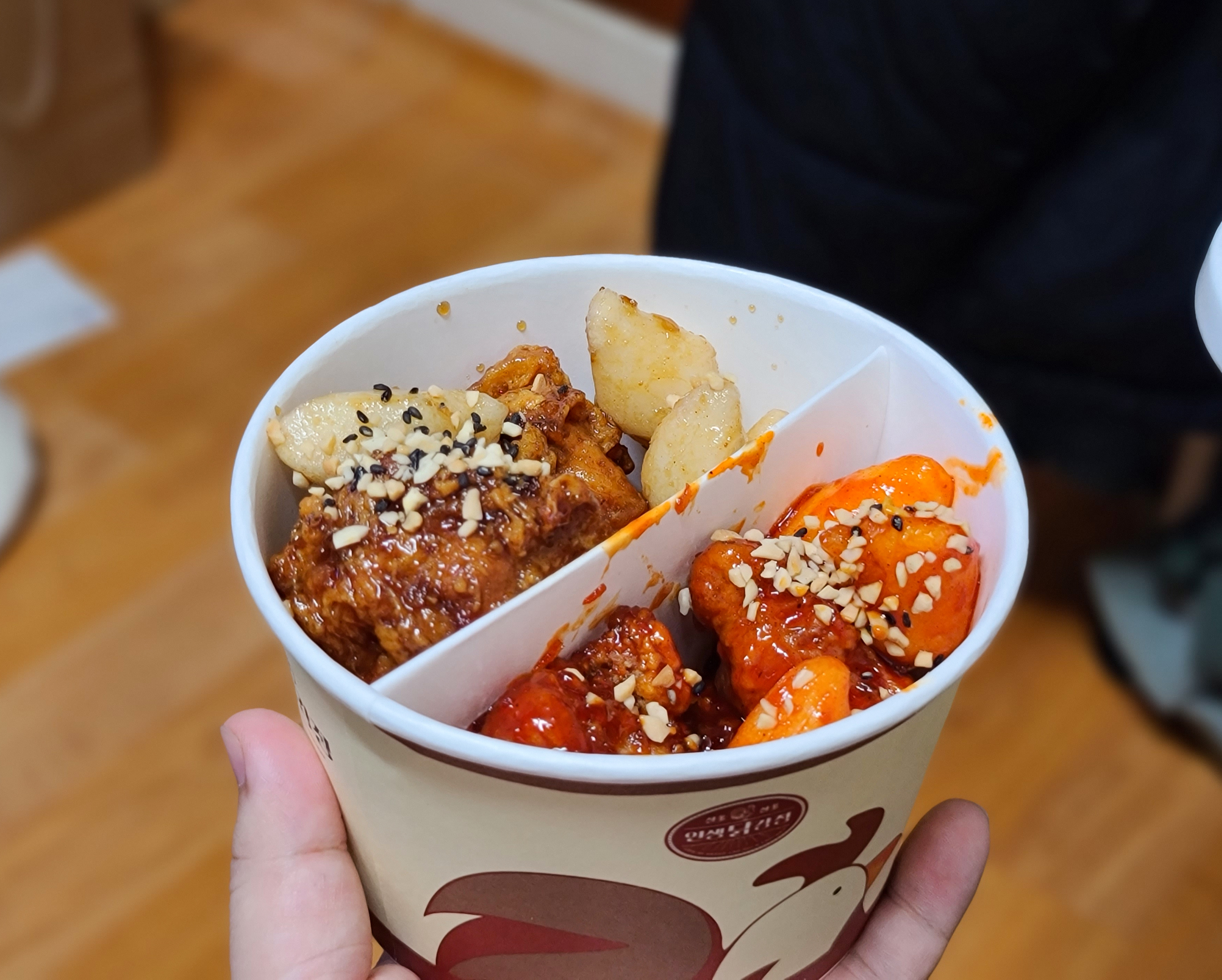 인생닭강정 수원왕갈비 닭강정과 매콤한인생 닭강정을 포장해왔는데, 컵에 칸막이 때문에 양이 조금 적게 들어간 것 같더라고요. 저는 배스킨라빈스 아이스크림처럼 섞여있어도 양만 많으면 좋은데요.(ㅋㅋ)