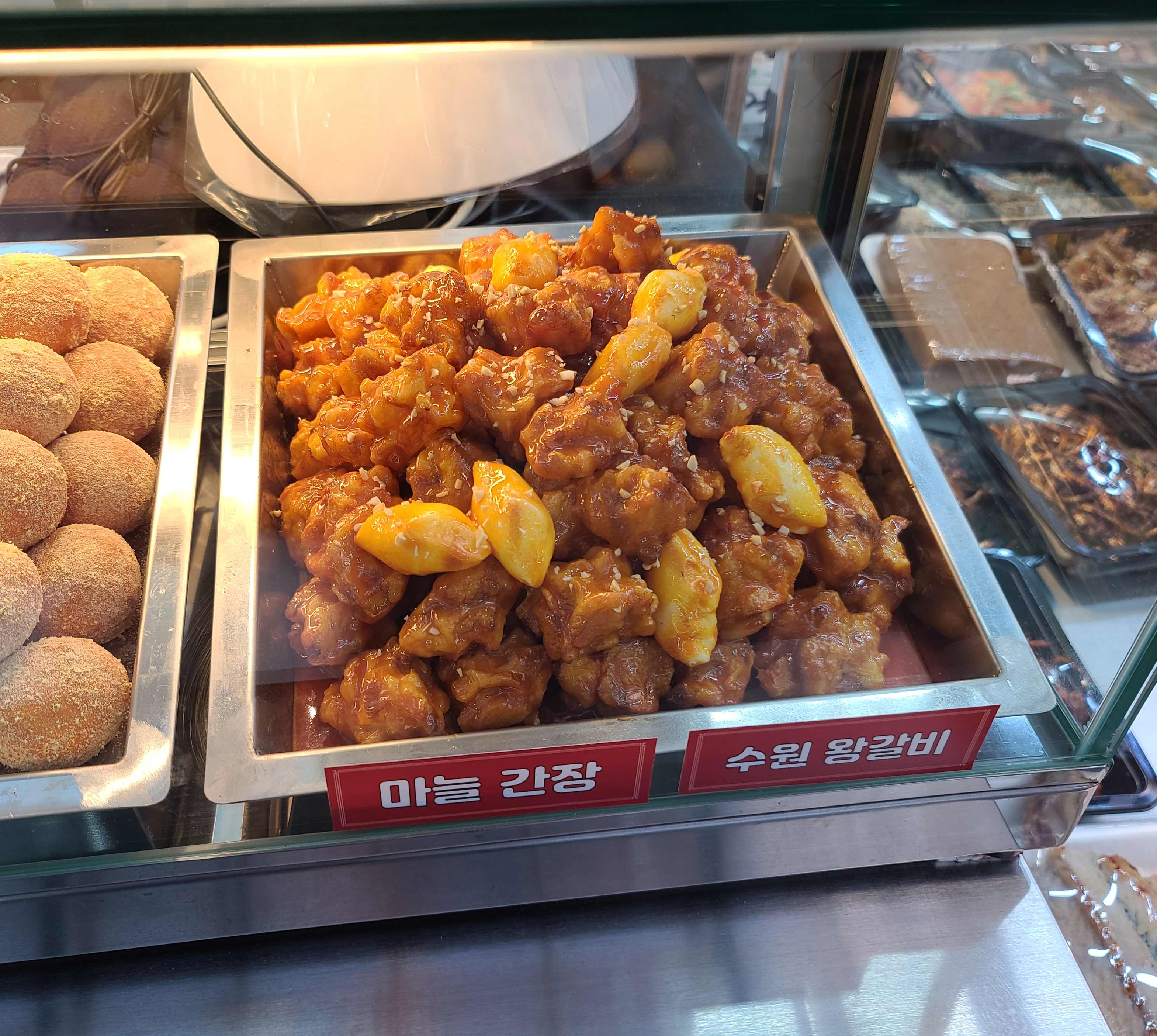 신사시장 인생닭강정 메뉴들의 모습입니다. 저는 반반 섞은 메뉴를 주문했는데 수원왕갈비 닭강정과 매콤한인생 닭강정을 섞어서 주문했습니다. 중간 사이즈의 컵으로 포장했습니다.