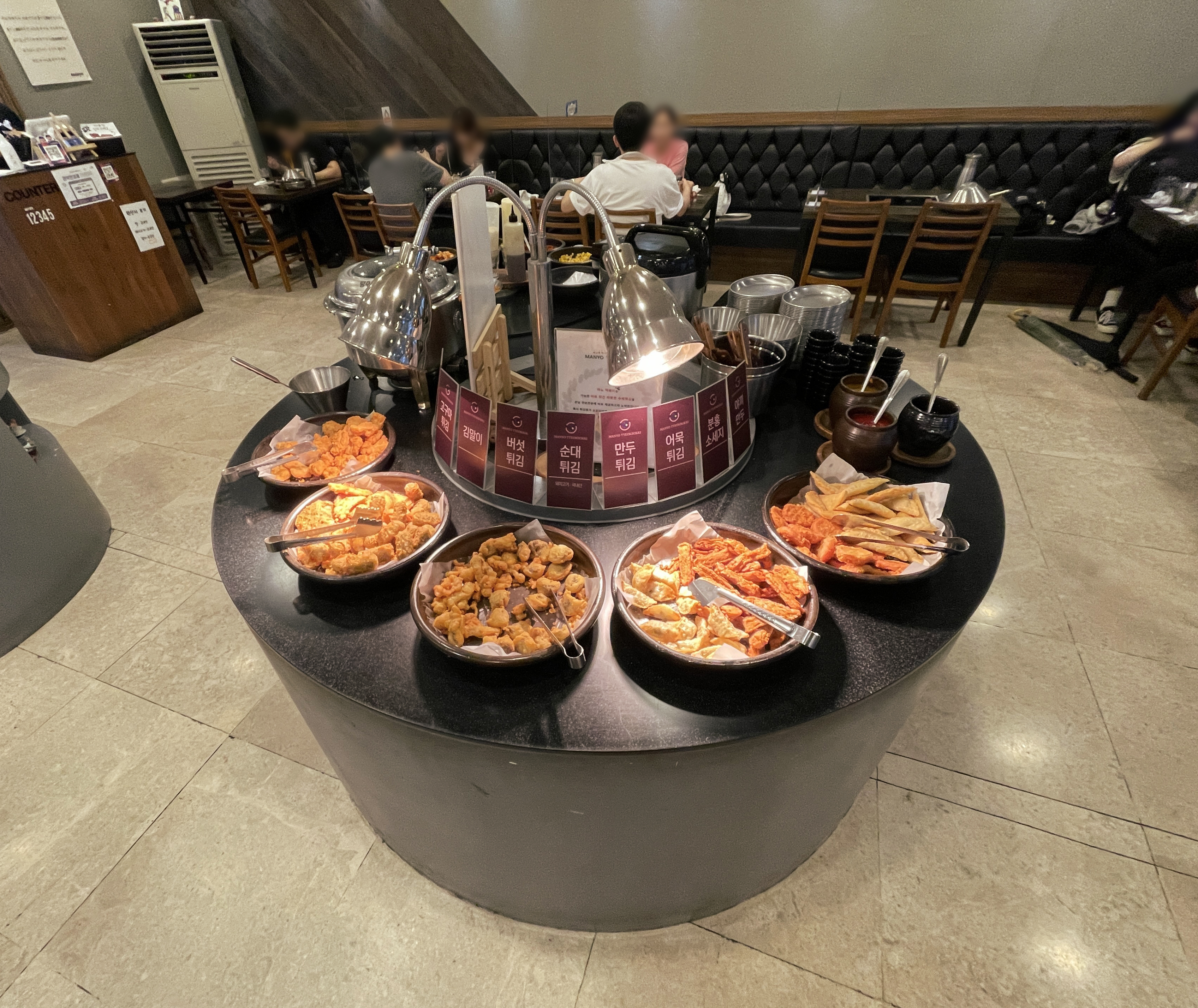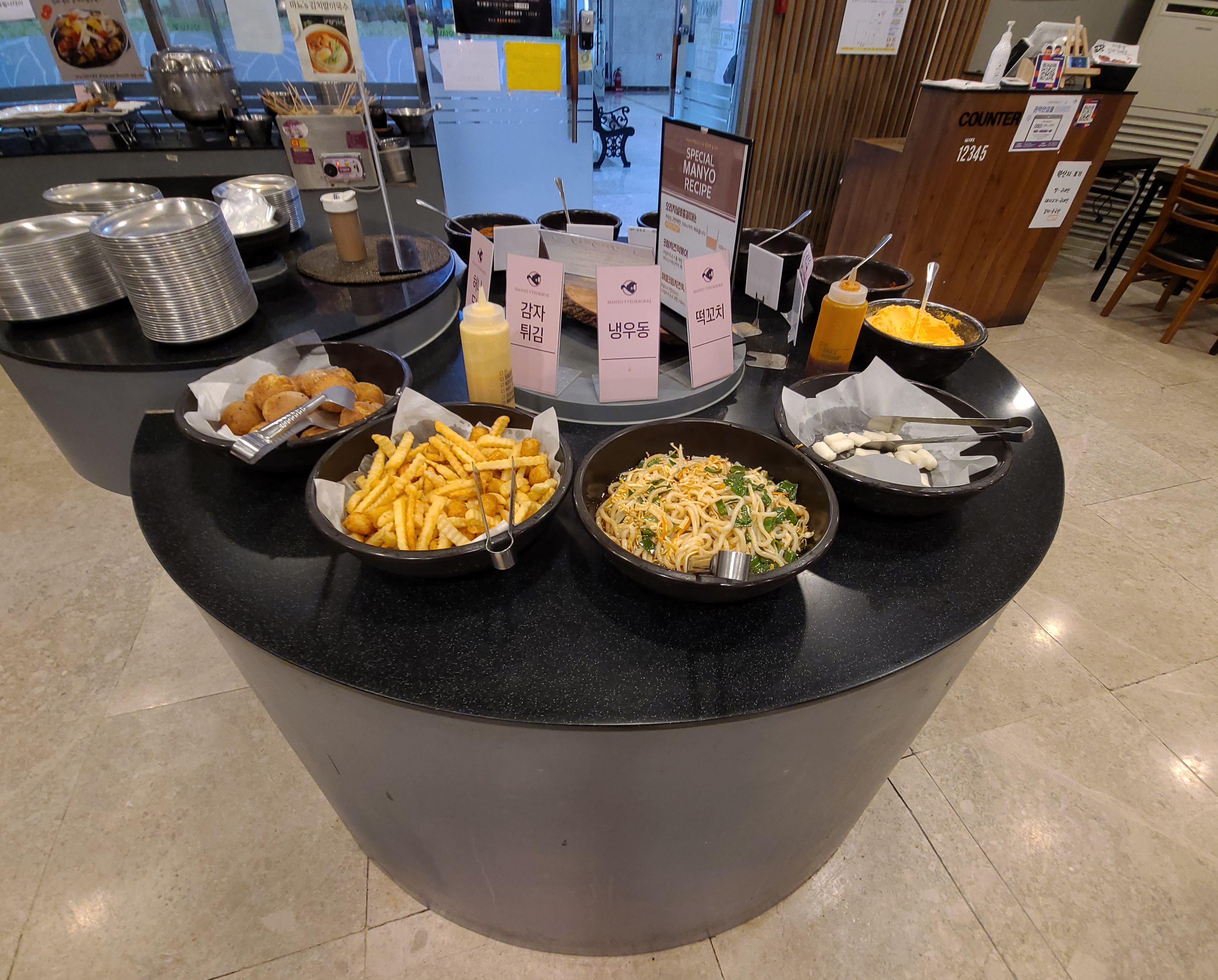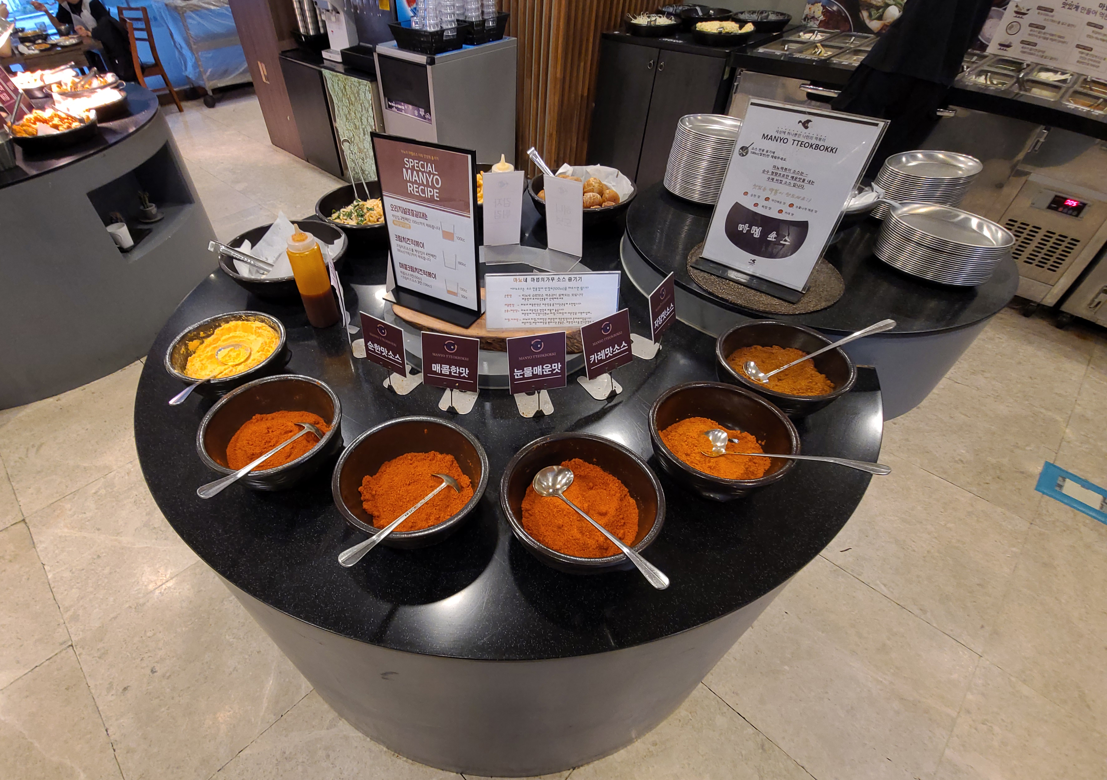 저는 주로 혼자 식사하러 다니거나, 많아도 2인 이서 식사를 하는데 이 날은 마뇨떡볶이에 혼자서 식사하러 방문했는데 원래는 1인 식사는 안된다고 하는데 특별히 허락해주셔서 혼자서 식사를 하게 되었습니다. 마뇨떡볶이 이용방법은 우선 떡과 채소, 어묵, 라면・당면 사리 등 떡볶이에 넣고 싶은 재료들을 골라 담고 선호하는 맛의 가루 소스를 담아서 떡볶이를 만들면 되었습니다.