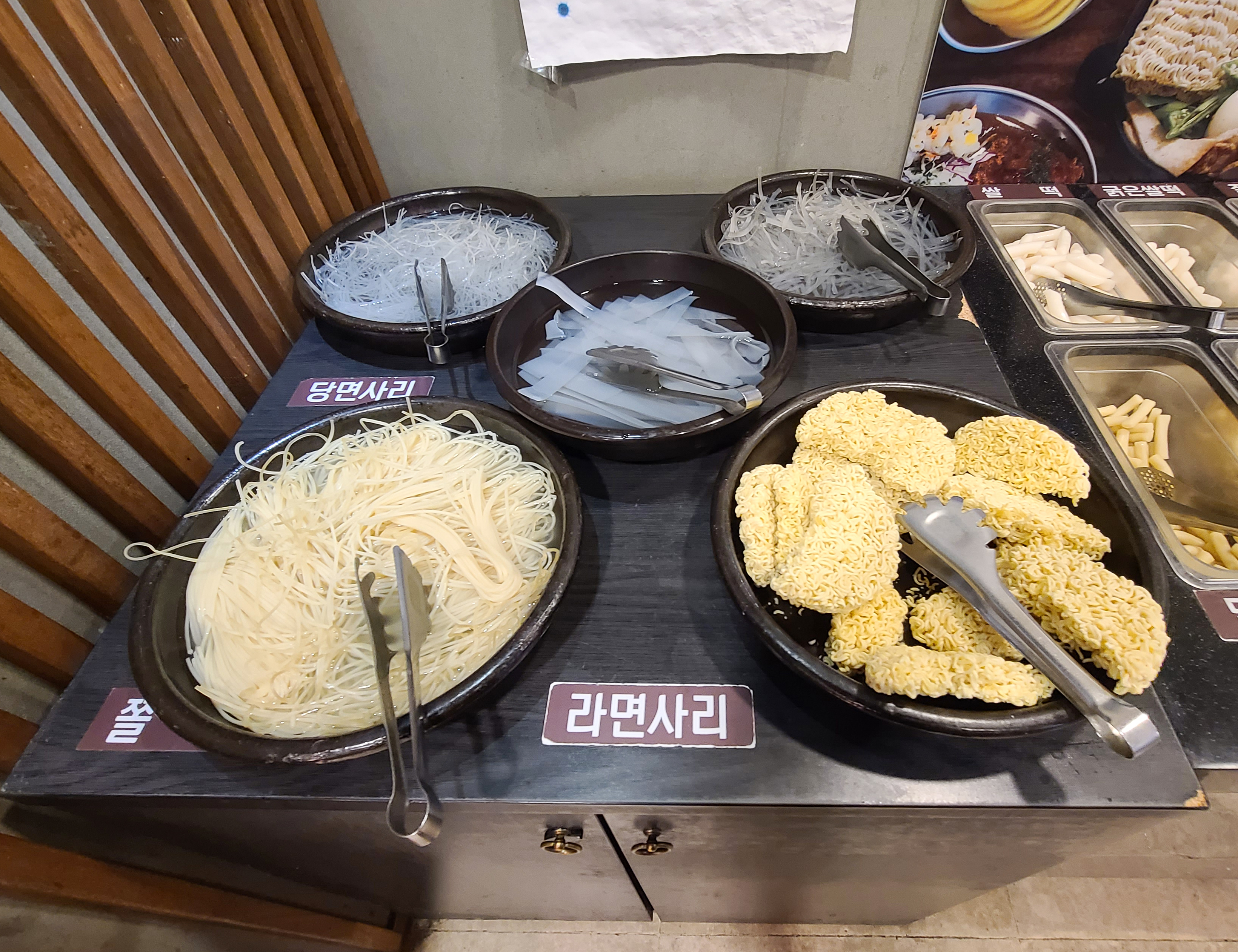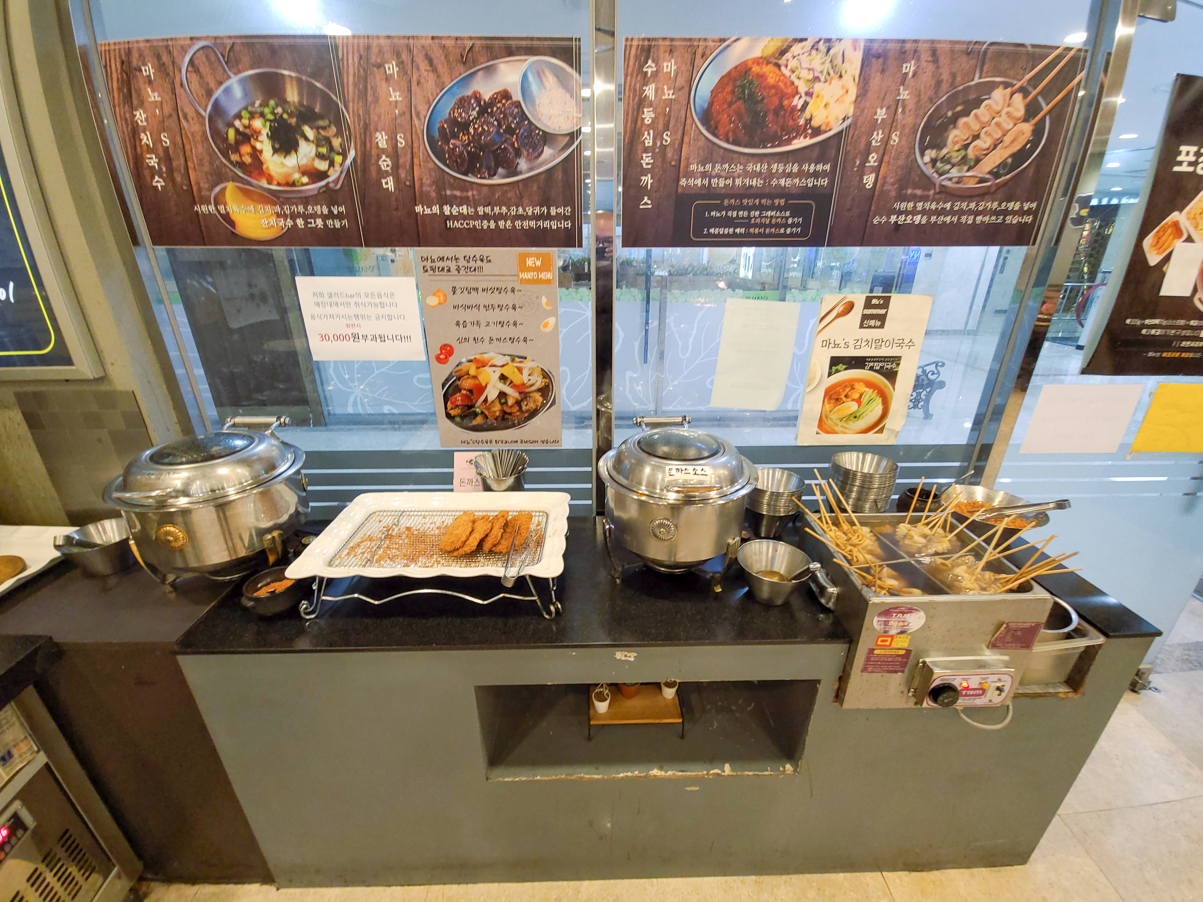 여러 가지 튀김 외에도 샐러드나 허니도넛, 어묵, 돈까스, 김치말이국수, 볶음밥 재료, 냉우동, 떡꼬치 등이 있어서 배고플 때 다양한 메뉴를 맛볼 수 있다는 게 마뇨떡볶이의 가장 큰 매력이 아닐까 싶습니다.