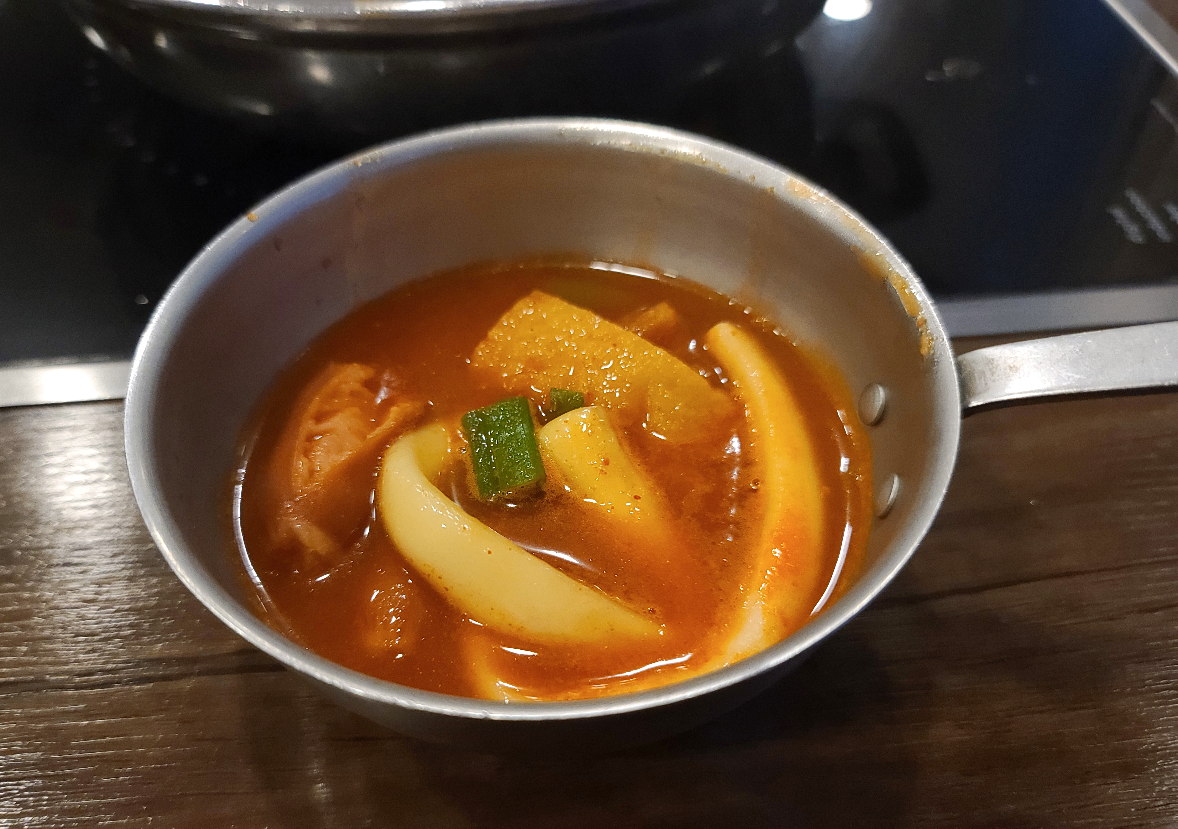 저도 취향에 맞는 떡볶이 재료들을 그릇에 담아왔습니다. 떡볶이를 끓일 육수에 가져온 떡과 어묵, 채소와 소시지 등을 넣고 소스를 넣어 불을 올려 끓여주었습니다.