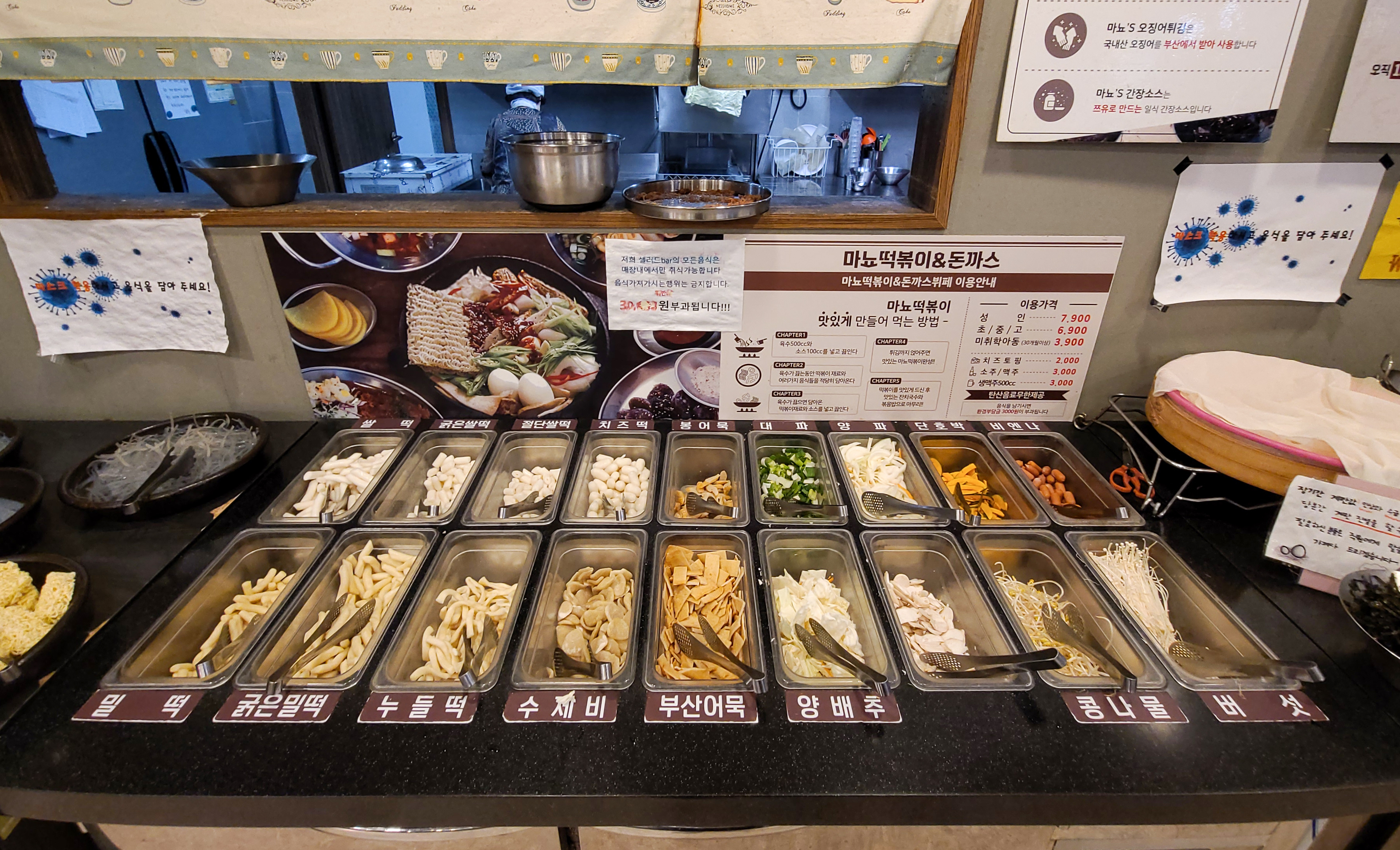 저는 주로 혼자 식사하러 다니거나, 많아도 2인 이서 식사를 하는데 이 날은 마뇨떡볶이에 혼자서 식사하러 방문했는데 원래는 1인 식사는 안된다고 하는데 특별히 허락해주셔서 혼자서 식사를 하게 되었습니다. 마뇨떡볶이 이용방법은 우선 떡과 채소, 어묵, 라면・당면 사리 등 떡볶이에 넣고 싶은 재료들을 골라 담고 선호하는 맛의 가루 소스를 담아서 떡볶이를 만들면 되었습니다.