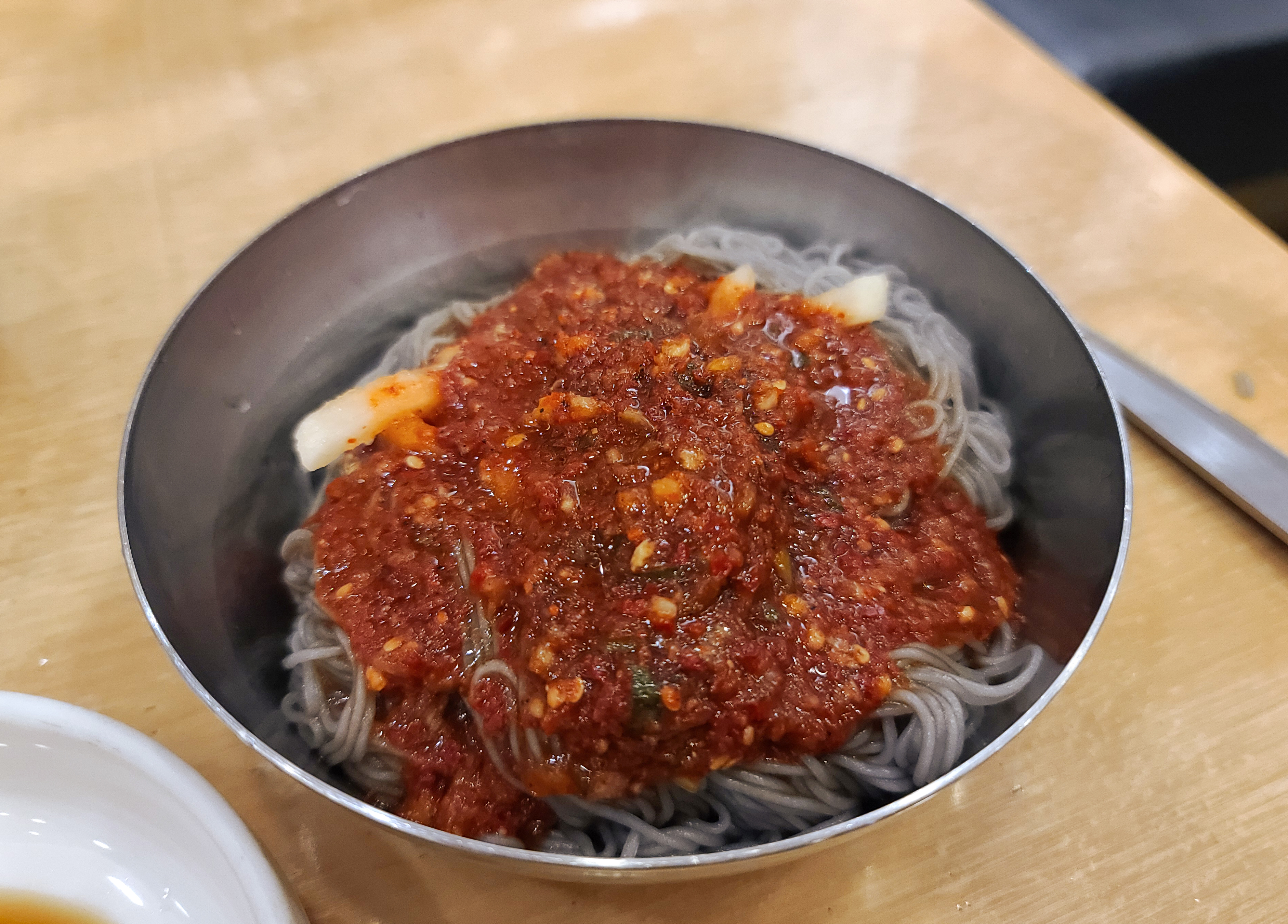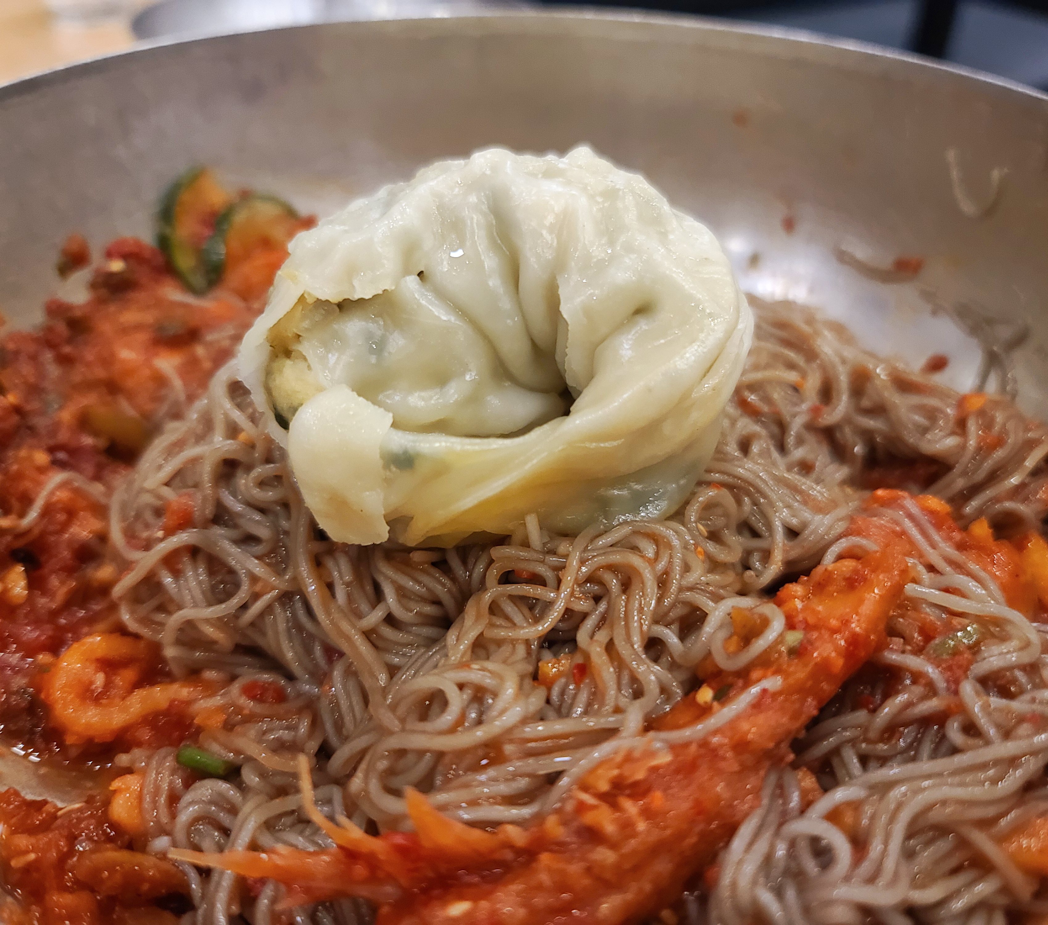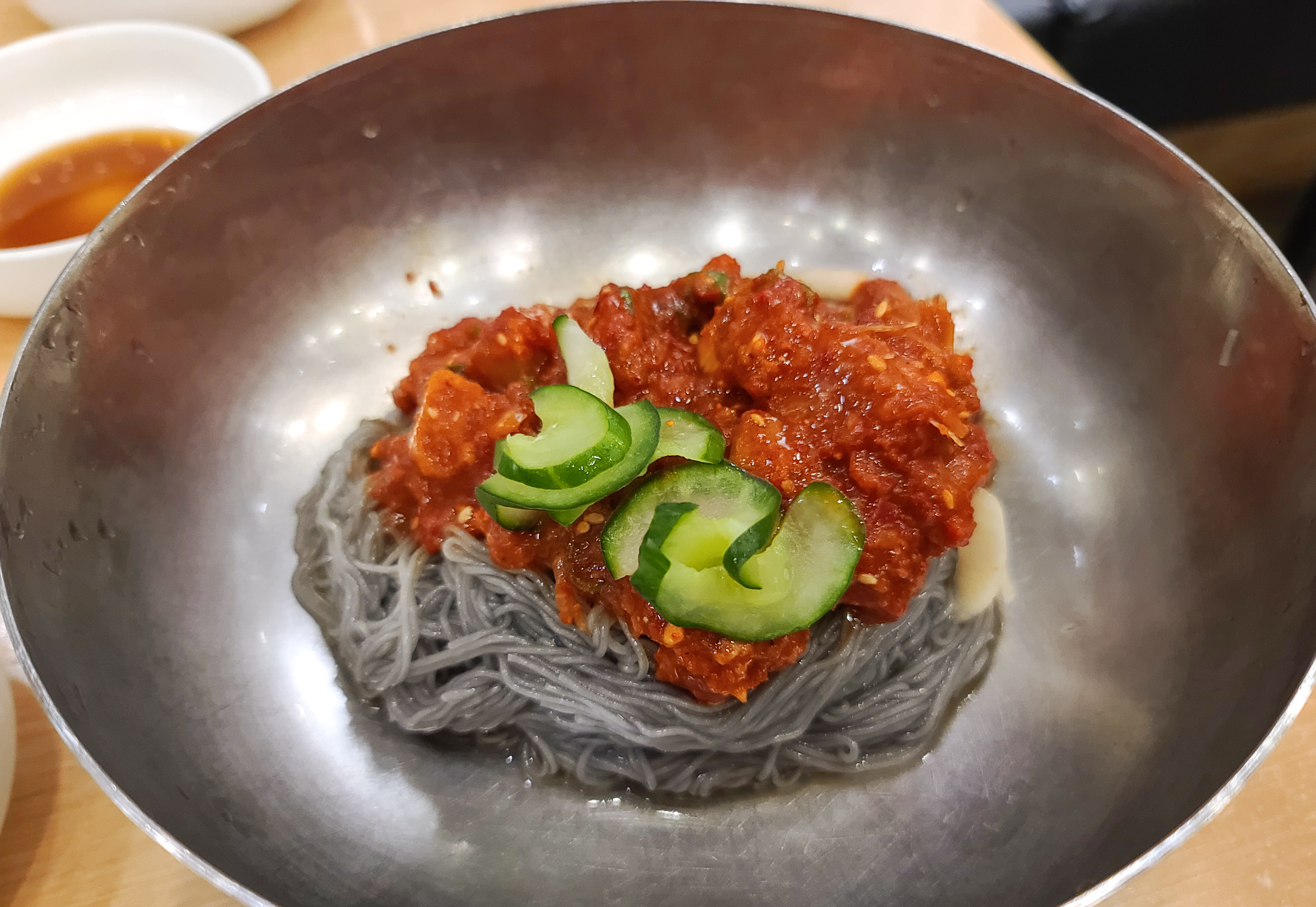 냉면 추가 사리를 주문하여 만두와 함께 먹었습니다. 평양냉면은 툭툭 끊기듯 육향이 있는 심심한 국물 맛이 특징이라면, 함흥냉면은 면이 찰기가 있고 탱글탱글한 게 특징이죠. 비빔장이랑 잘 어울려서 간이 센 만두와 곁들이니 맛있었습니다. 평양냉면은 심심한 이북식 만두가 잘 어울리고요.