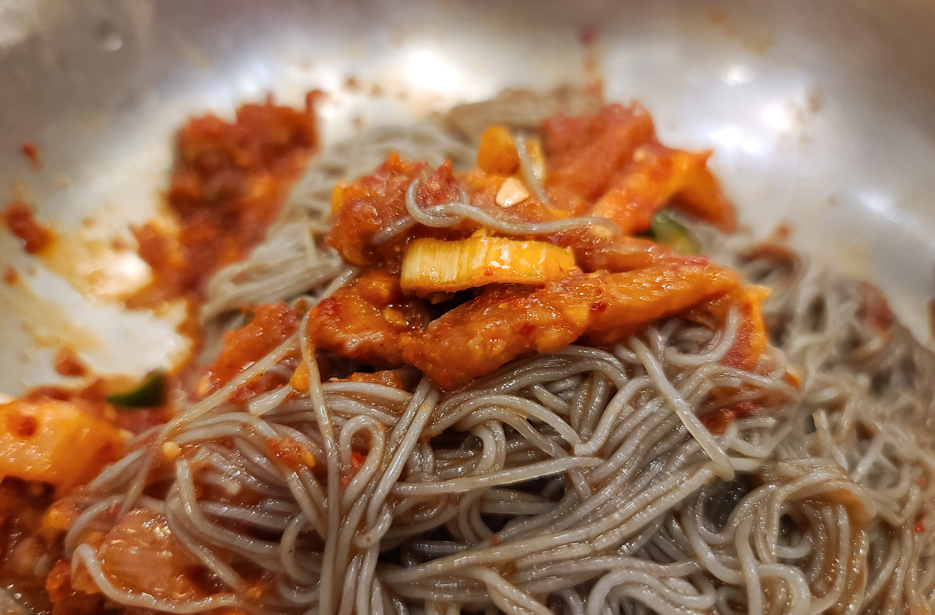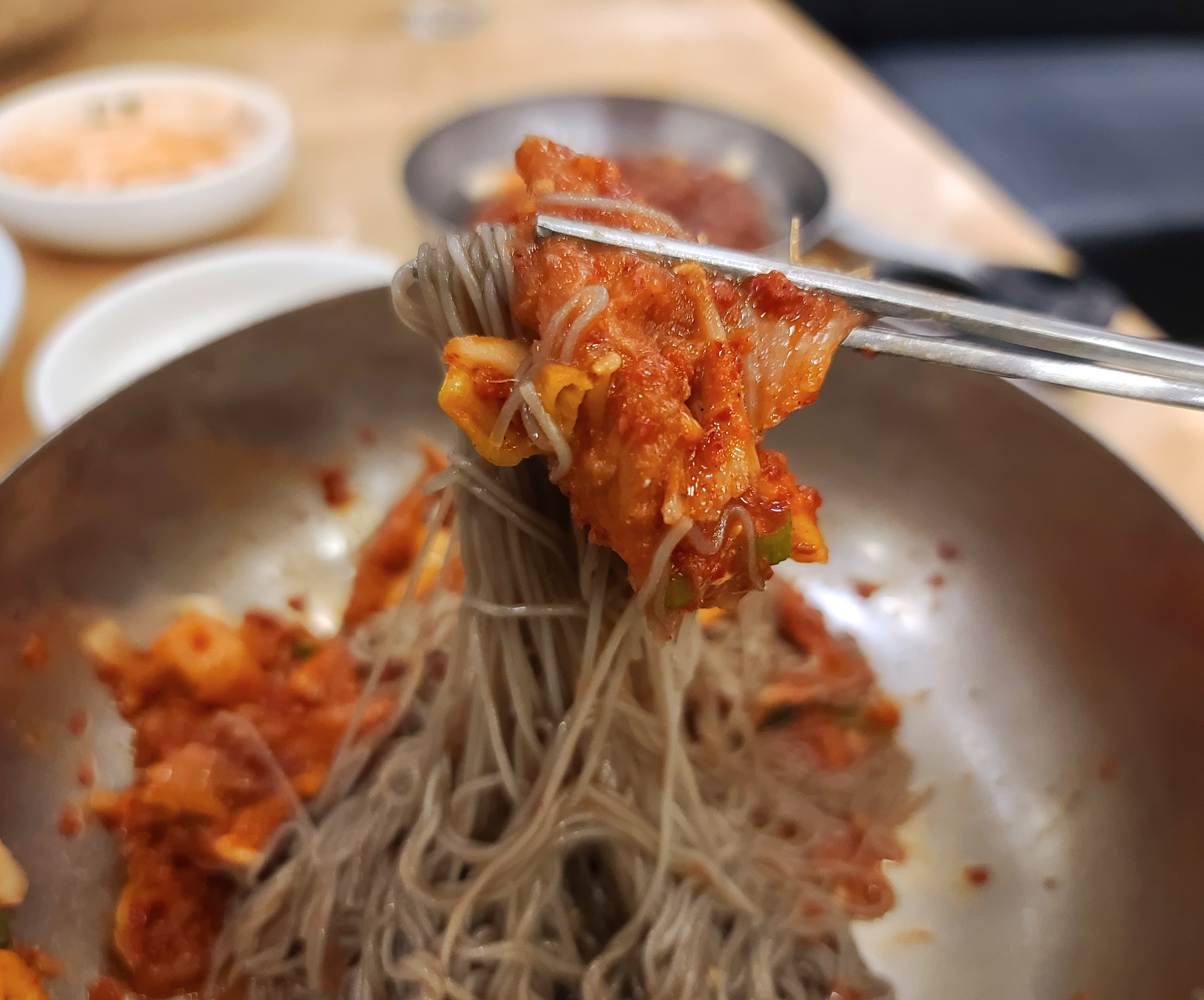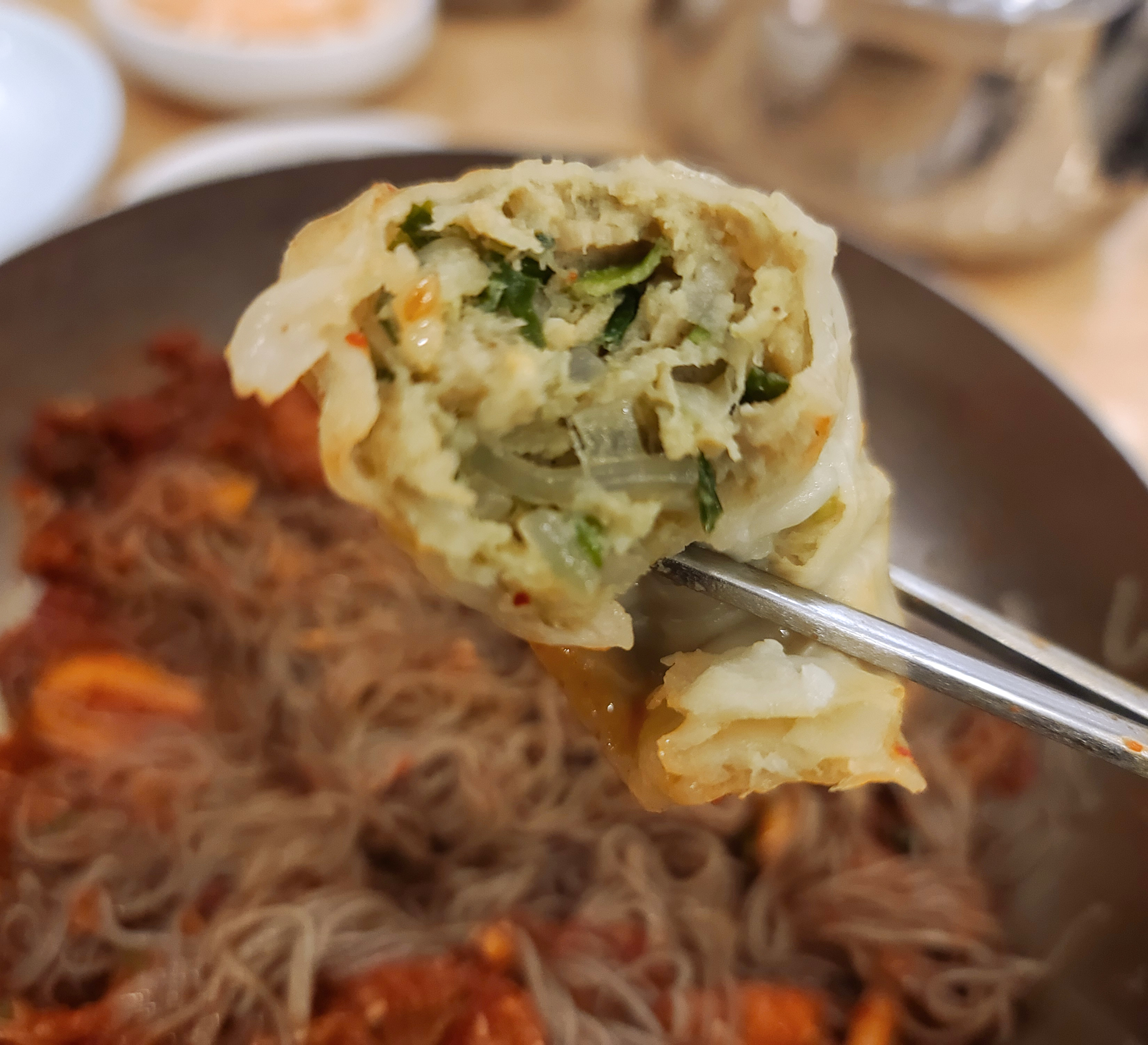 냉면 추가 사리를 주문하여 만두와 함께 먹었습니다. 평양냉면은 툭툭 끊기듯 육향이 있는 심심한 국물 맛이 특징이라면, 함흥냉면은 면이 찰기가 있고 탱글탱글한 게 특징이죠. 비빔장이랑 잘 어울려서 간이 센 만두와 곁들이니 맛있었습니다. 평양냉면은 심심한 이북식 만두가 잘 어울리고요.