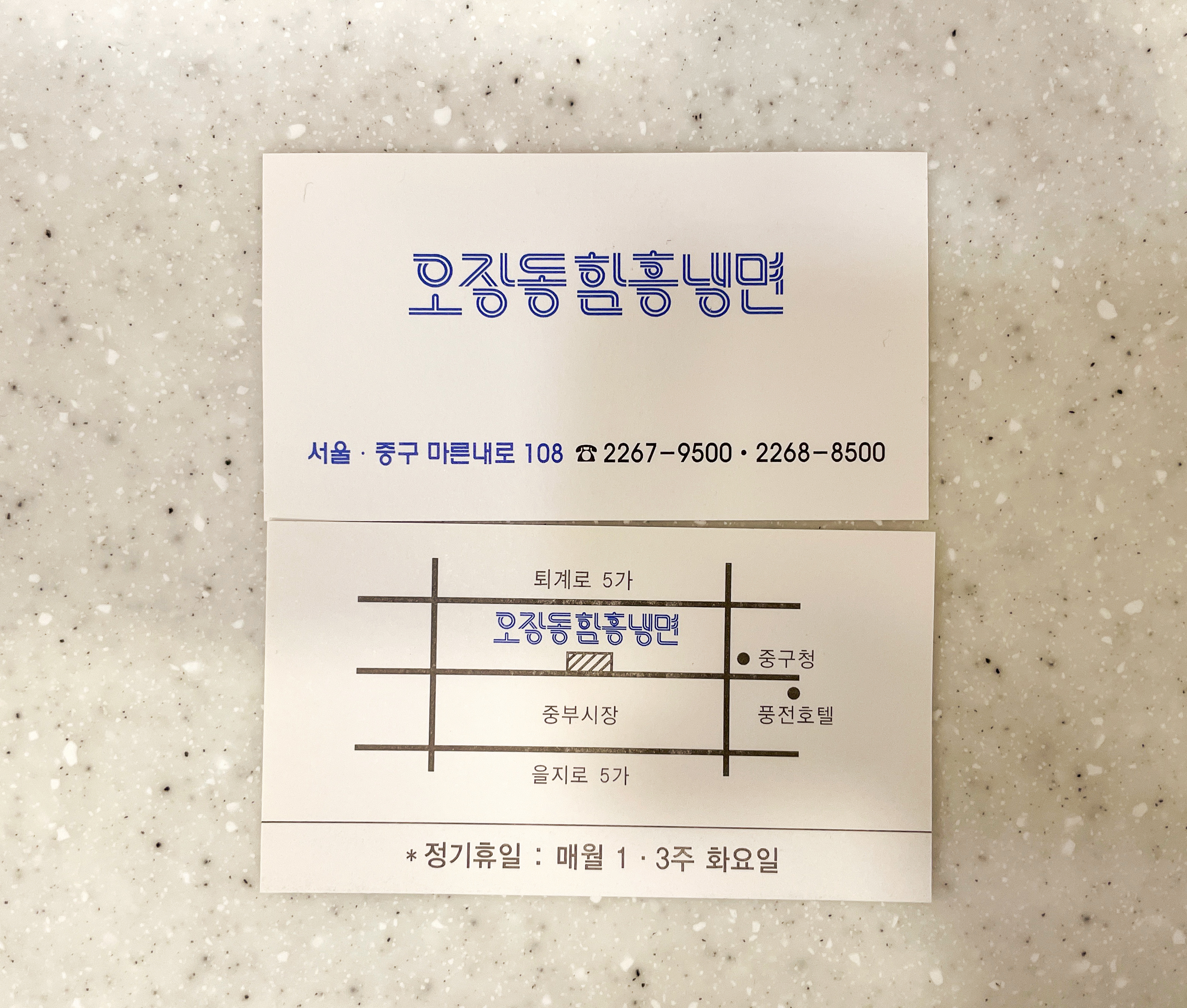 최근 지인과 함께 오장동함흥냉면을 먹으러 서울 중구 오장동으로 향했습니다. 이 가게는 탄력 있는 면발과 빨간 양념장으로 유명한 가게인데요, 가게 영업시간은 11:00~20:30 까지이며, 매월 1, 3 째주 화요일은 휴무라고 합니다.