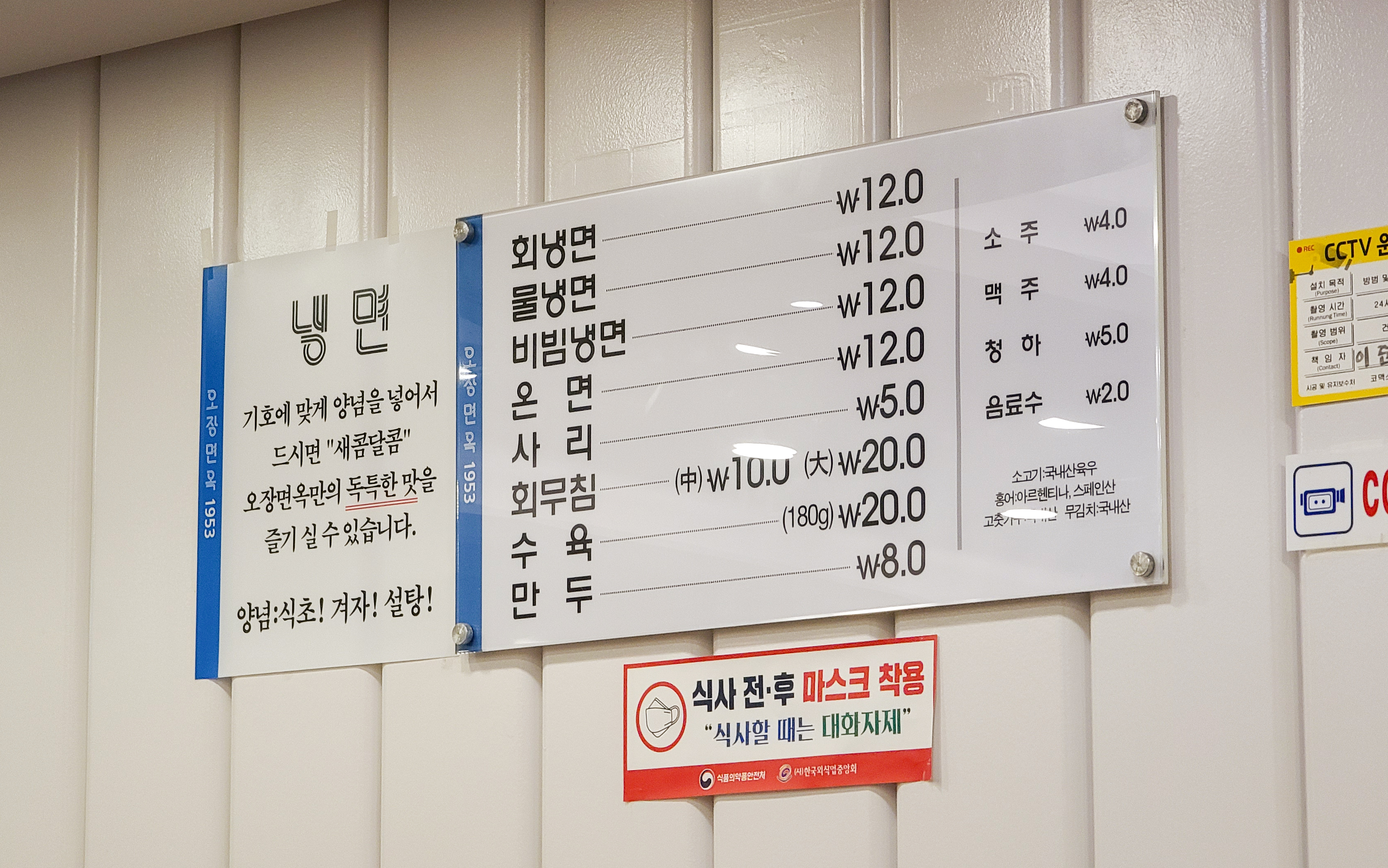 가게 외부에는 미슐랭 인증마크와 서울 미래유산 인증 등이 붙어있었고, 옥외 메뉴판을 통해 미리 가격을 확인하고 입장할 수 있었습니다. 가게에 들어가면 널찍한 매장이 있었고, 오장동 함흥냉면을 먹으러 온 손님 대부분 빨간 양념이 있는 비빔냉면이나 회냉면을 선택하여 드시더라고요.