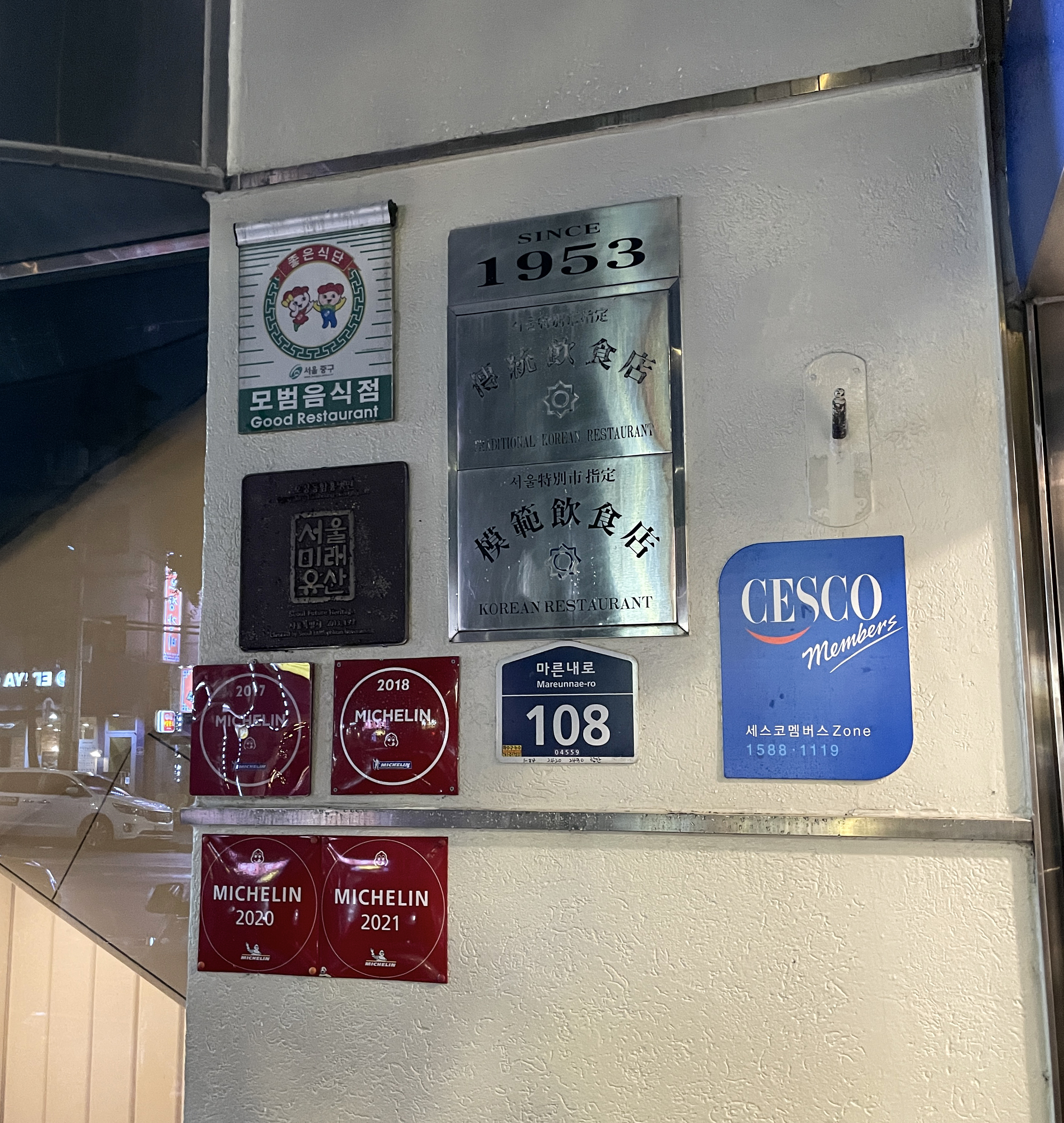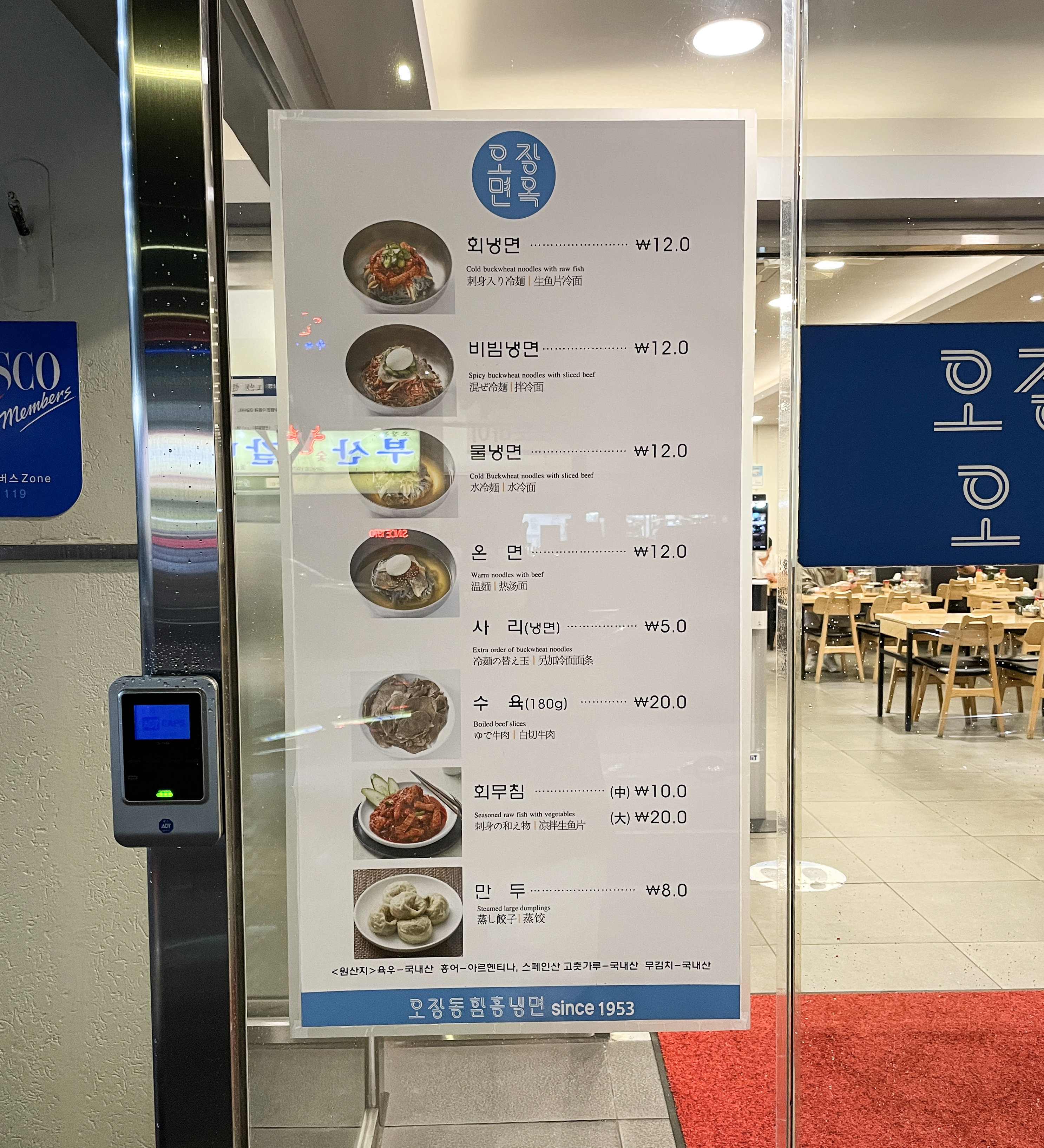 가게 외부에는 미슐랭 인증마크와 서울 미래유산 인증 등이 붙어있었고, 옥외 메뉴판을 통해 미리 가격을 확인하고 입장할 수 있었습니다. 가게에 들어가면 널찍한 매장이 있었고, 오장동 함흥냉면을 먹으러 온 손님 대부분 빨간 양념이 있는 비빔냉면이나 회냉면을 선택하여 드시더라고요.