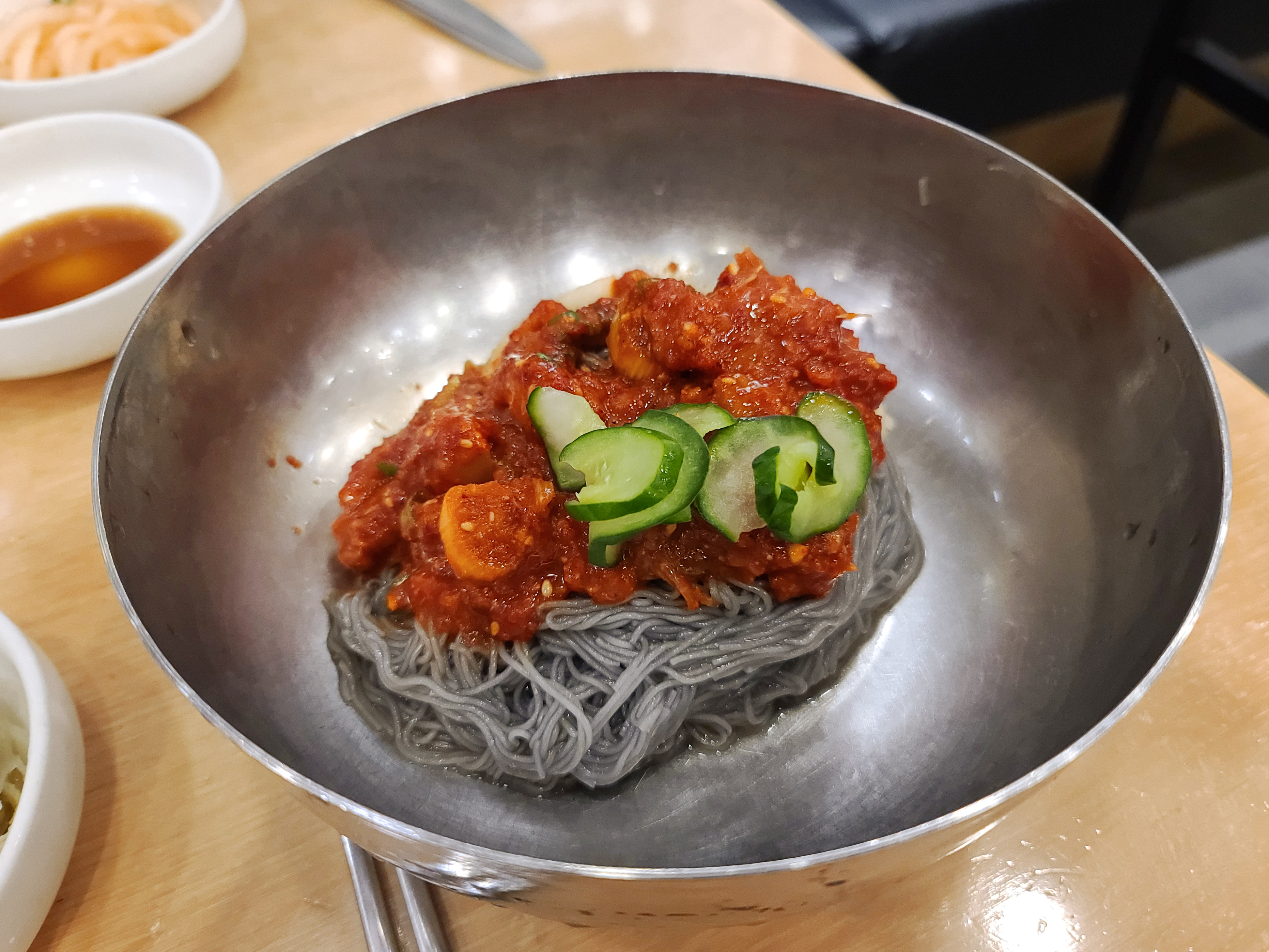 냉면 추가 사리를 주문하여 만두와 함께 먹었습니다. 평양냉면은 툭툭 끊기듯 육향이 있는 심심한 국물 맛이 특징이라면, 함흥냉면은 면이 찰기가 있고 탱글탱글한 게 특징이죠. 비빔장이랑 잘 어울려서 간이 센 만두와 곁들이니 맛있었습니다. 평양냉면은 심심한 이북식 만두가 잘 어울리고요.