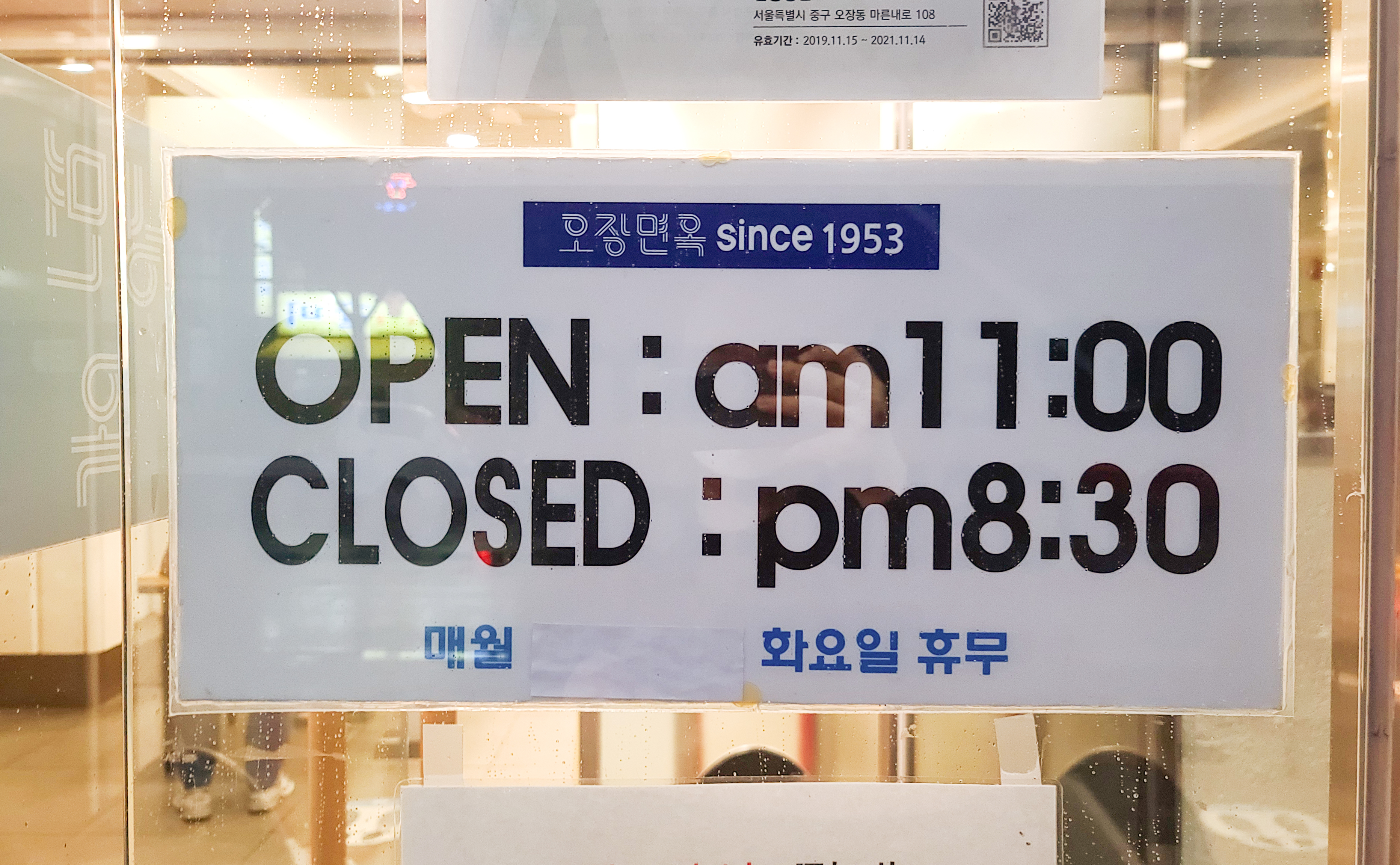 최근 지인과 함께 오장동함흥냉면을 먹으러 서울 중구 오장동으로 향했습니다. 이 가게는 탄력 있는 면발과 빨간 양념장으로 유명한 가게인데요, 가게 영업시간은 11:00~20:30 까지이며, 매월 1, 3 째주 화요일은 휴무라고 합니다.