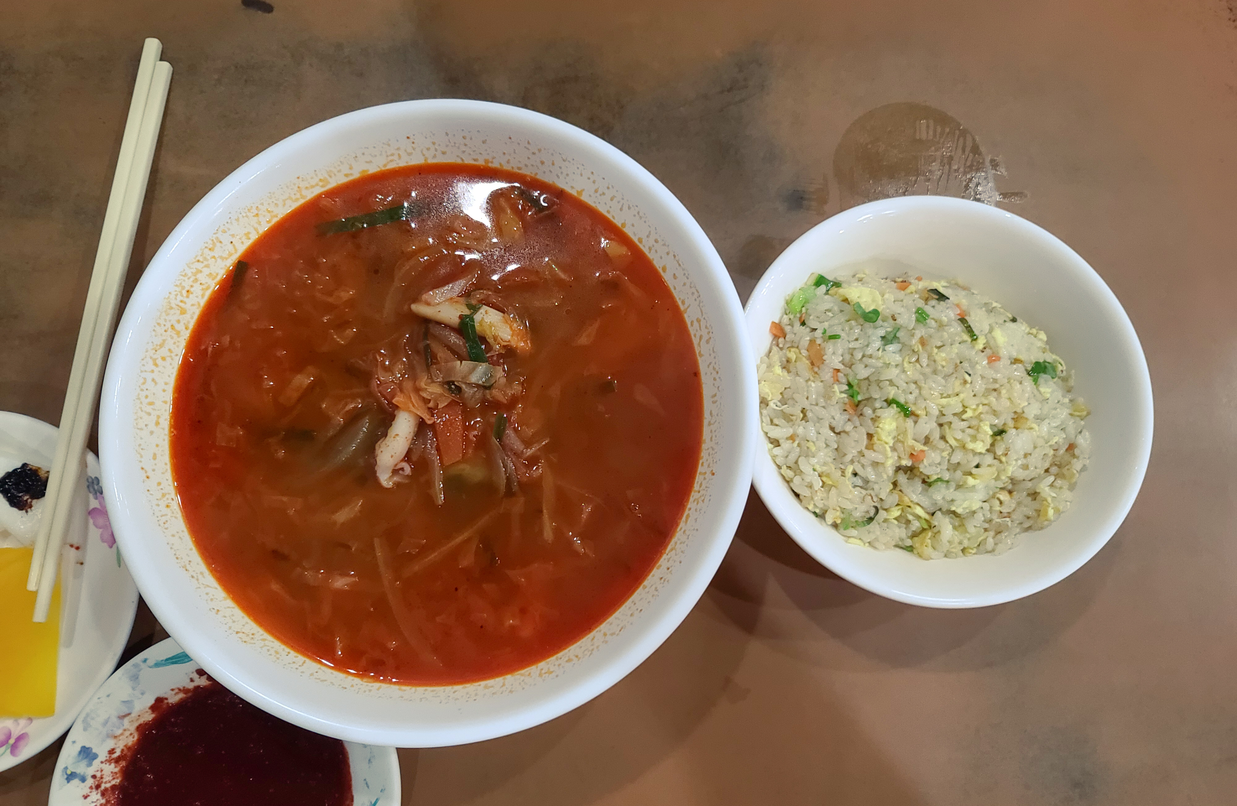 곧이어 주문한 짬뽕밥과 삼선짜장, 밑반찬이 나왔습니다. 배추김치는 백김치에 가까울 정도로 양념을 적게 한 것이 특징이었고, 짬뽕과 짜장도 자극적이지 않고 간이 세지 않더라고요.