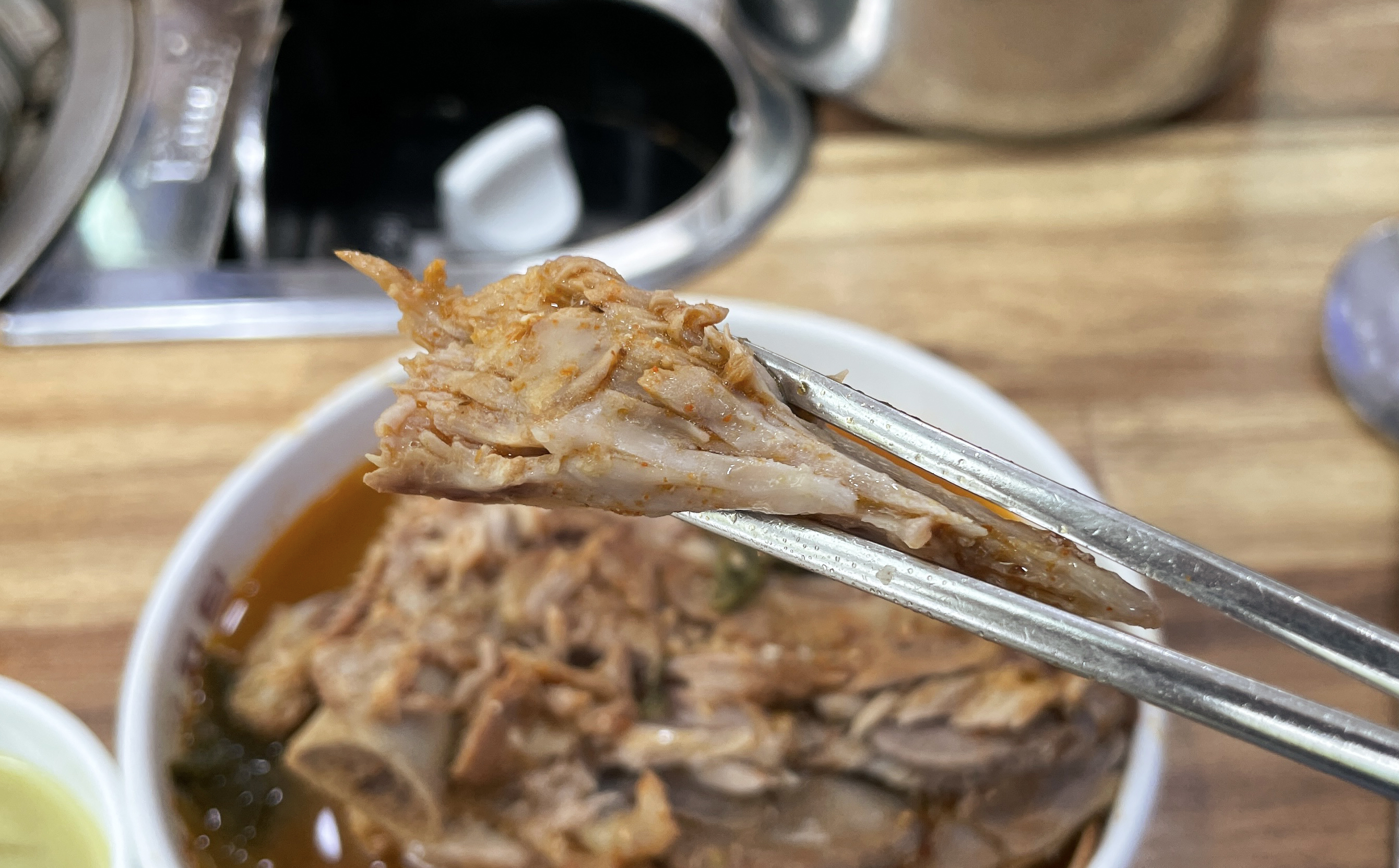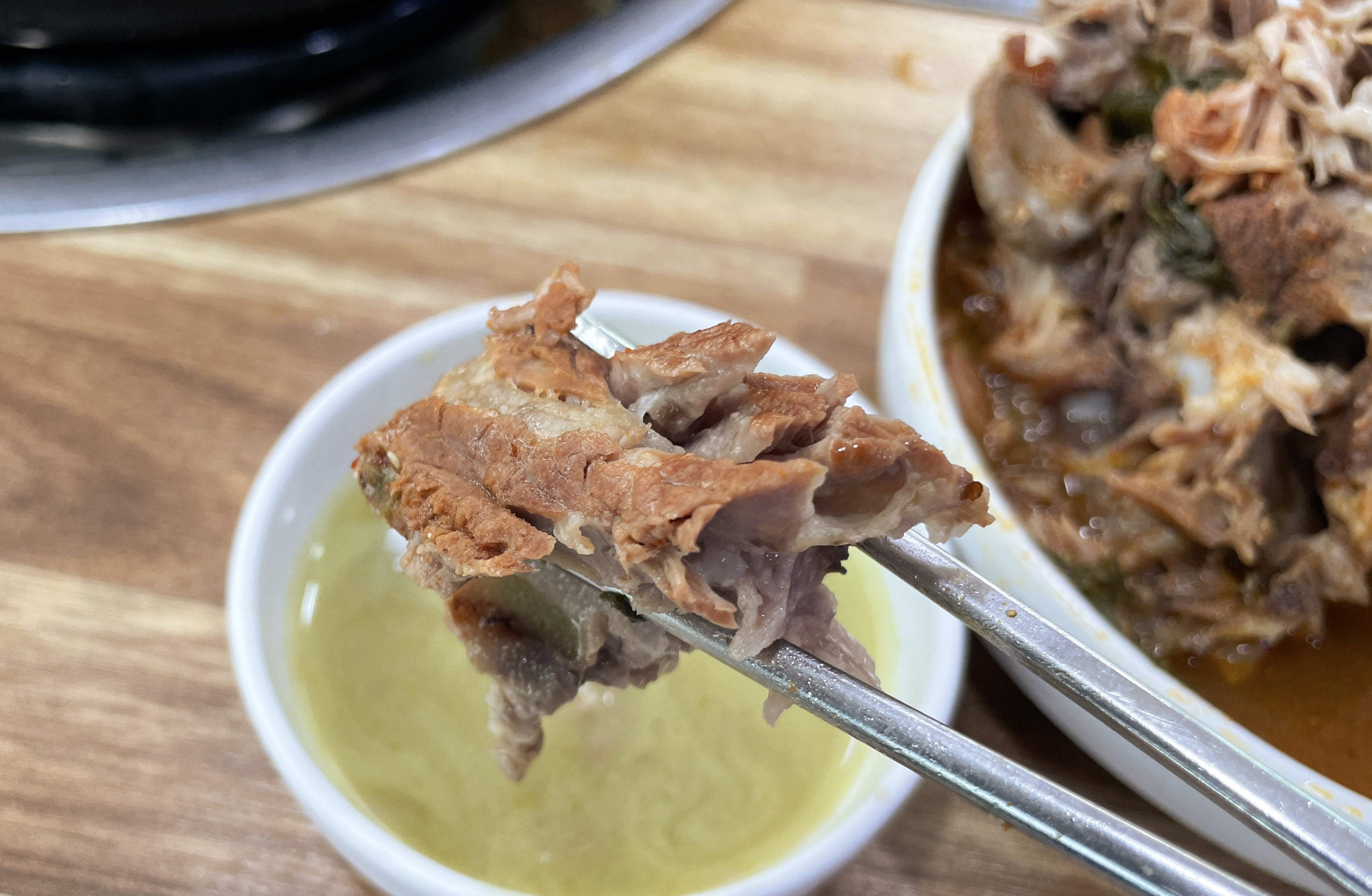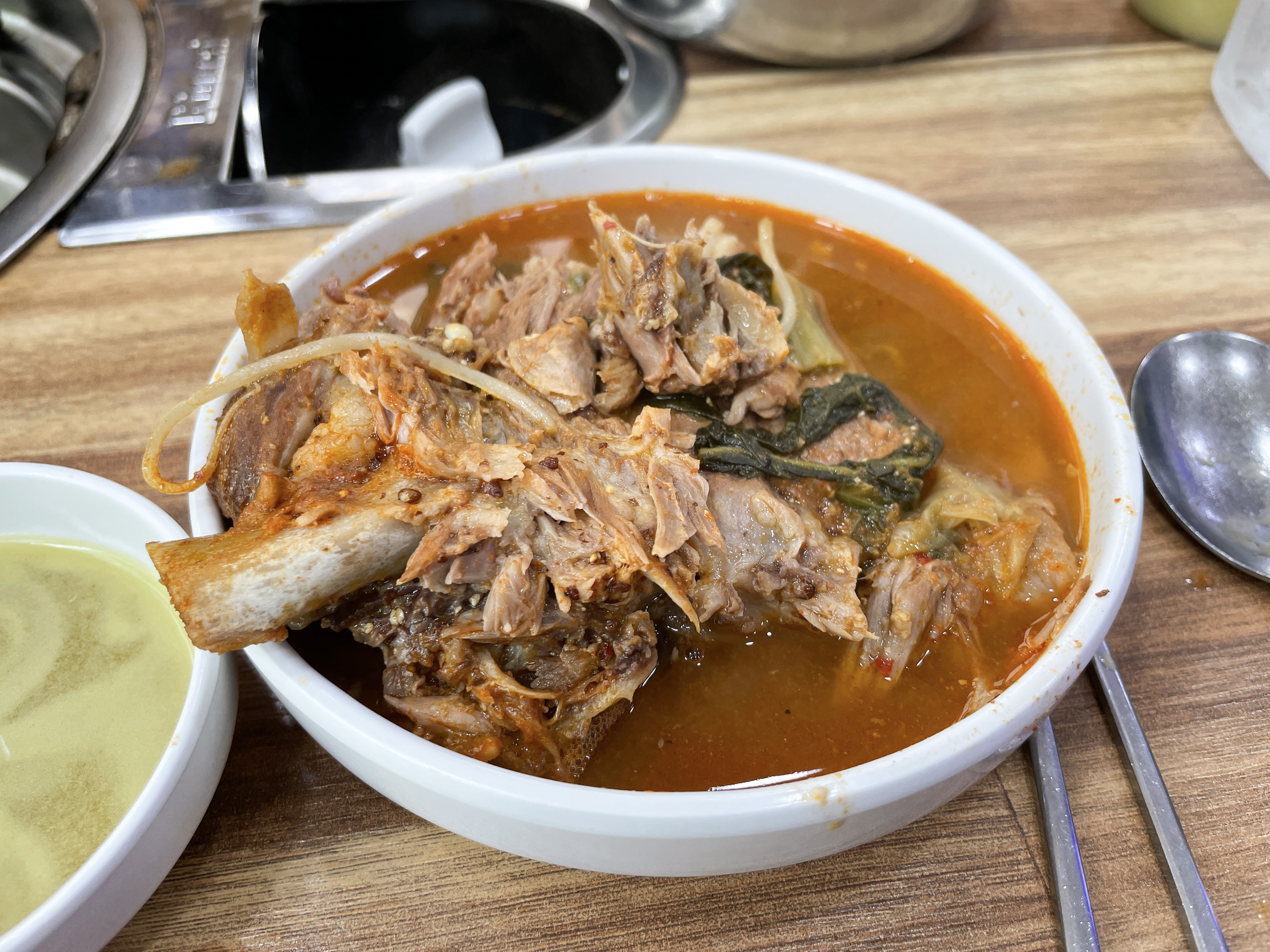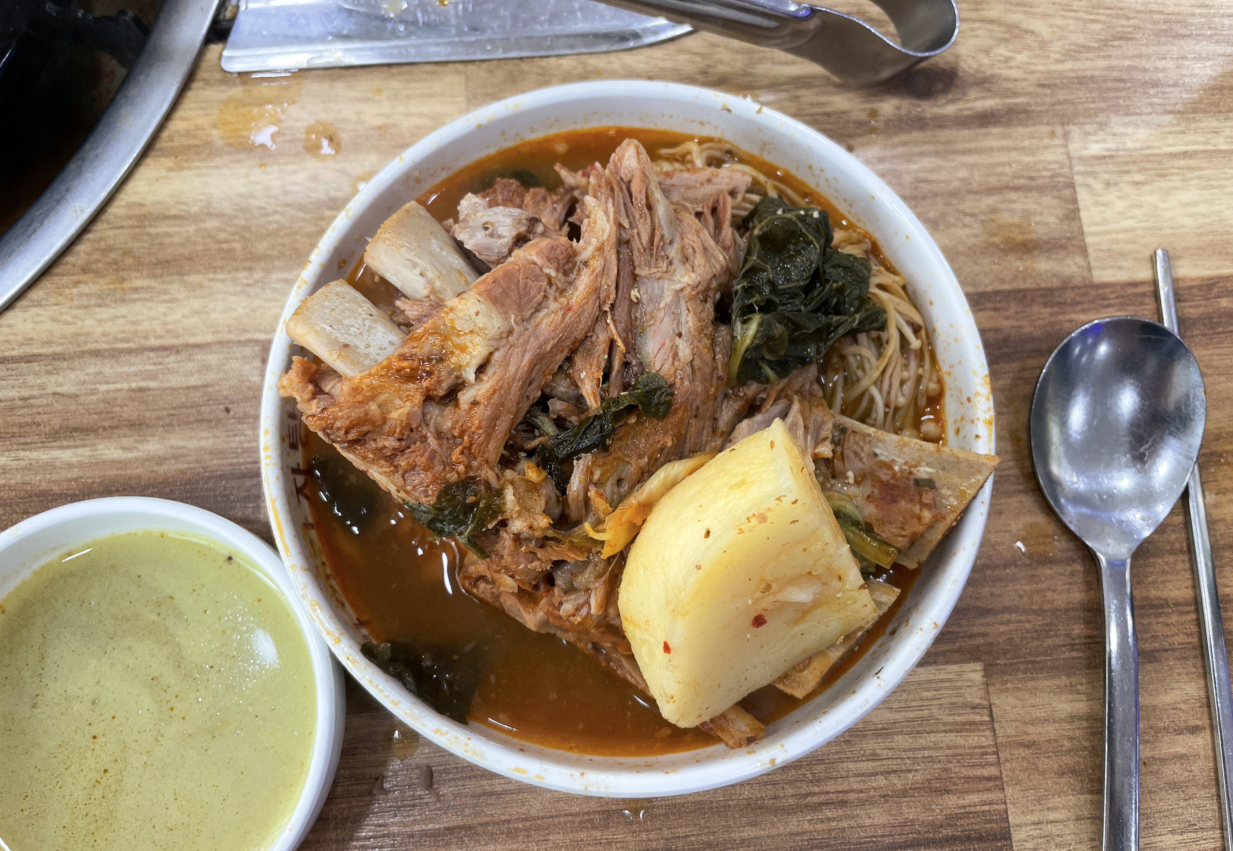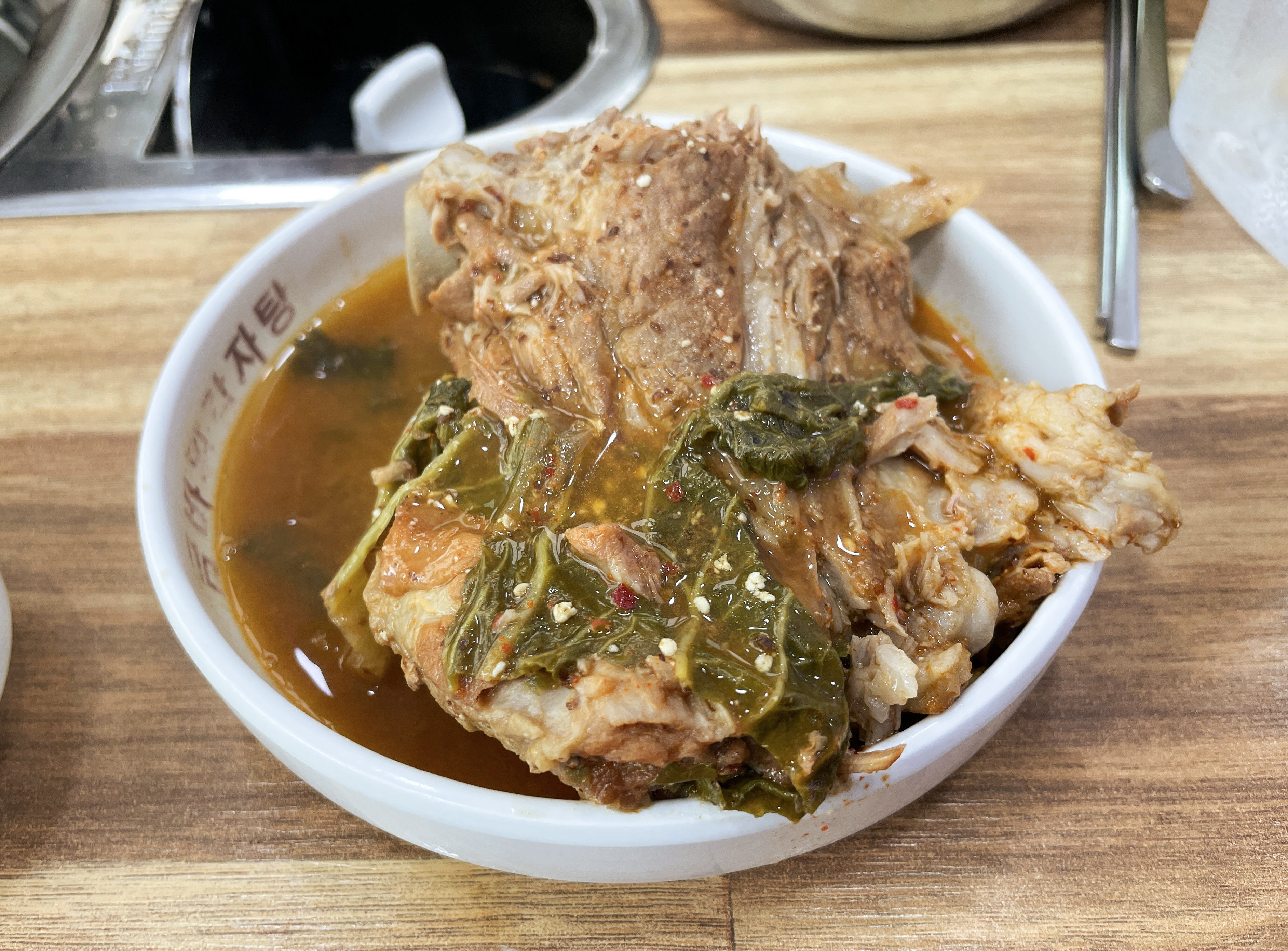 금바위감자탕의 감자탕이 어느 정도 끓었을 때 고기를 건져내서 먹었습니다. 감자탕의 고기는 큼직큼직해서 먹기에 좋았고, 앞서 설명한 것처럼 양도 넉넉해서 꽤 배불리 먹을 수 있었습니다. 국물의 간도 적당하고 맛도 좋아서 요즘같이 쌀쌀해지는 날씨에 먹기 참 좋은 메뉴였죠.
