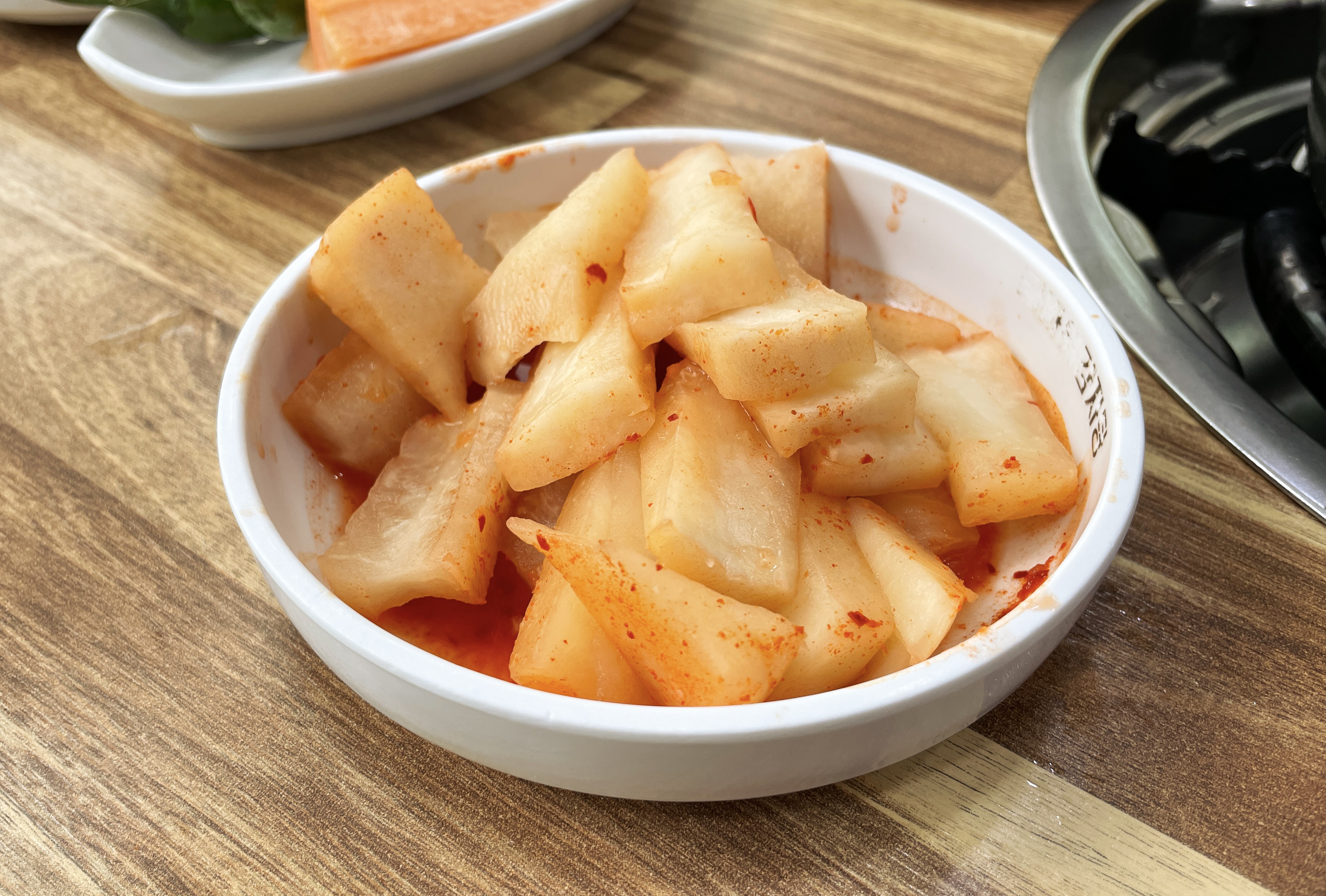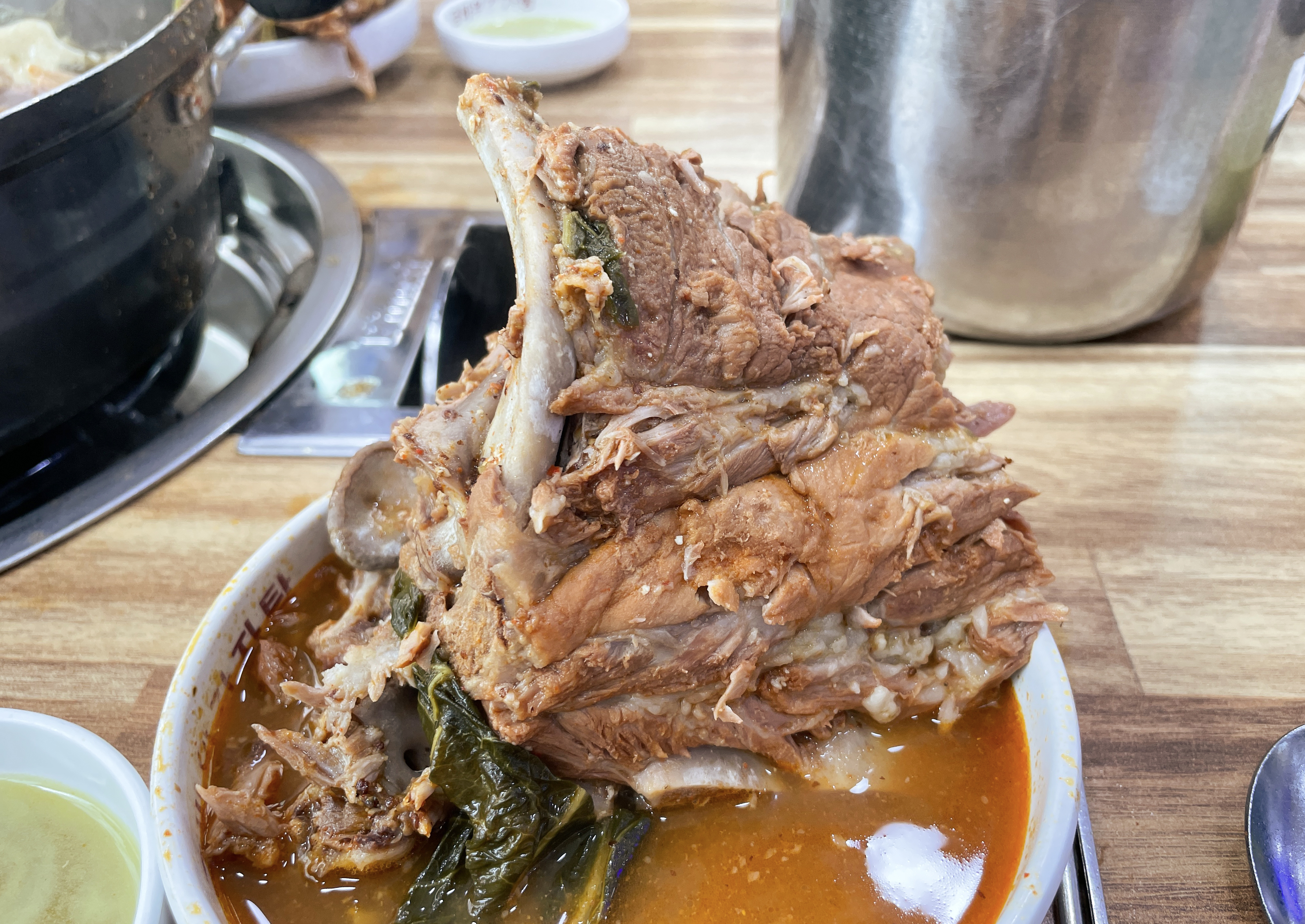 금바위감자탕의 감자탕이 어느 정도 끓었을 때 고기를 건져내서 먹었습니다. 감자탕의 고기는 큼직큼직해서 먹기에 좋았고, 앞서 설명한 것처럼 양도 넉넉해서 꽤 배불리 먹을 수 있었습니다. 국물의 간도 적당하고 맛도 좋아서 요즘같이 쌀쌀해지는 날씨에 먹기 참 좋은 메뉴였죠.