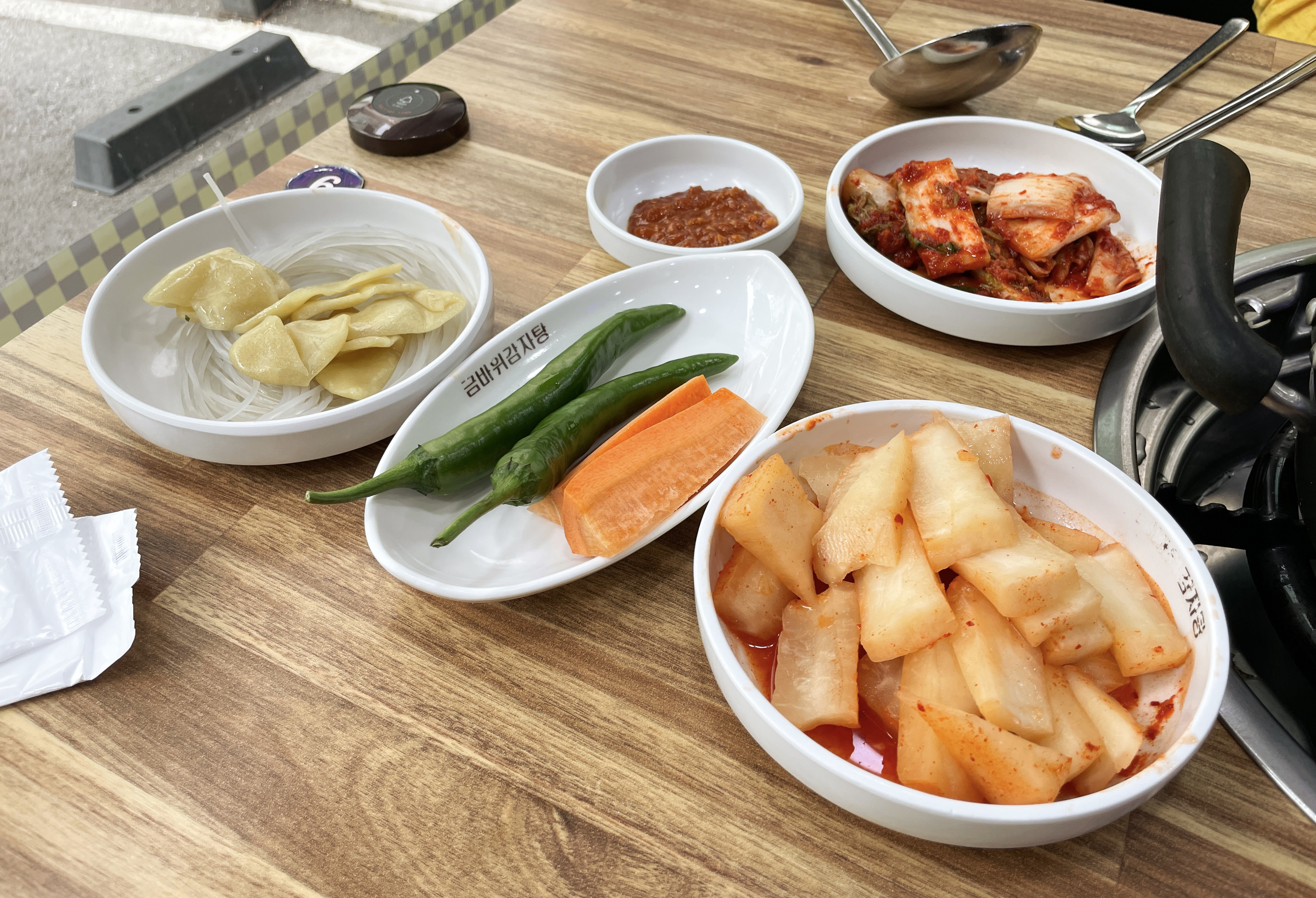 저는 금바위감자탕의 감자탕 중 자를 시켰습니다. 평소에 다닐때는 뚝배기에 제공되는 해장국을 주문했는데, 이 날은 부모님과 함께 식사하기 위해 전골메뉴인 감자탕을 주문했습니다. 금바위감자탕에서 기본적으로 제공되는 반찬은 당근과 고추, 배추김치, 깍두기가 제공되었고, 감자탕에 넣을 수제비와 당면이 함께 제공되었습니다.