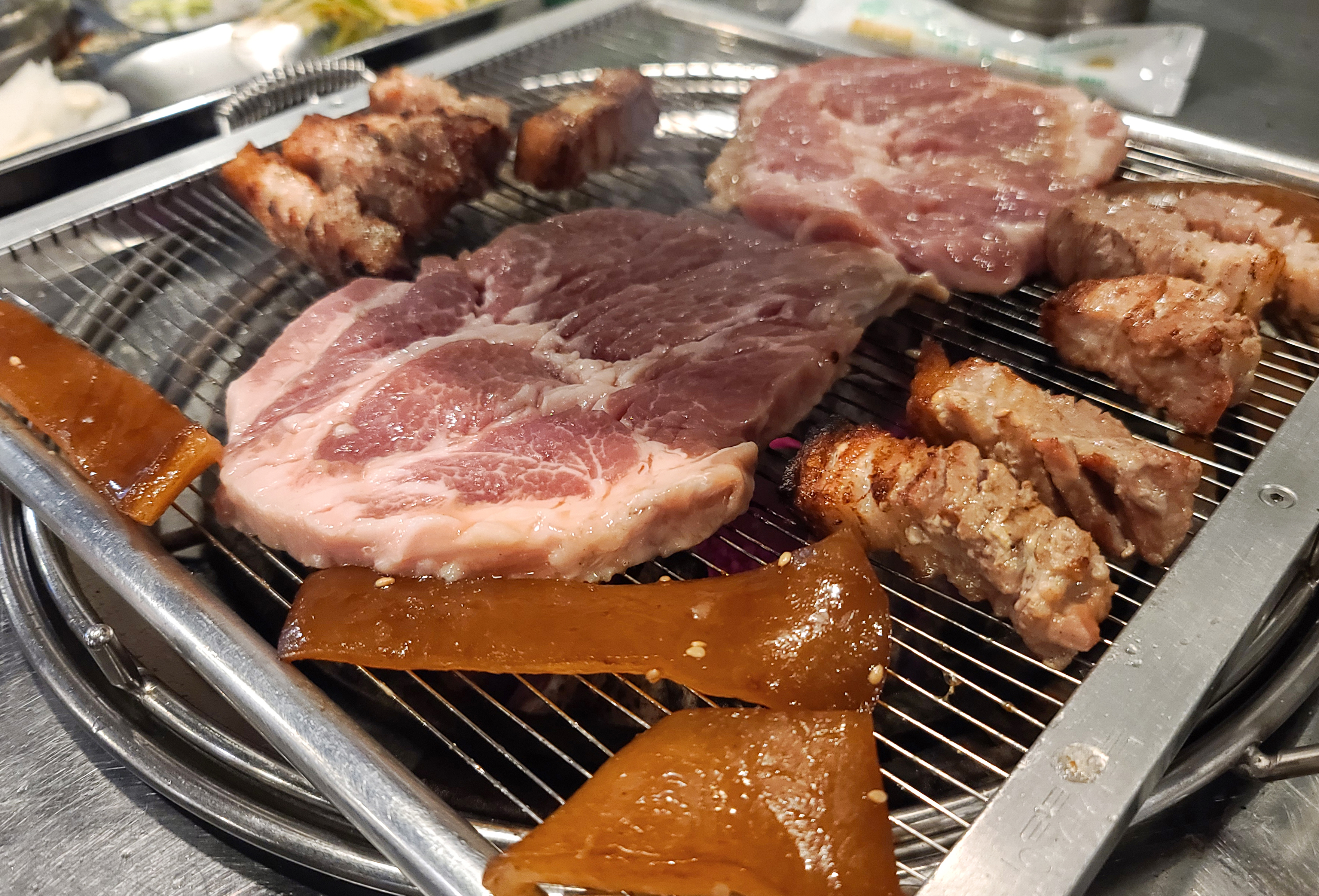 화로상회 고기의 모습입니다. 사진 위에서부터 삼겹살, 껍데기, 돼지갈비, 막창, 닭갈비 순입니다. 저는 개인적으로 고기 무한리필 가게라고 하면 특정 메뉴만 맛있고 나머지는 구색 갖추는 용으로 있는 메뉴라고 생각했는데, 화로상회의 고기를 실제로 불판위에 구워보면 나름대로 다 맛있더라고요.