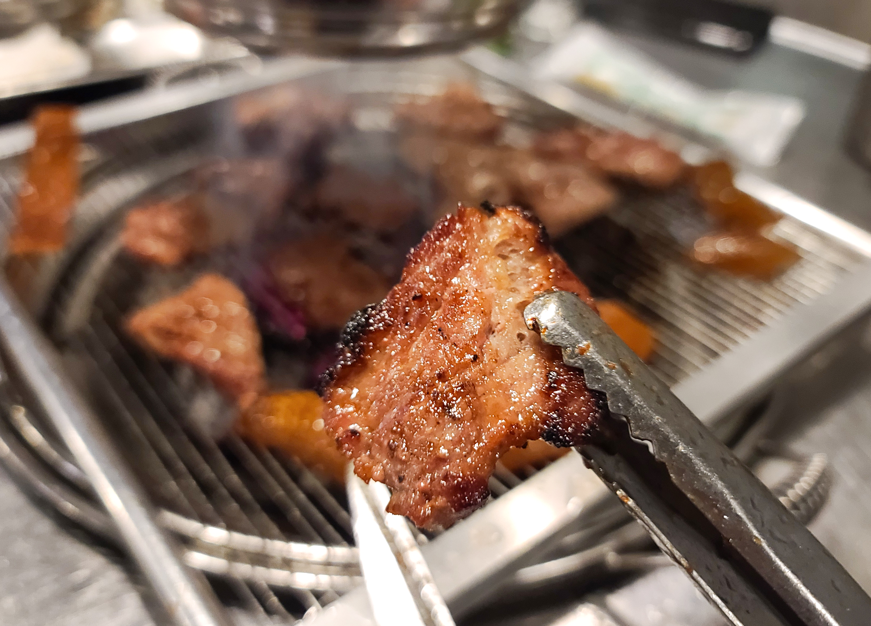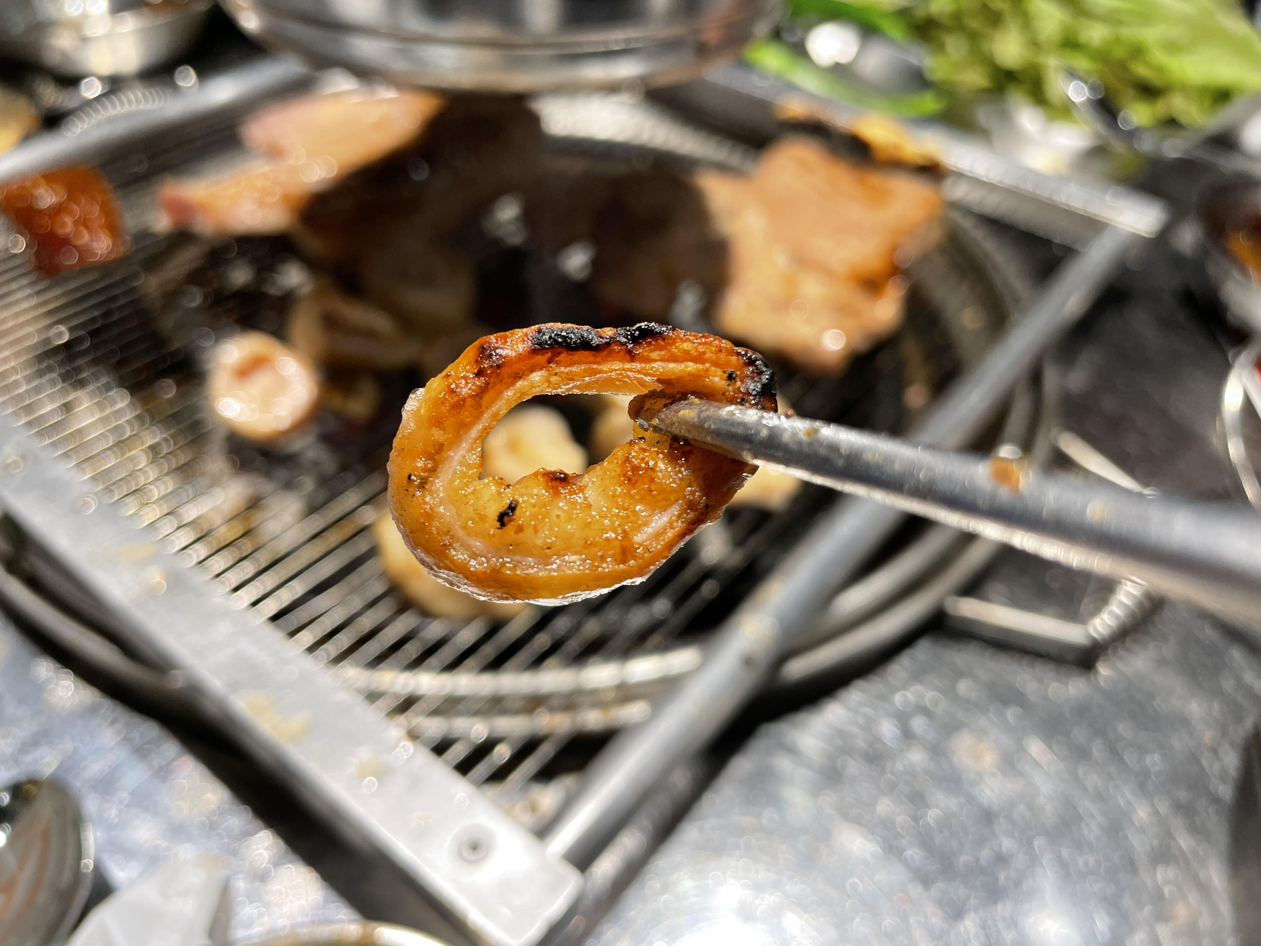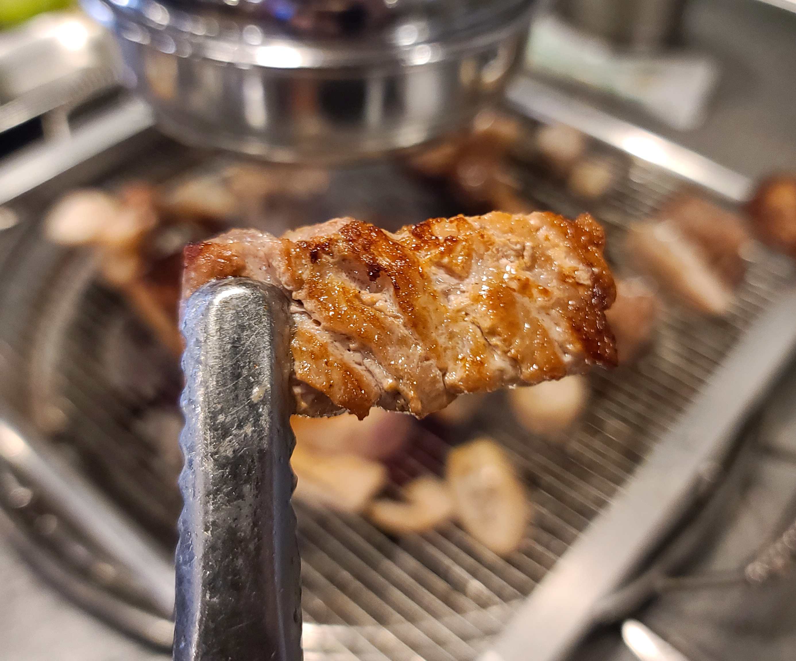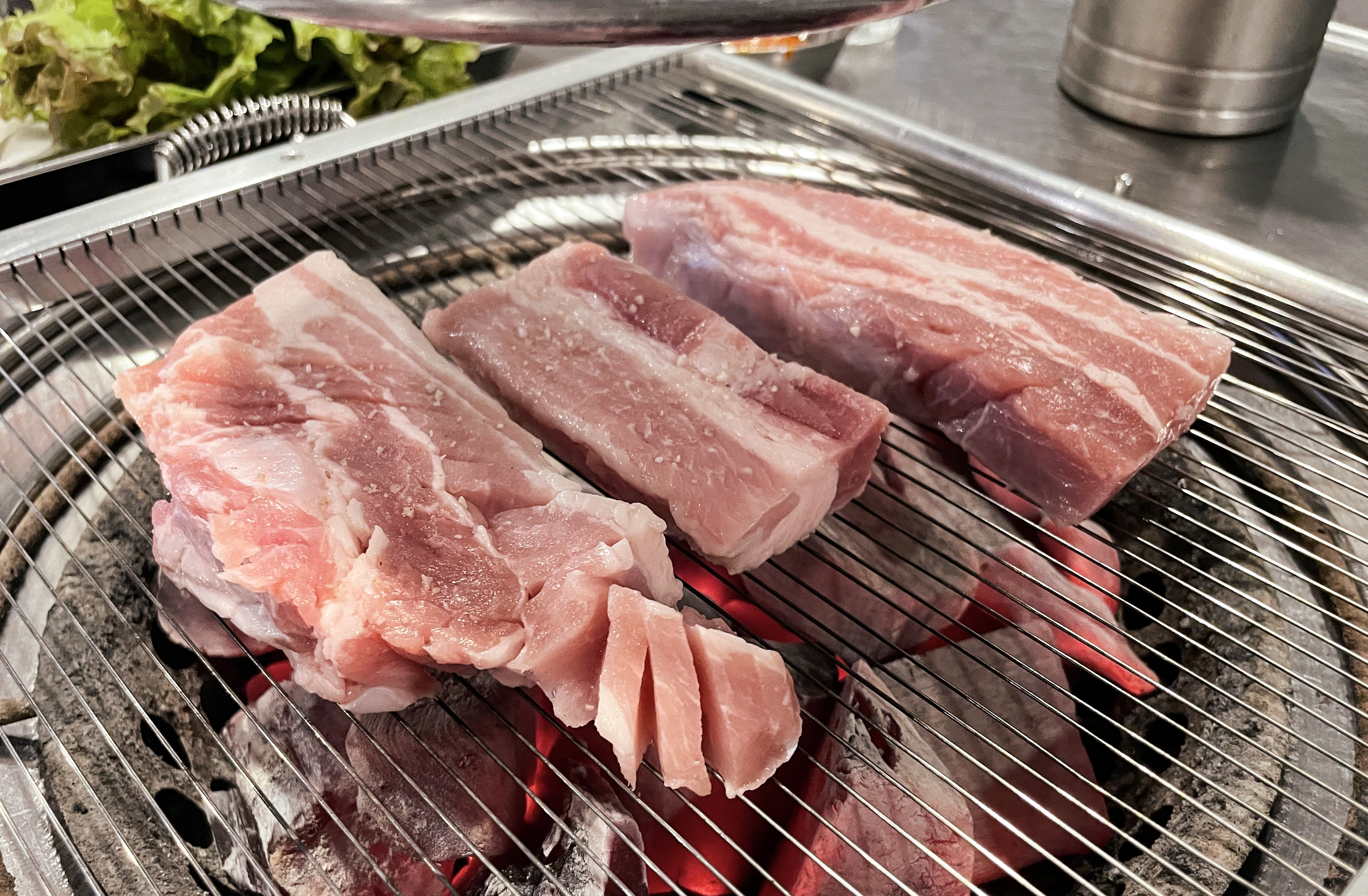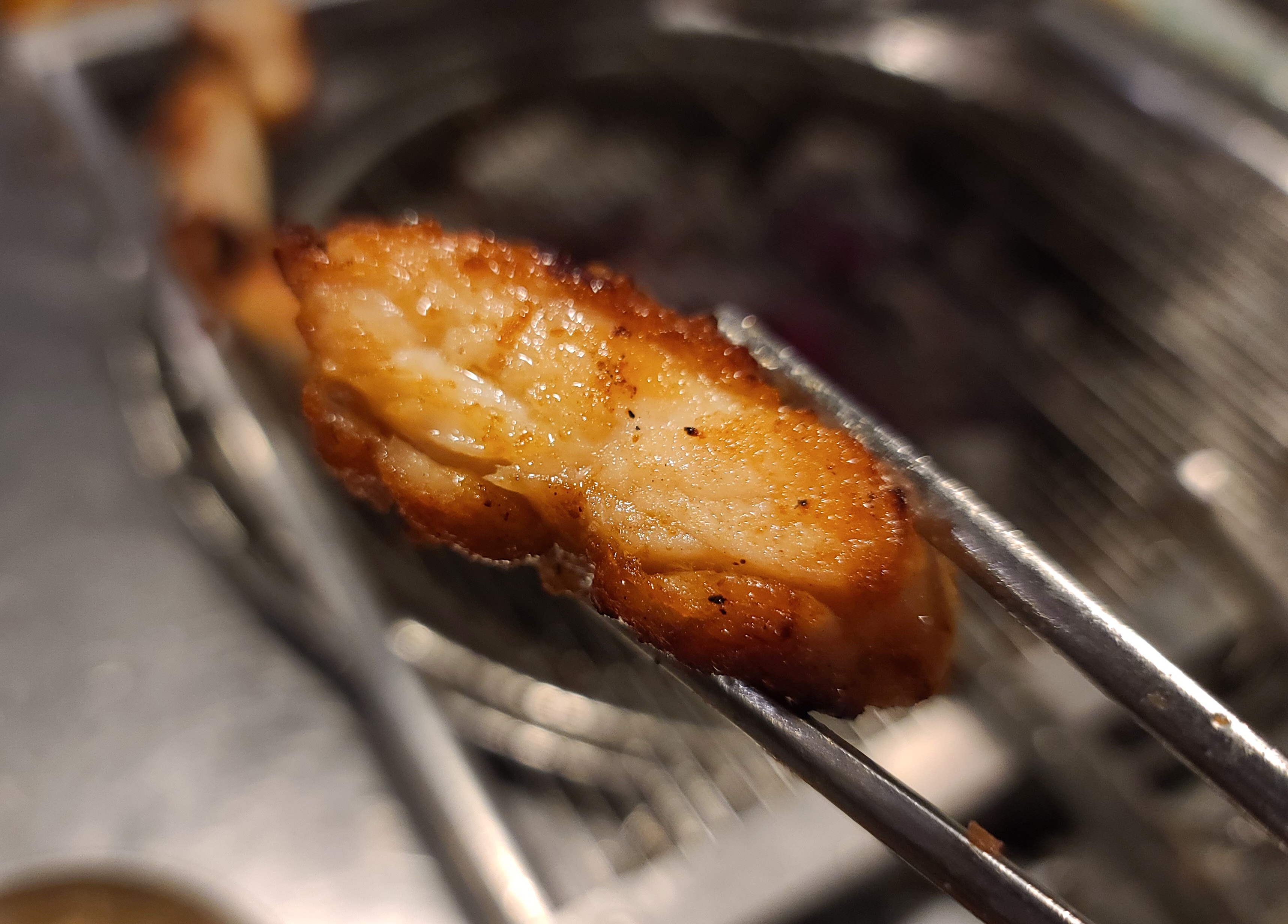 화로상회의 칼집을 낸 도톰한 두께의 삼겹살은 숯불에 익혀서 그런지 느끼하지도 않고, 숯불 향이 잘 배어들어 맛있었습니다. 화로상회를 처음 이용했을 때는 "고기 무한리필 가게인데 어떻게 이런 맛이 나와?" 하면서 놀랐습니다. 실제로 먹어보면 직원들이 직접 구워주는 프리미엄 고깃집과 비슷한 맛에 감탄할 수밖에 없겠더라고요.
