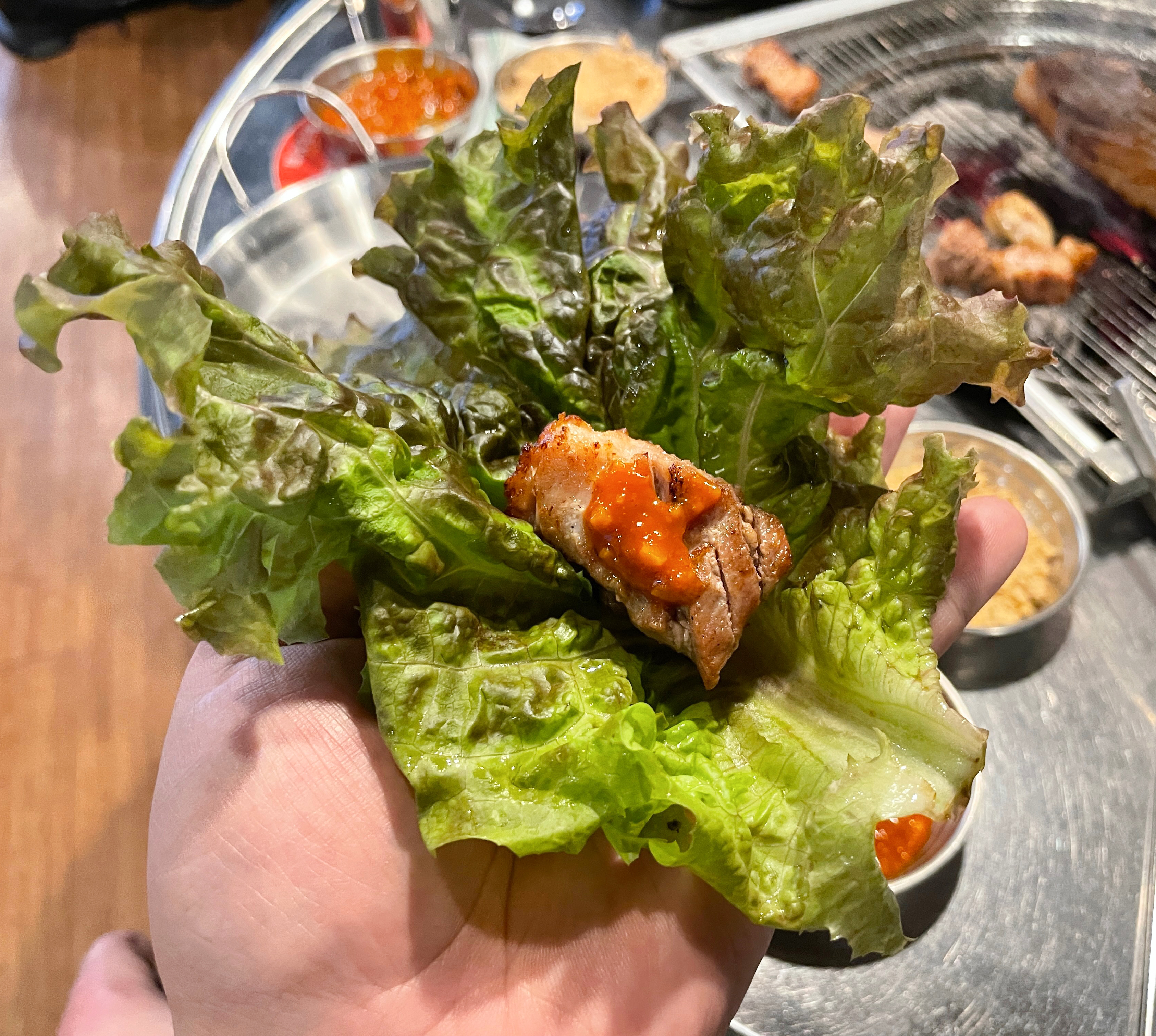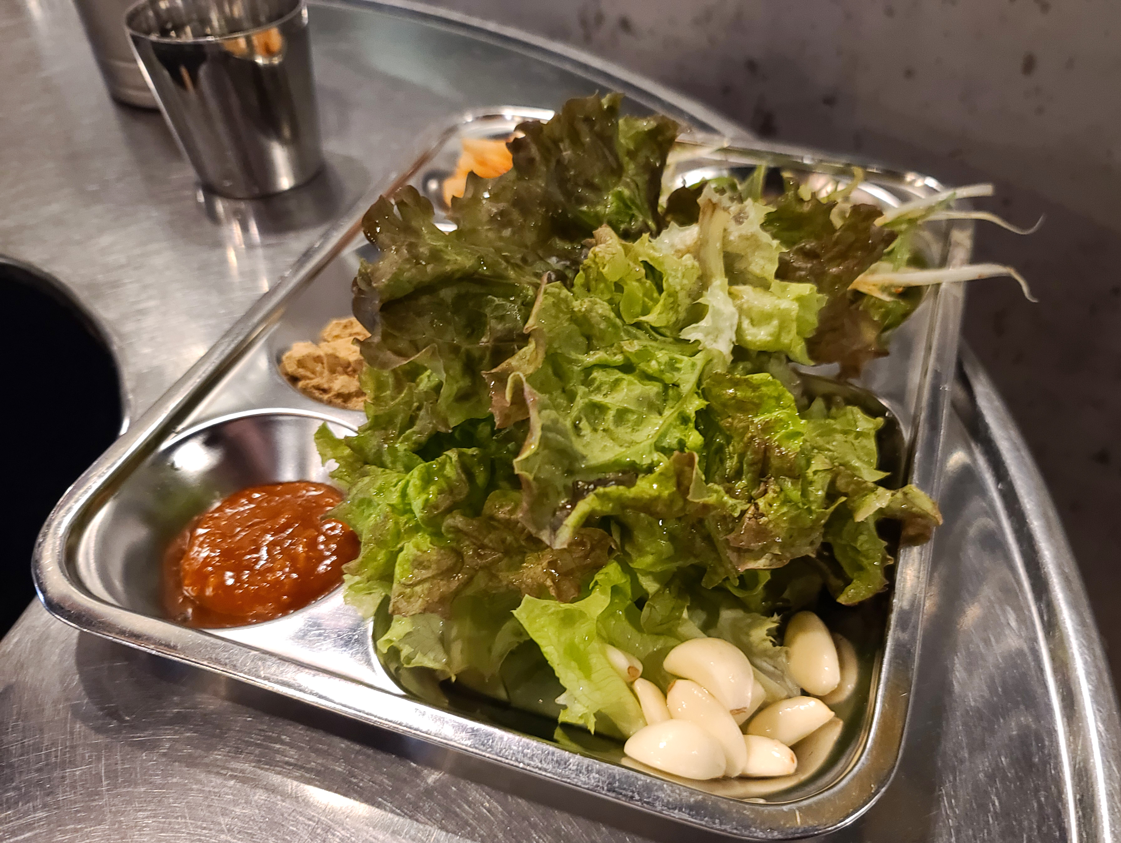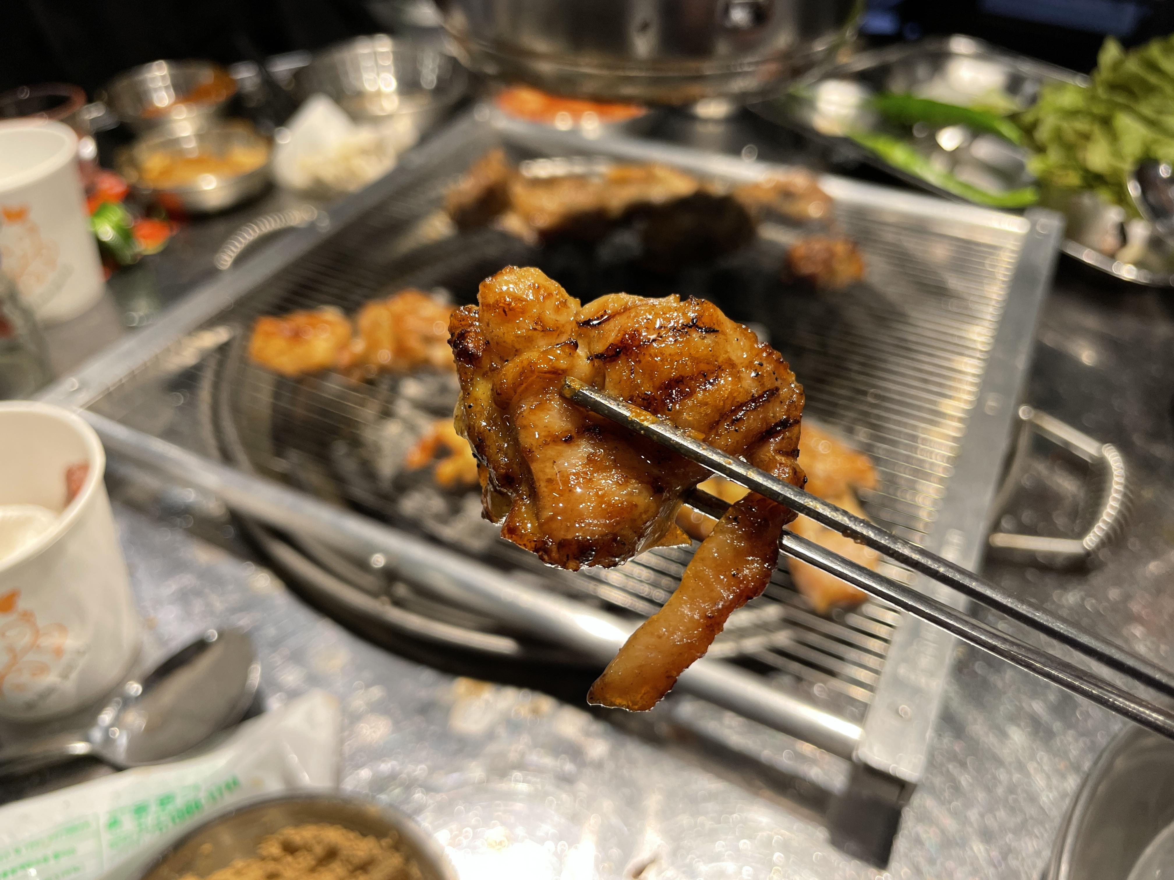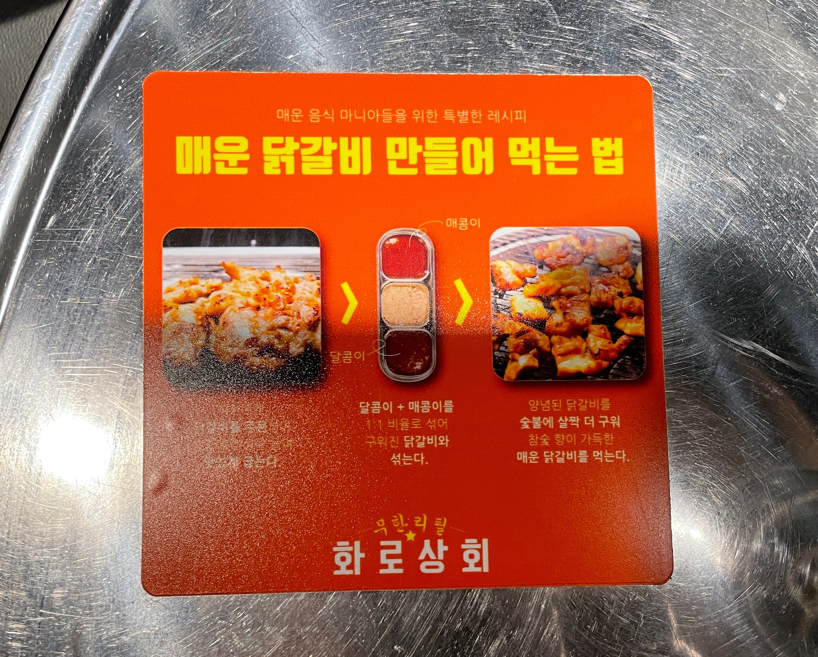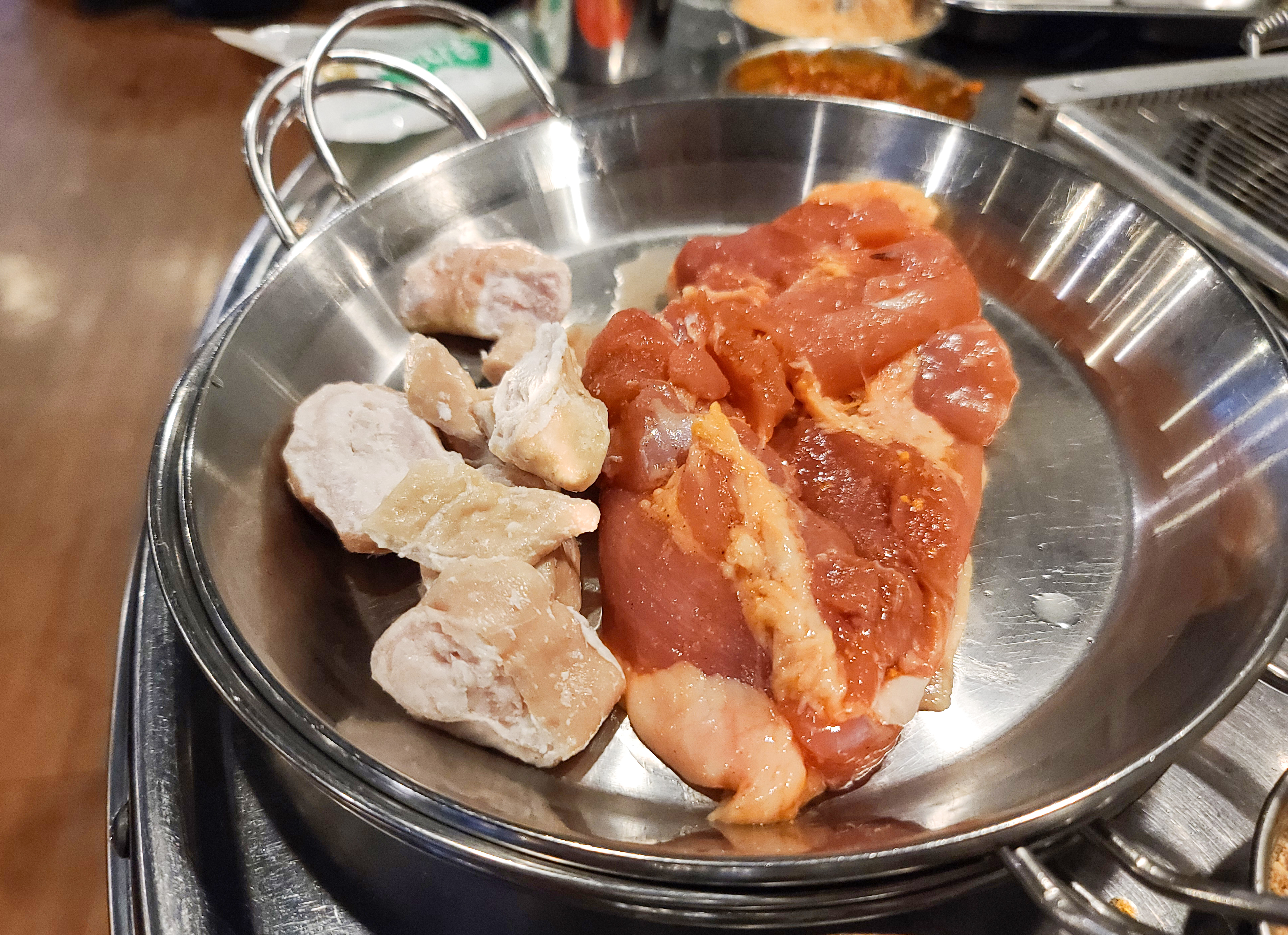 화로상회 숯불 닭갈비는 솔직히 말해서 고기 식감이 좀 별로더라고요. 삼겹살이나 돼지갈비는 고기 질감이 잘 느껴져서 좋았는데, 닭갈비는 퍼석한 식감이 별로 좋지는 않더라고요. 제가 흔히 먹던 닭고기 같은 식감은 아니어서 좀 이질감이 있었고, 양념은 잘 배어들어 양념 맛은 괜찮더라고요.