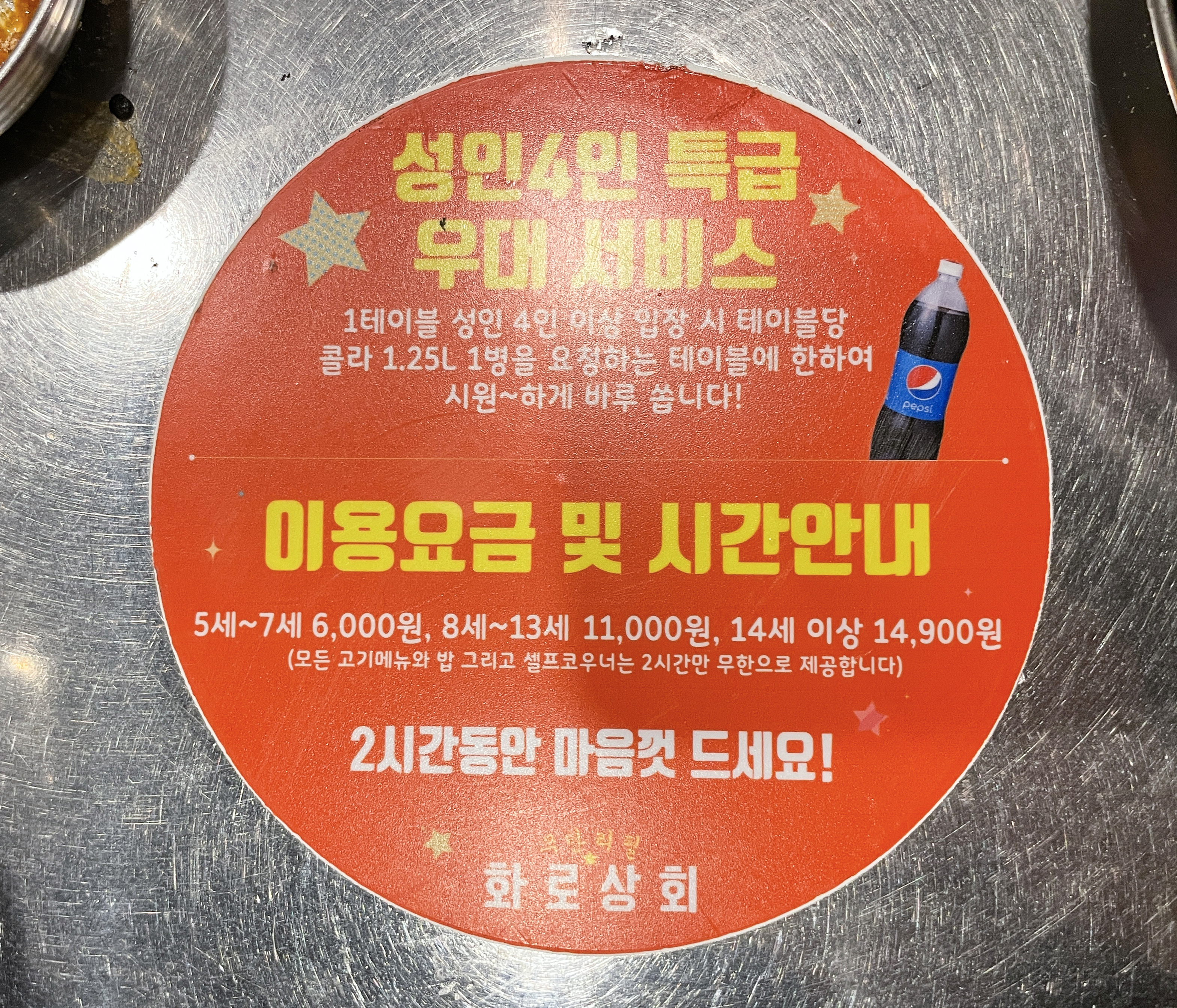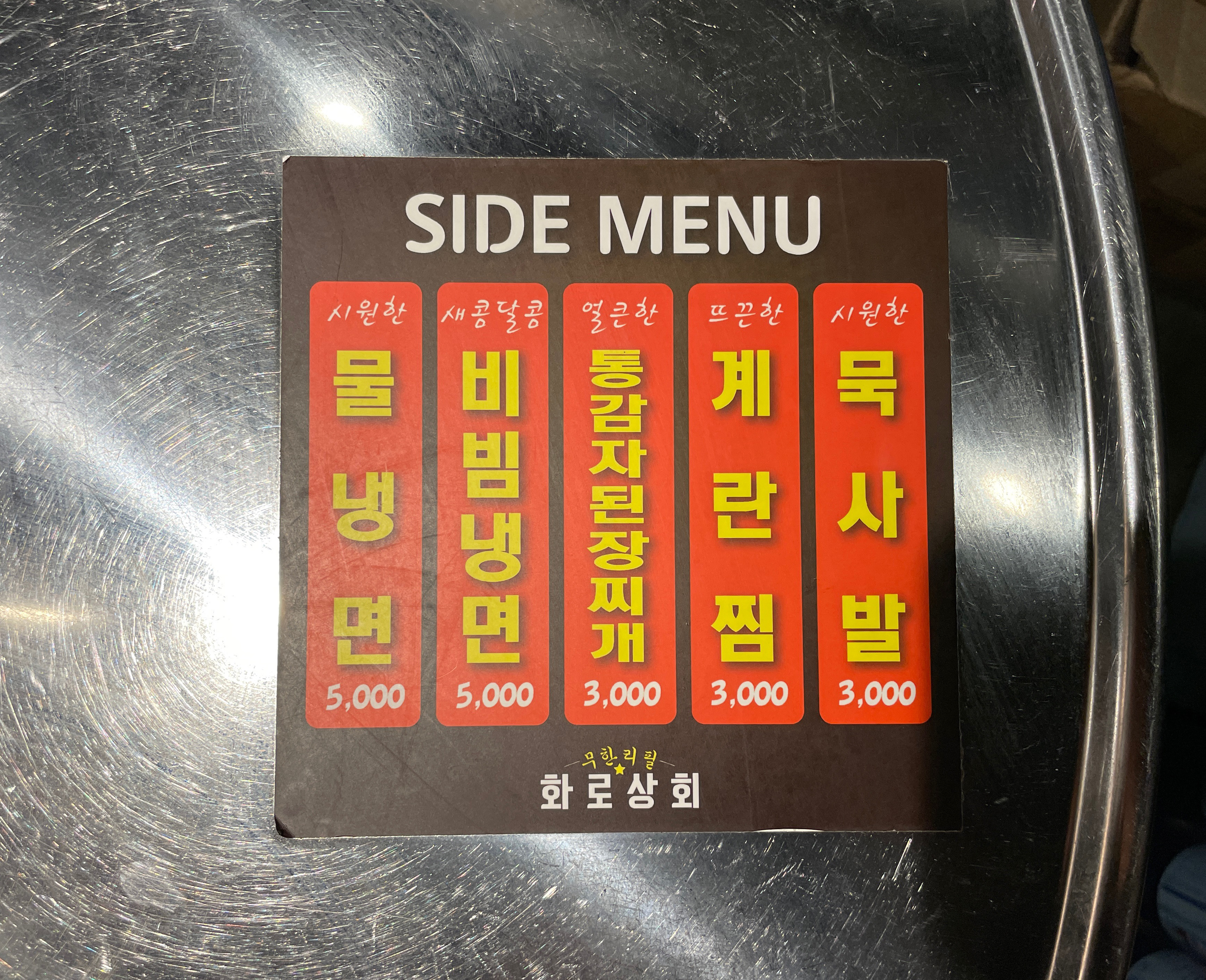 화로상회를 처음 알게 된 것은 인터넷으로 식당을 찾아보다가 우연히 알게된 가게인데, 고기 무한리필 가게인데 의외로 맛도 있고 만족스럽게 이용해서 신구대점 > 가락시장역점 > 서울대점 순으로 이용해보았습니다. 화로상회는 1인 14,900원으로 이용이 가능합니다. 그밖에 사이드 메뉴로 물냉면, 비빔냉면, 통감자된장찌개, 계란찜, 묵사발이 있었습니다.