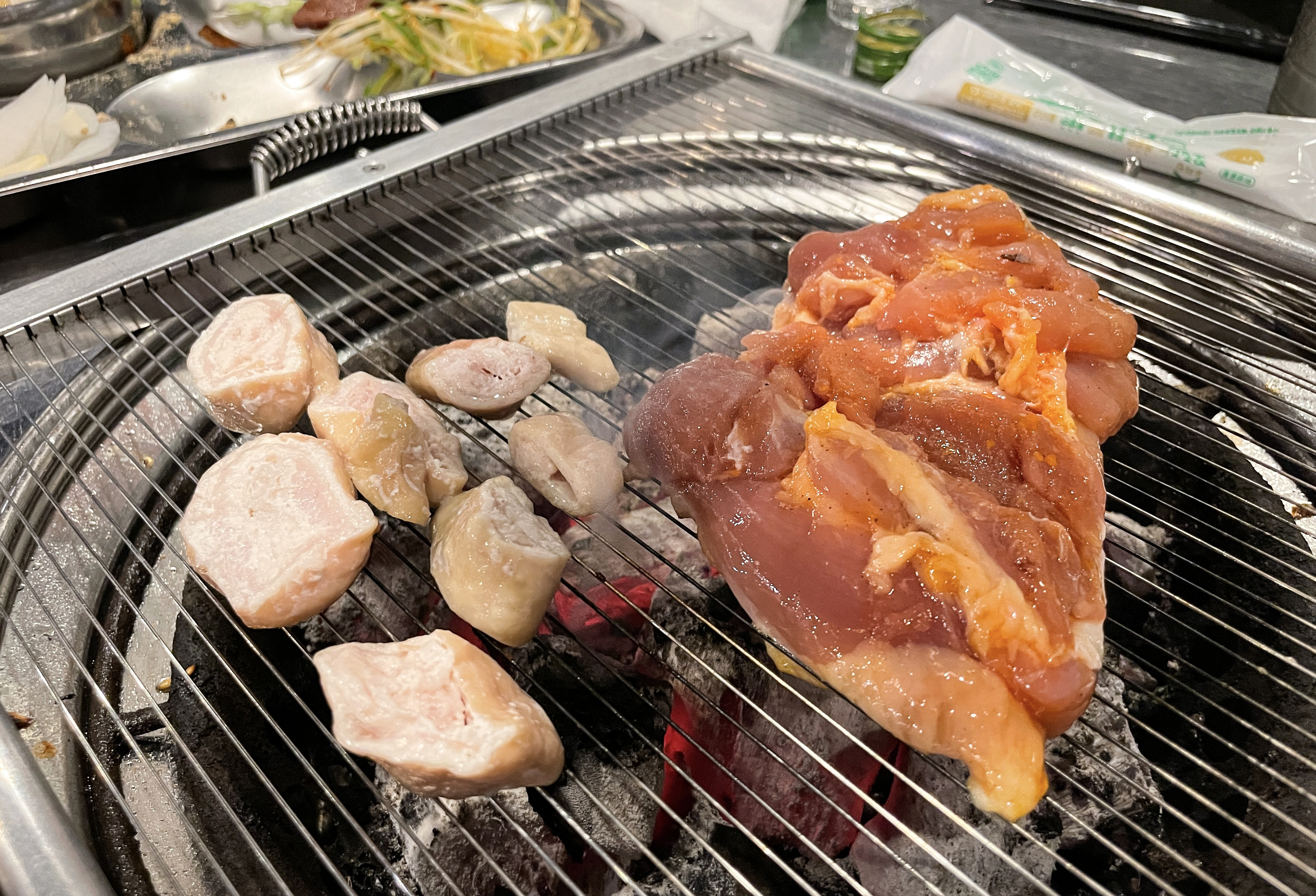 화로상회 숯불 닭갈비는 솔직히 말해서 고기 식감이 좀 별로더라고요. 삼겹살이나 돼지갈비는 고기 질감이 잘 느껴져서 좋았는데, 닭갈비는 퍼석한 식감이 별로 좋지는 않더라고요. 제가 흔히 먹던 닭고기 같은 식감은 아니어서 좀 이질감이 있었고, 양념은 잘 배어들어 양념 맛은 괜찮더라고요.
