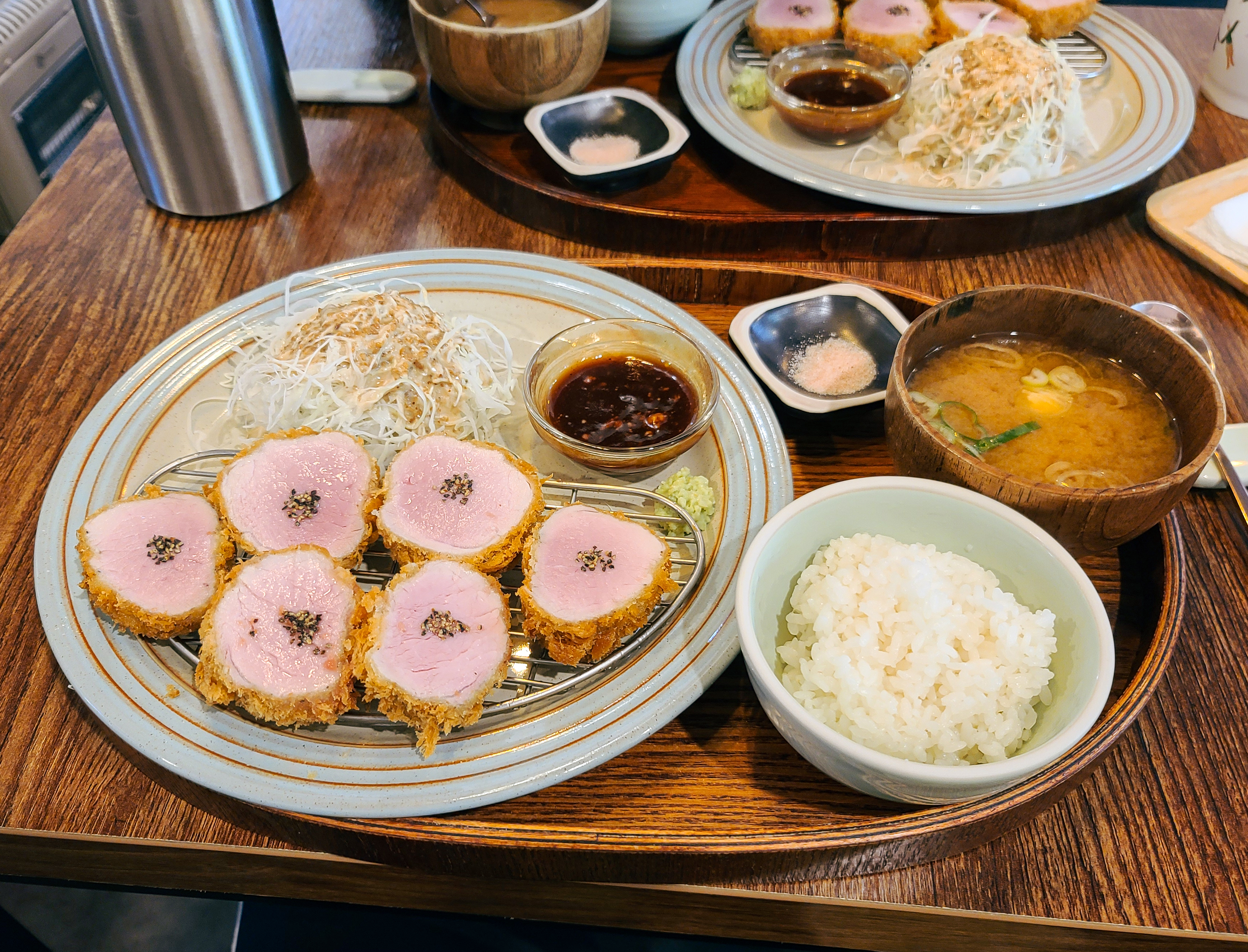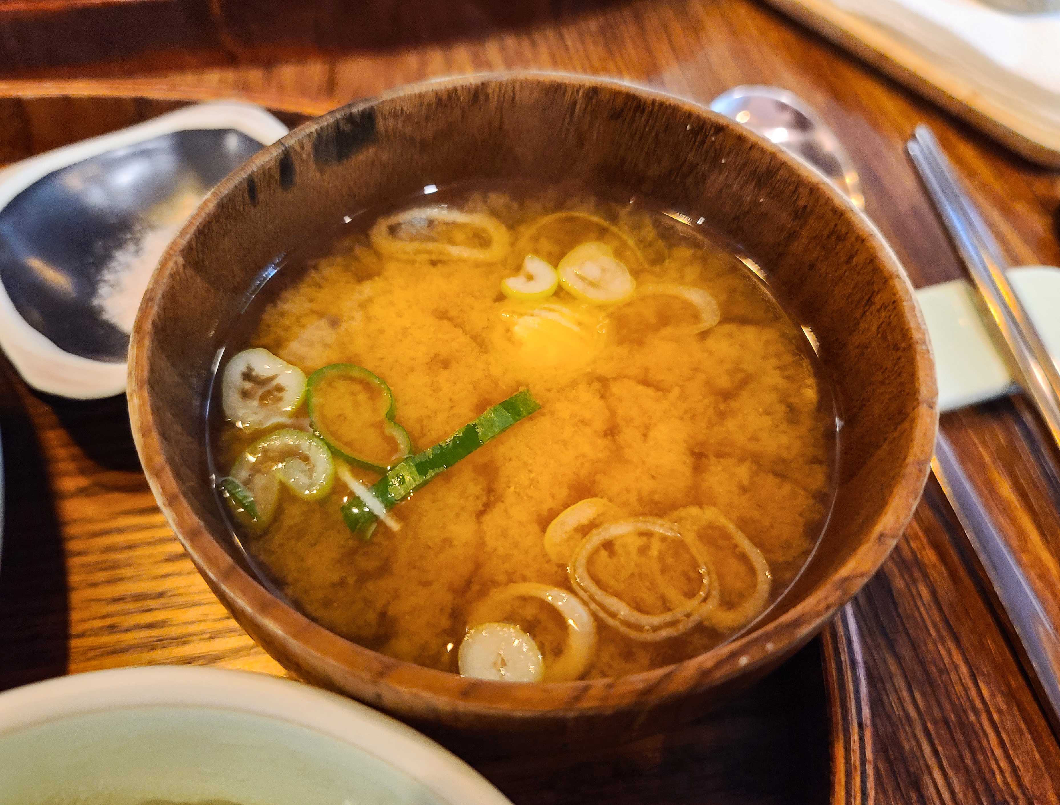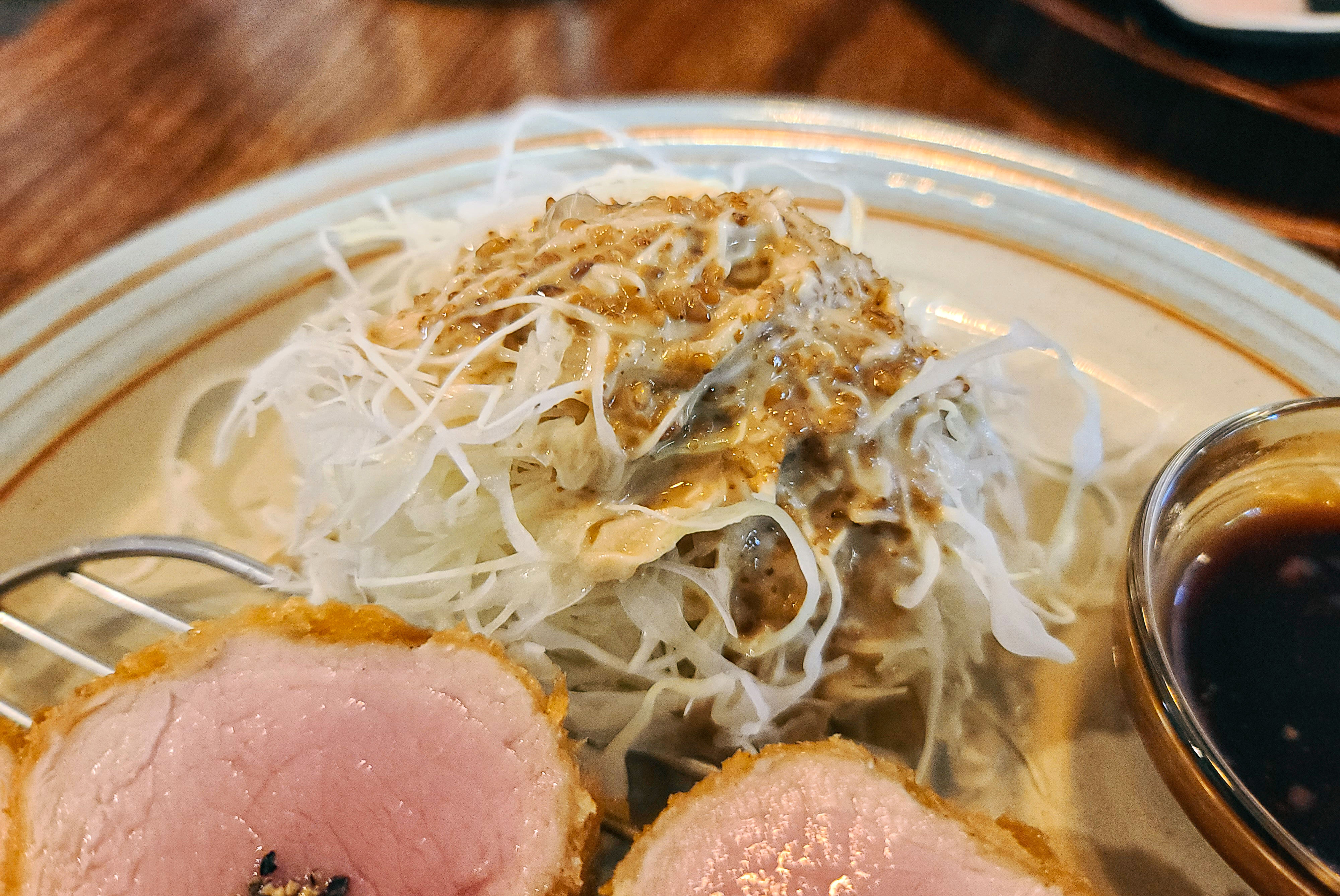 테이블 위에 수저받침과 함께 식기류를 제공해주었고, 돈까스는 참깨 드레싱을 얹은 양배추 드레싱과 두부를 작게 썰어 넣은 미소 된장국이 함께 제공되었습니다.