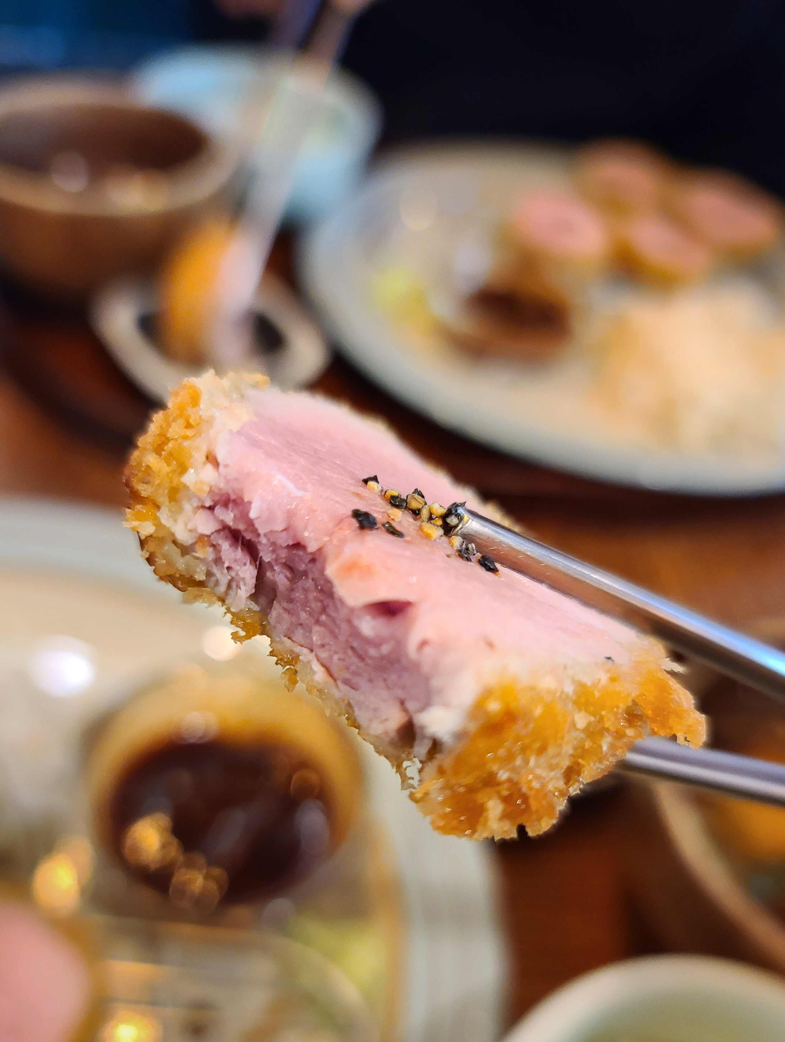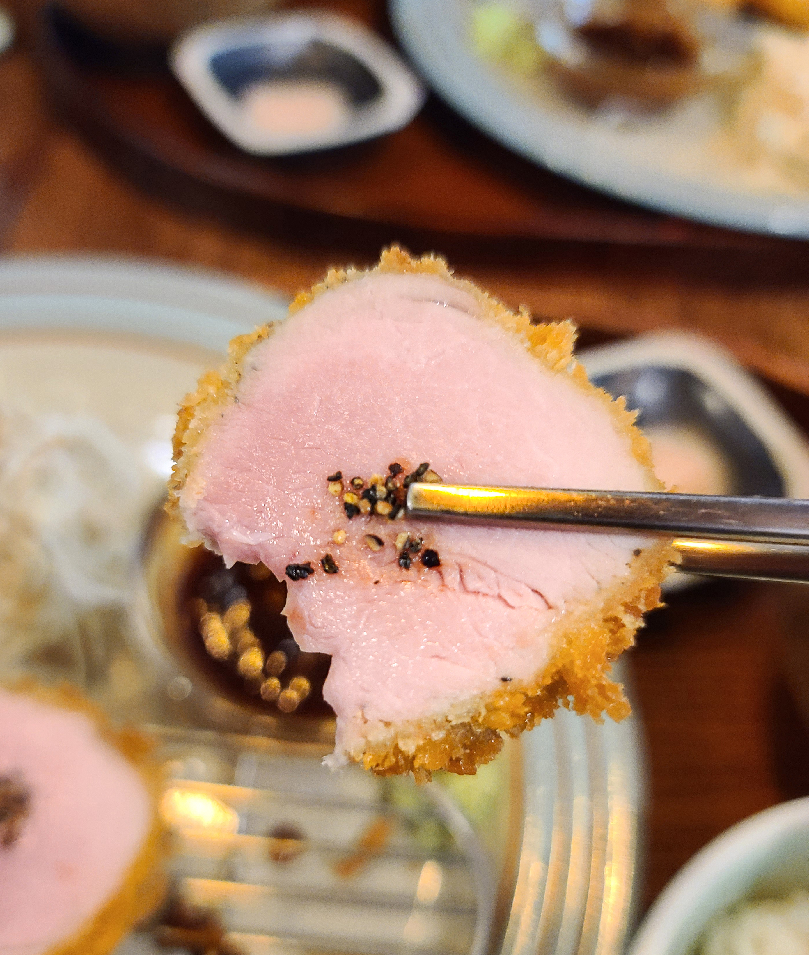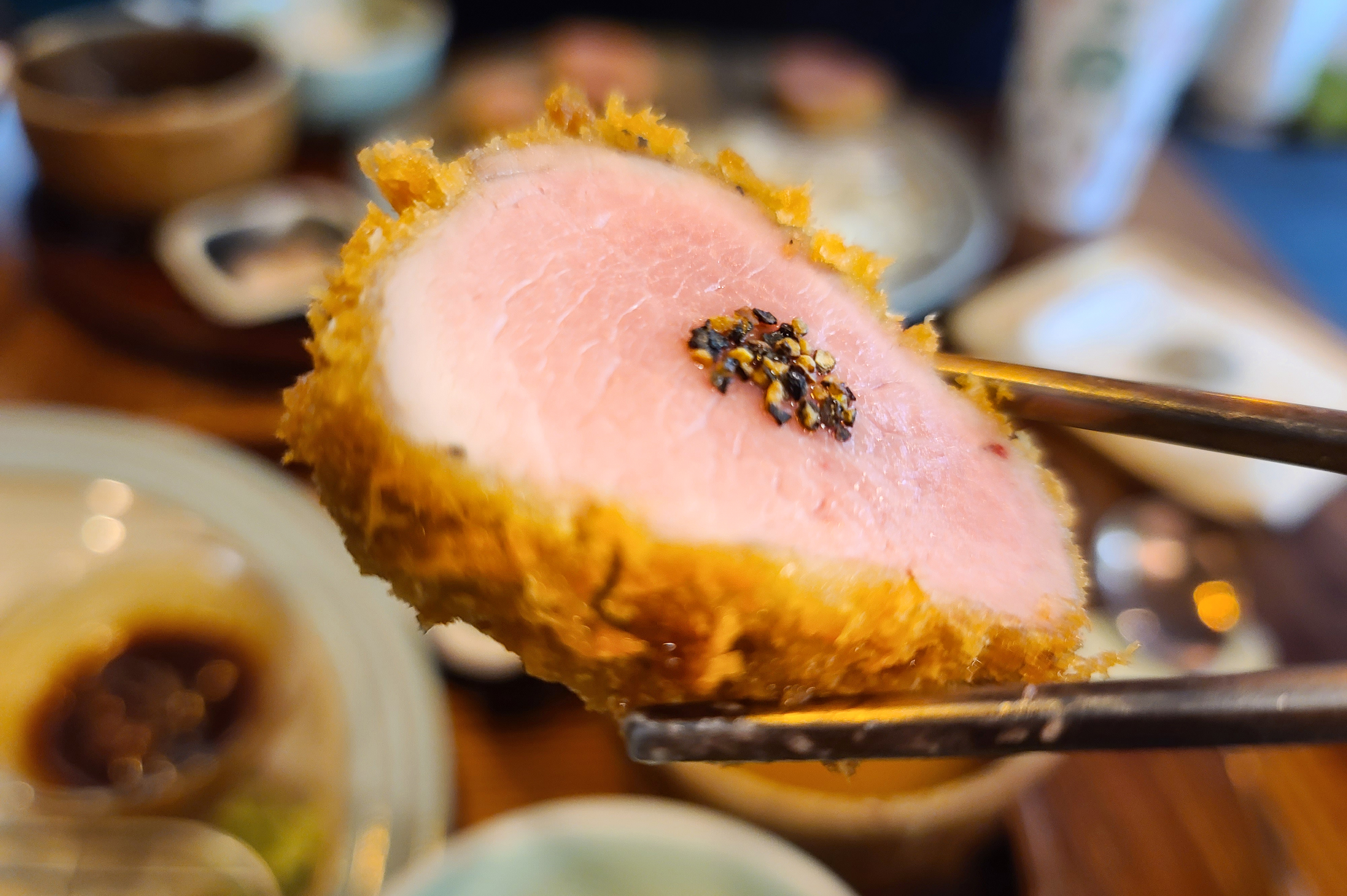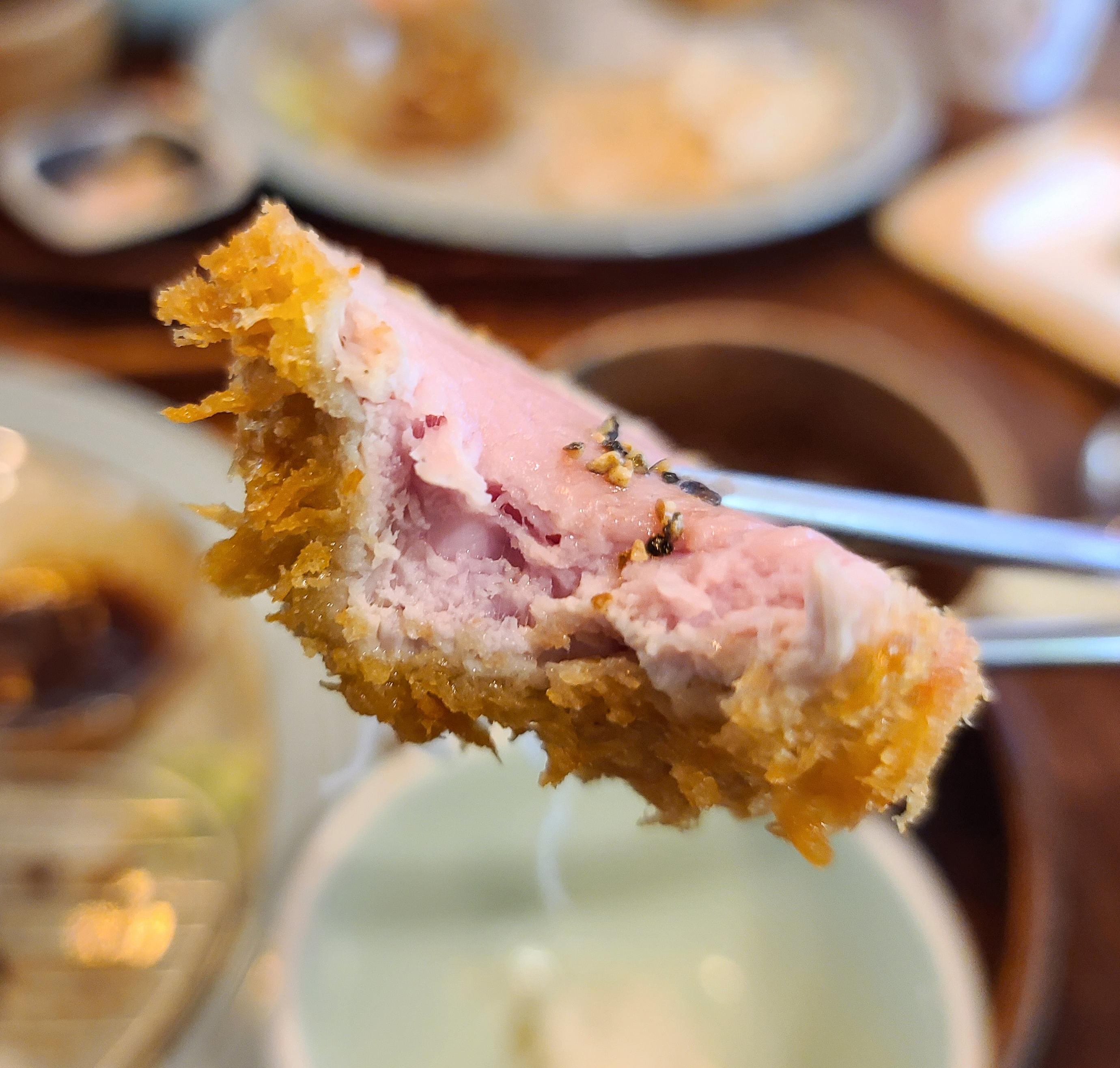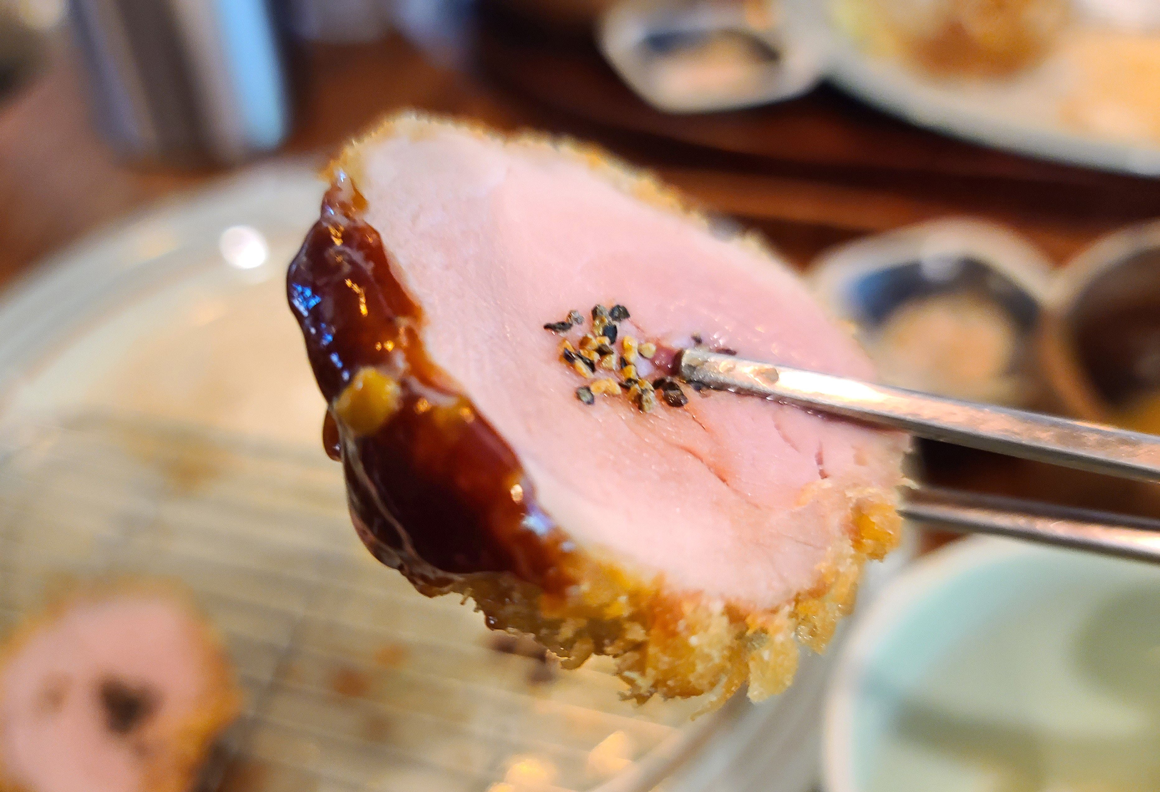 실제 돈까스를 들어 먹어보면 선홍빛을 띠고 있었는데, 식감은 이제껏 먹어본 돈까스 식감 중에 가장 부드러웠던 것 같습니다. 거의 두부나 치즈를 먹는 것처럼 씹히는 돈까스는 육즙도 가득해서 맛이 좋았습니다.