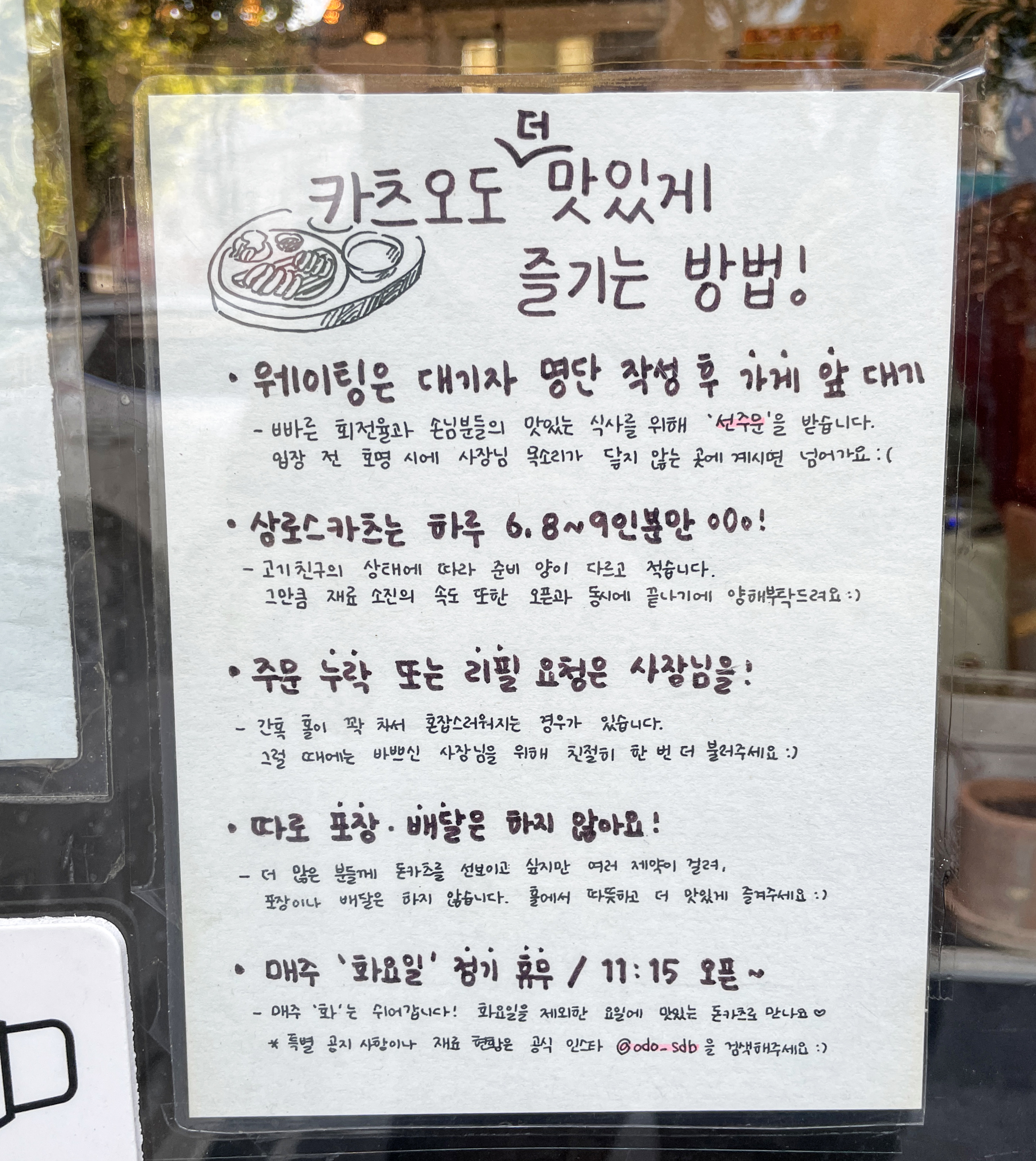 신대방역과 가까이 위치해 있으며, 돈까스를 먹기 위해 무려 7번이나 시도했던 가게입니다. 가게 영업시간은 오전 11시 15분부터 오후 9시까지로 되어있지만, 이미 점심시간 조금 지나면 판매완료되어 영업시간만 보고 방문했다가 허탕 치기 일쑤였습니다.