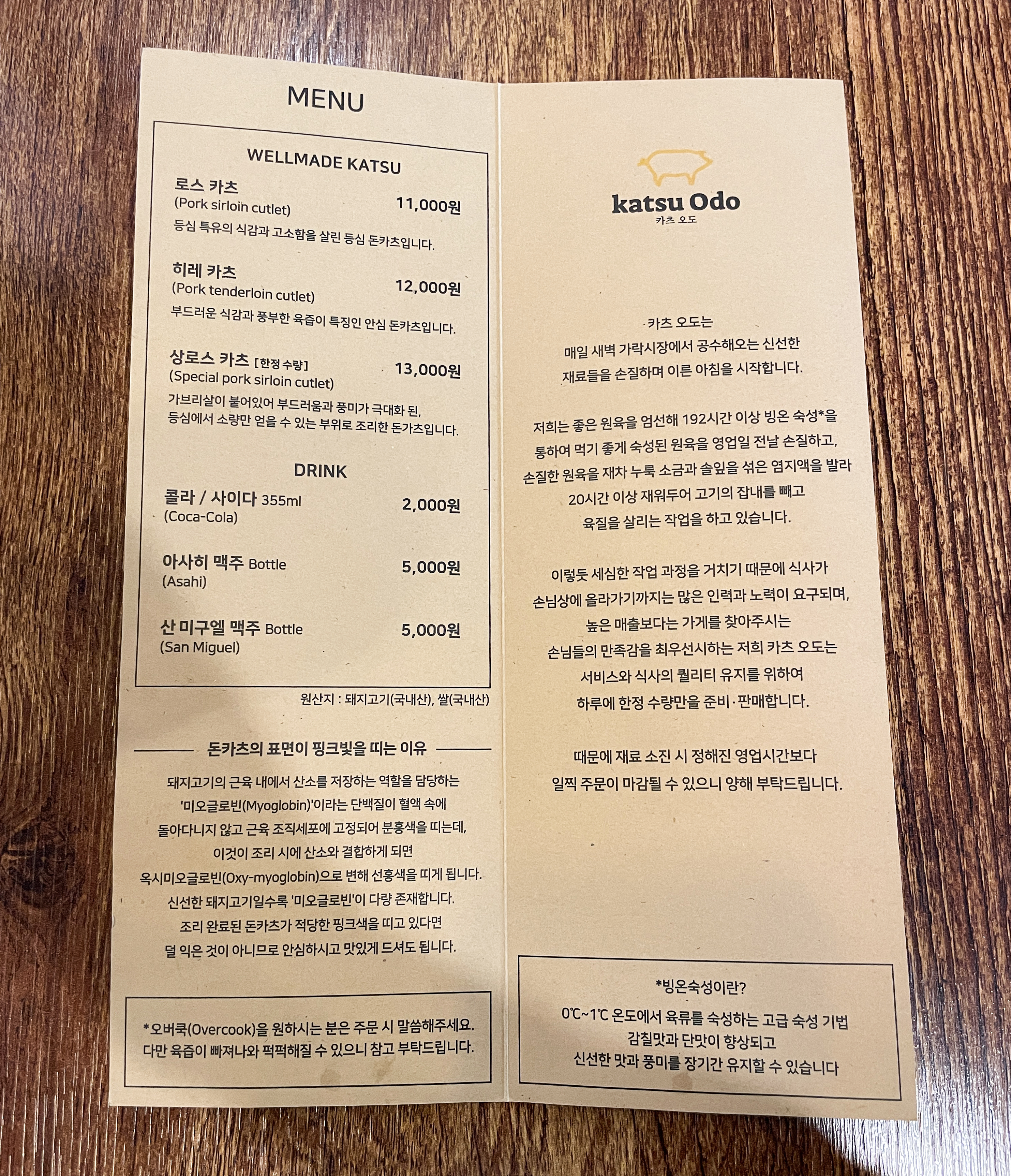 카츠오도의 메뉴는 이렇습니다. 로스카츠, 히레카츠, 상로스카츠 이렇게 세가지만 판매하고 있으며, 카츠오도는 매일 새벽 가락시장에서 공수해오는 신선한 재료들을 손질하여 아침을 시작하고, 좋은 원육을 엄선해 192시간 빙온 숙성을 통해 먹기 좋게 숙성된 고기를 누룩 소금과 솔잎을 섞은 염지액을 발라 20시간 이상 재워두어 고기의 잡내를 빼내고 육질을 살리는 작업을 한다고 합니다. 아무래도 판매하는 고기에 정성이 들어가다 보니 영업시간 전에 재료가 소진되는 경우가 많다고 합니다.
