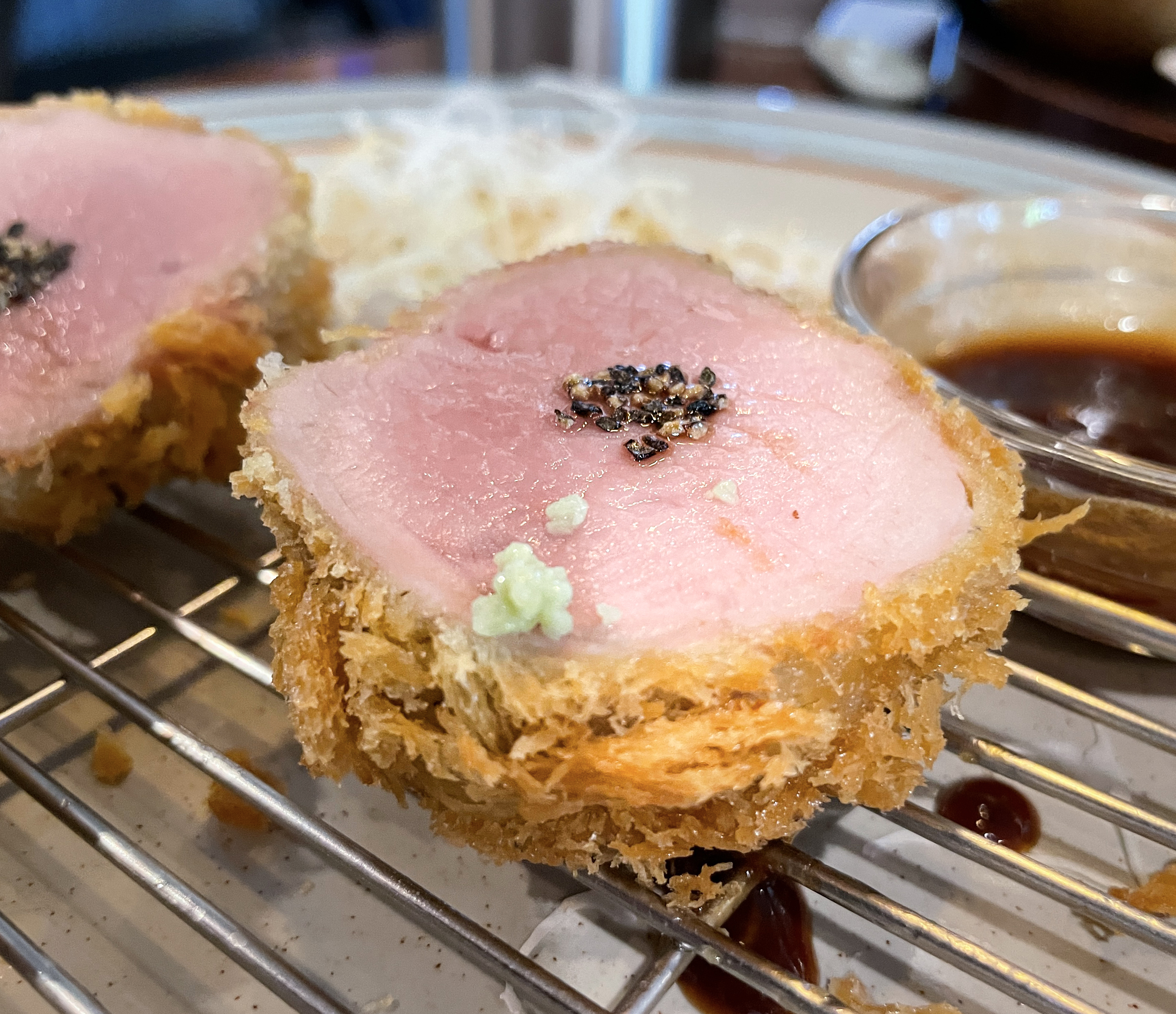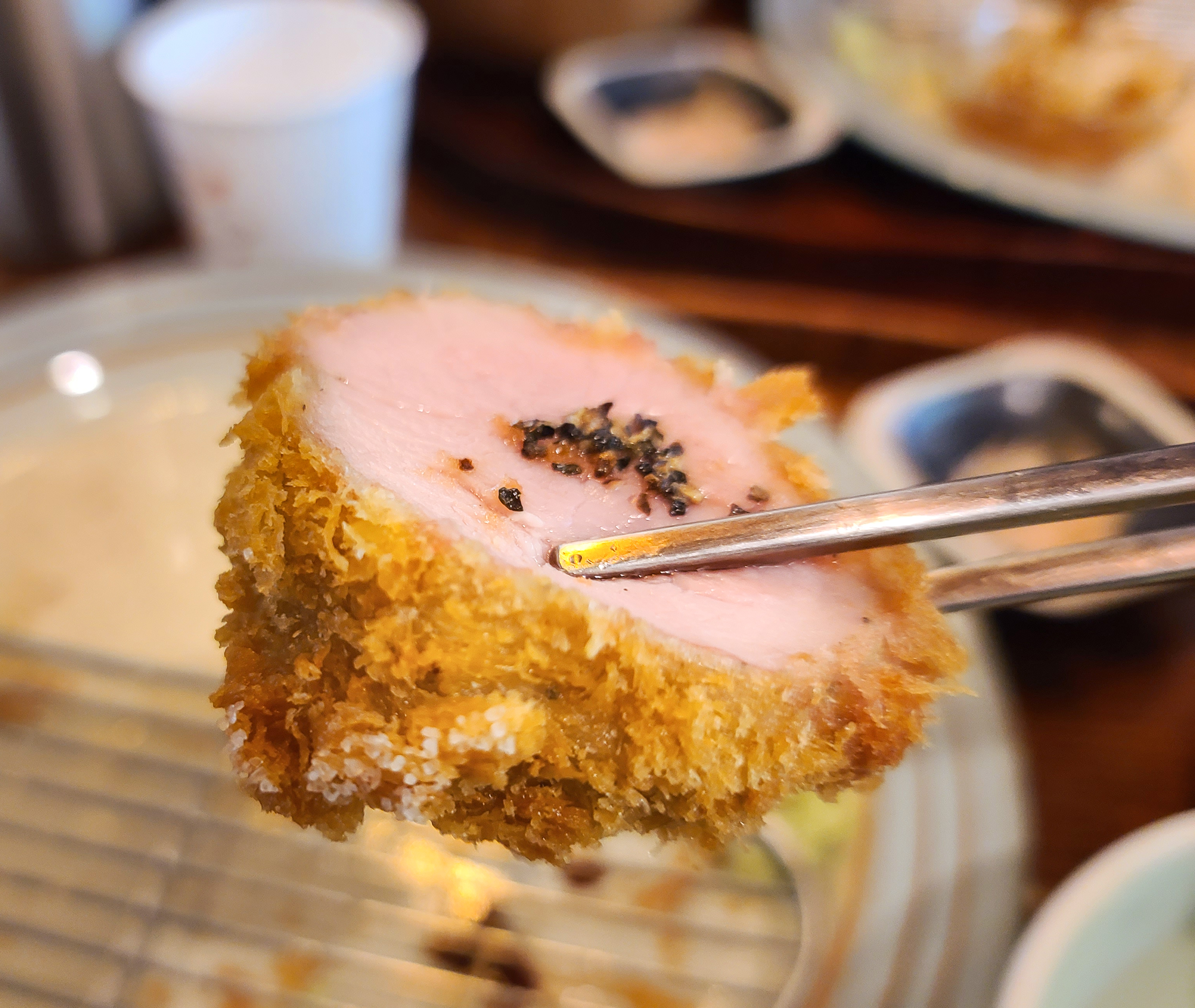 돈까스는 고기 원육이 좋아서 소스에 찍어먹어도 맛있었지만, 소금이나 고추냉이만 곁들여도 충분히 맛이 좋았습니다. 부드러운 식감과 육즙은 정말 어디서도 따라올 수 없을 것 같더라고요. 다만 튀김옷은 일반적인 빵가루를 사용하는지 원육에 비해 고급스러운 느낌은 안들더라고요.