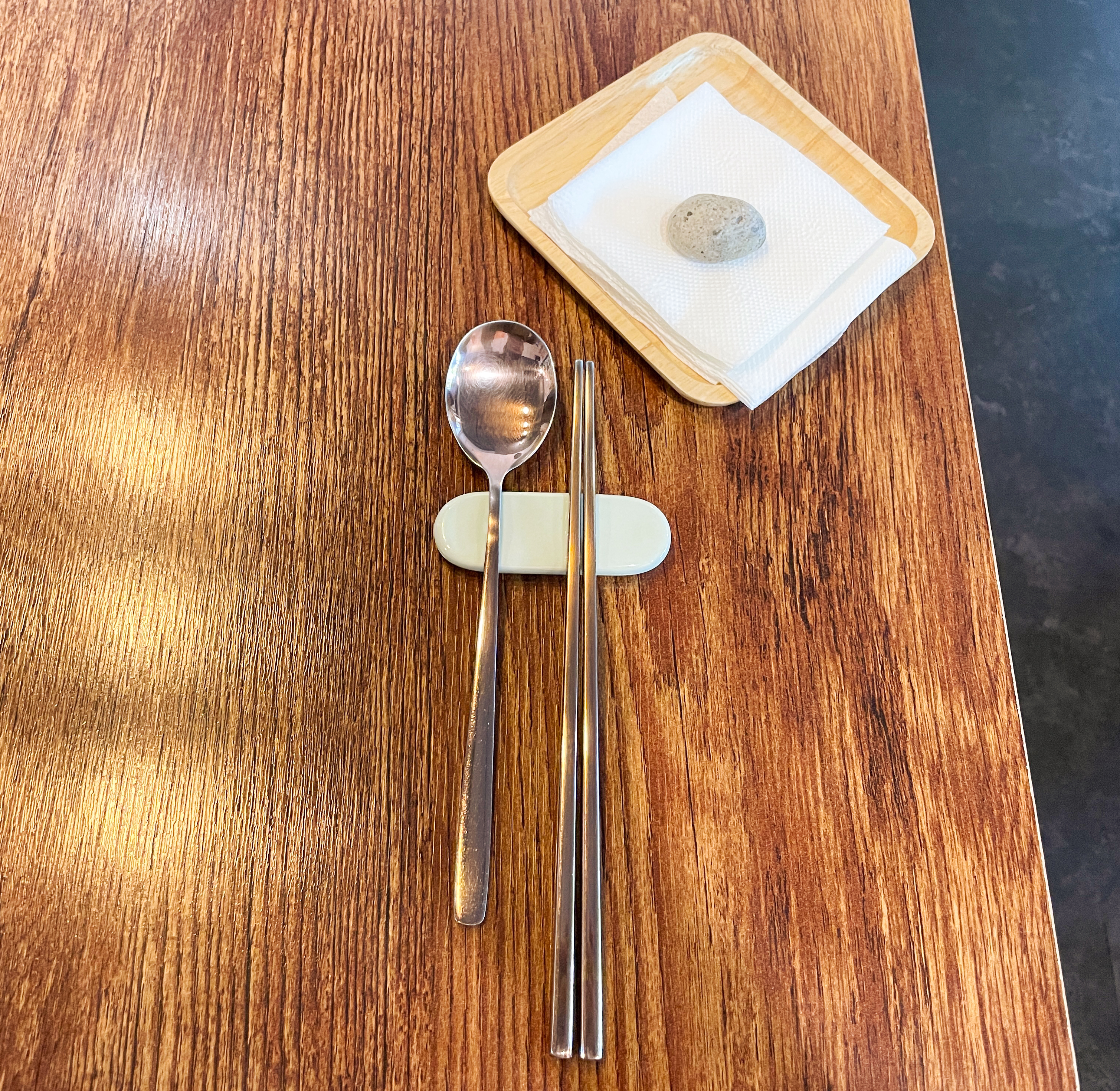 테이블 위에 수저받침과 함께 식기류를 제공해주었고, 돈까스는 참깨 드레싱을 얹은 양배추 드레싱과 두부를 작게 썰어 넣은 미소 된장국이 함께 제공되었습니다.