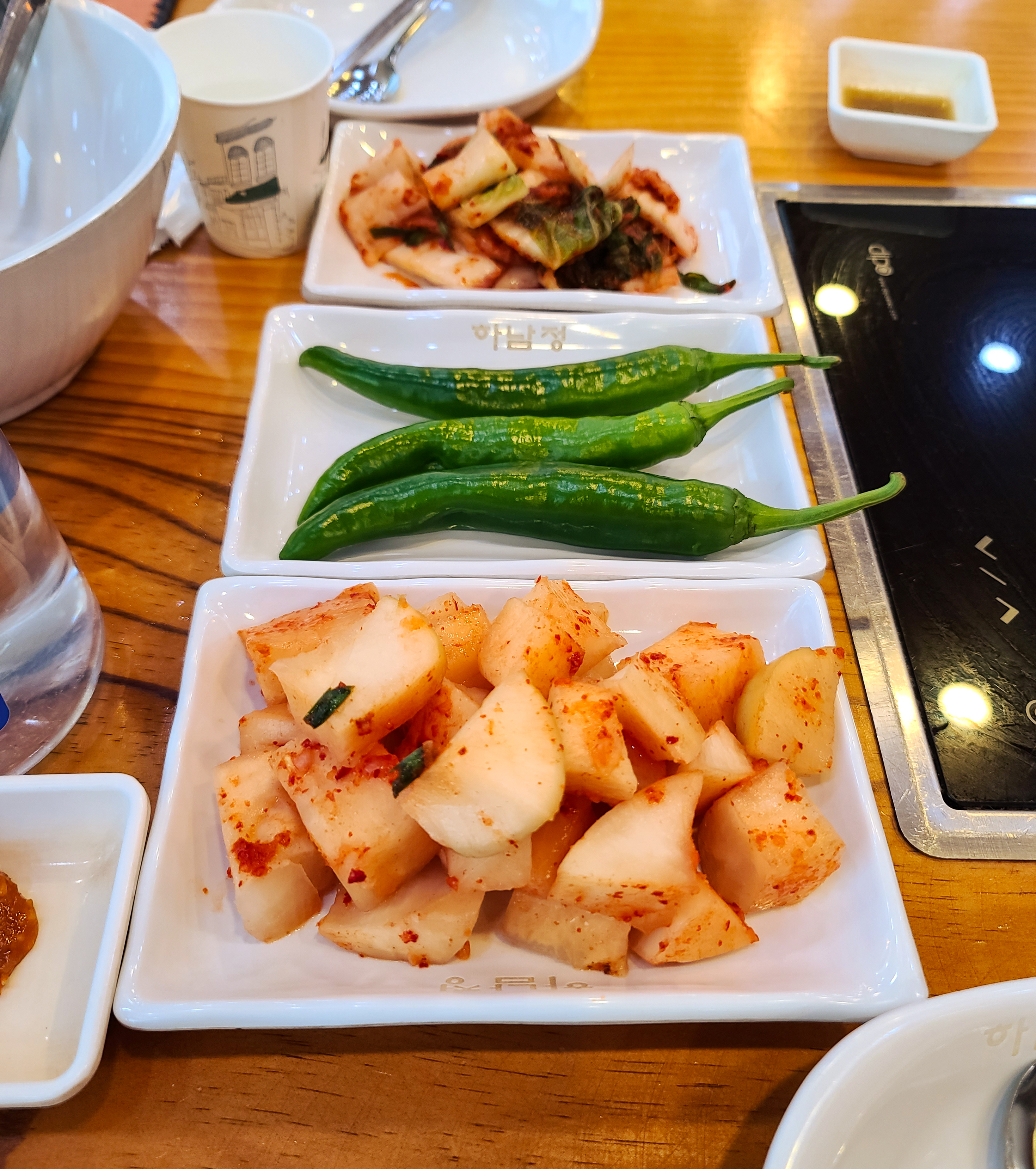 저희가 주문한 하남정의 감자탕은 깍두기, 배추김치, 고추와 함께 나왔습니다. 감자탕의 색깔은 제가 평소에 즐겨먹던 감자탕들 보다는 색이 많이 옅어 보이더라고요. 사실 겉보기에는 맛있어 보이지는 않아서 기대를 안 했는데, 먹다 보니 맛있어서 결국에는 국물까지 다 먹게 되더라고요.