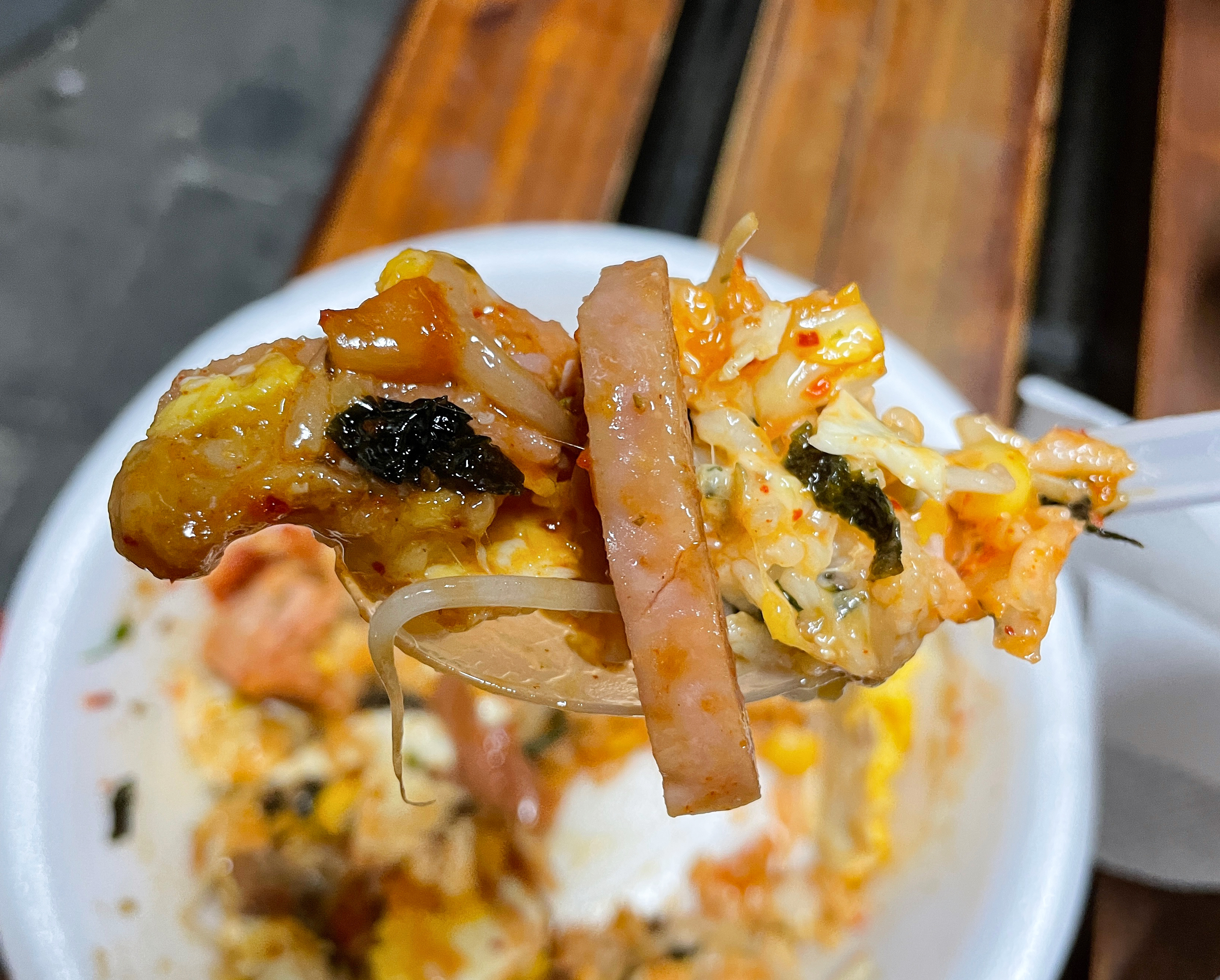 컵밥에 김가루도 들어있고 달걀프라이와 햄, 삼겹살 등이 들어가 맛있었습니다. 달리 생각하면 마요네즈도 들어가고 삼겹살도 들어가고, 햄, 기름 등이 들어가니까 조금 느끼하다고 생각도 들었습니다. 볶음 김치나 삼겹살의 경우 미리 만들어져 있던 거라 조금 뻣뻣하거나 식어서 아쉬웠지만 3천 원대의 메뉴라는 점을 감안한다면 다양한 재료들이 들어가 푸짐한 게 좋았습니다. 이 외에도 컵밥거리에 다양한 메뉴들을 판매하는 노점들이 있으니 다양한 메뉴들을 시도해보시는 것도 괜찮을 것 같습니다.